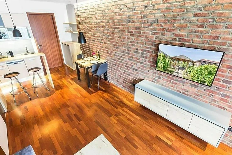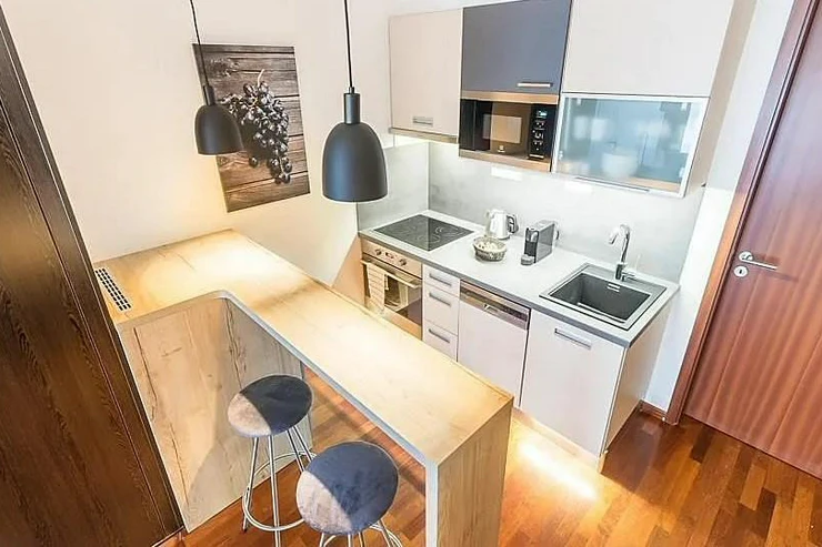 The living area is separated by a practical bar counter, the wooden floor with underfloor heating gives the apartment a feeling of comfort and coziness.