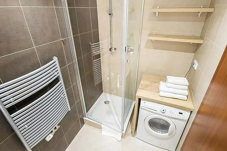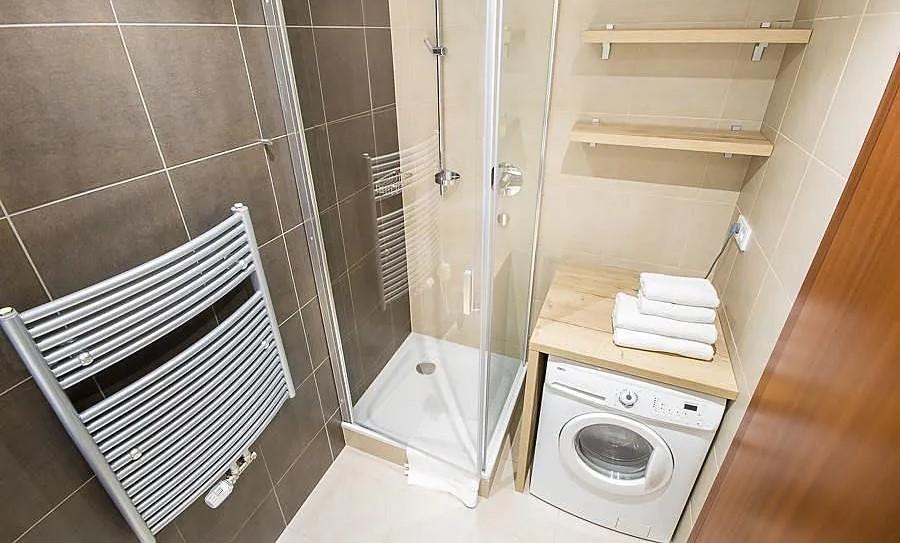 There is a spacious bathroom with a shower, washing machine, dryer and toilet, as well as an entrance hall with plenty of storage space.