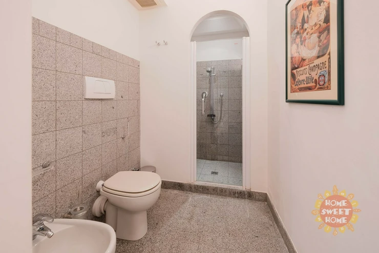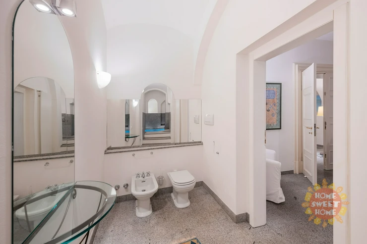 The layout of the apartment offers a large living room with dining area, separate kitchenette (ceramic hob with convection oven, refrigerator, microwave, extractor hood), two bedrooms and two bathrooms (one with shower, the other with bath). It is completely furnished with modern stylish furniture. There is also an entrance hall with a hallway and wardrobes. The floors are parquet and tiles.