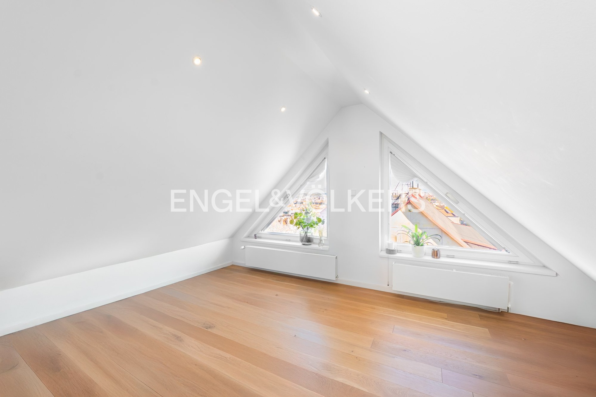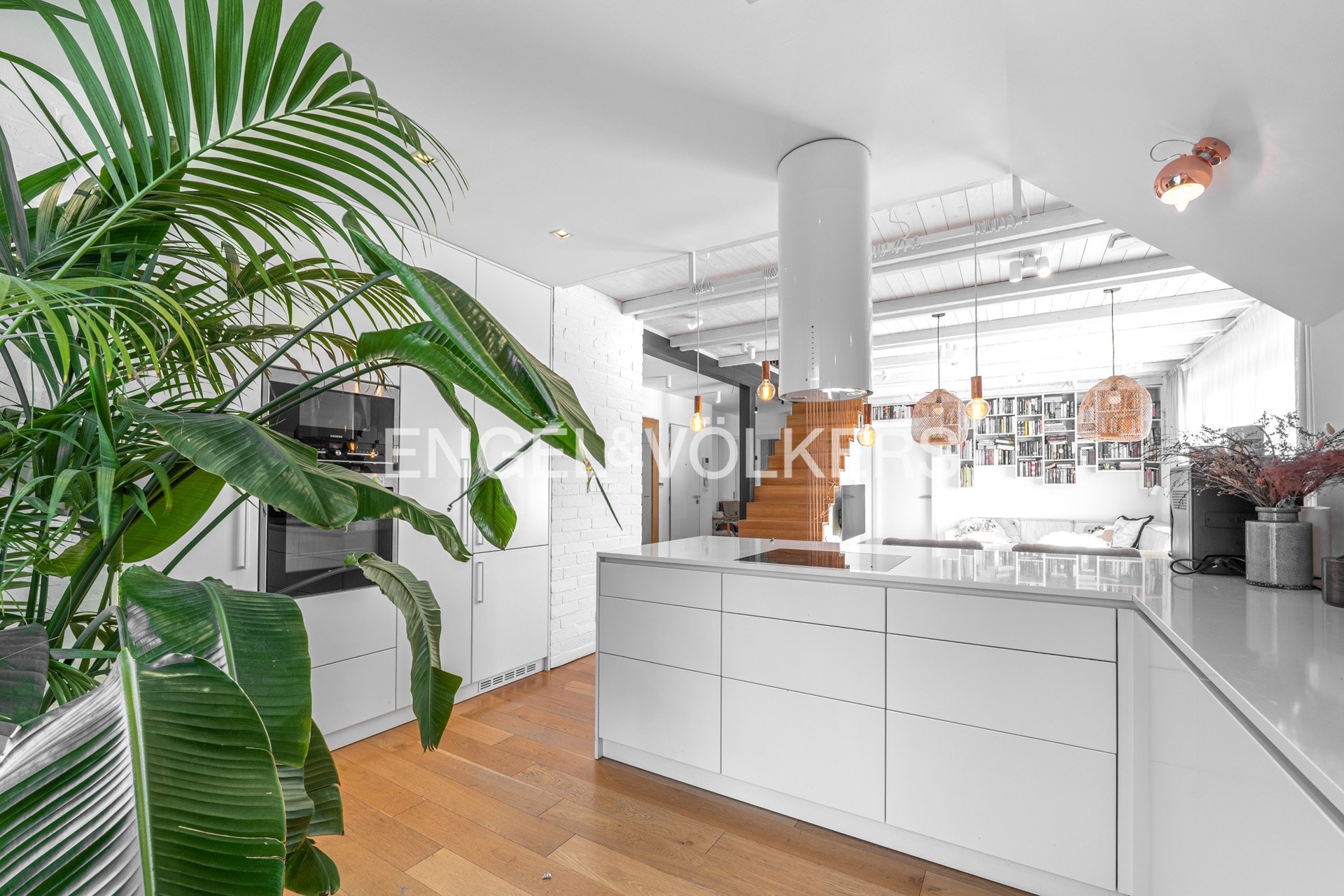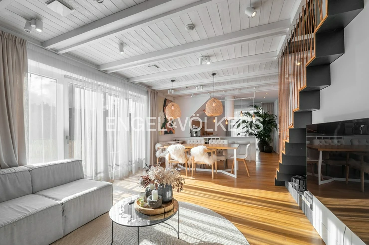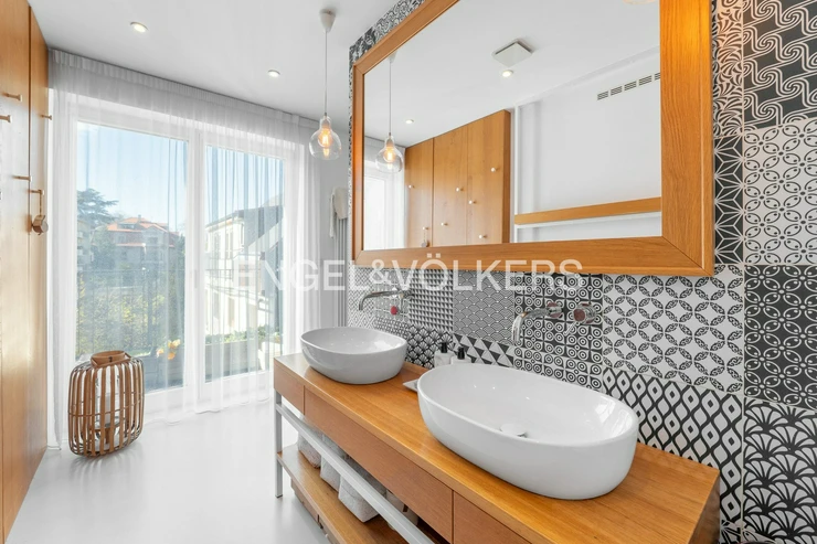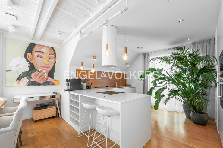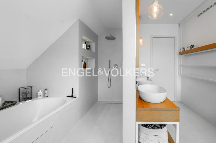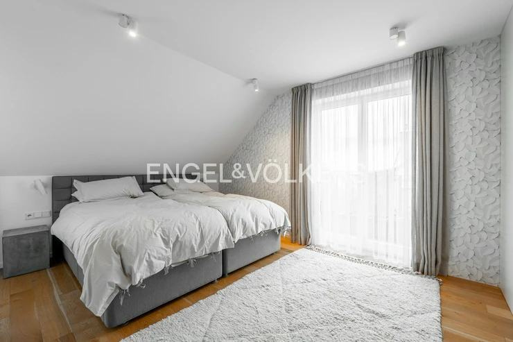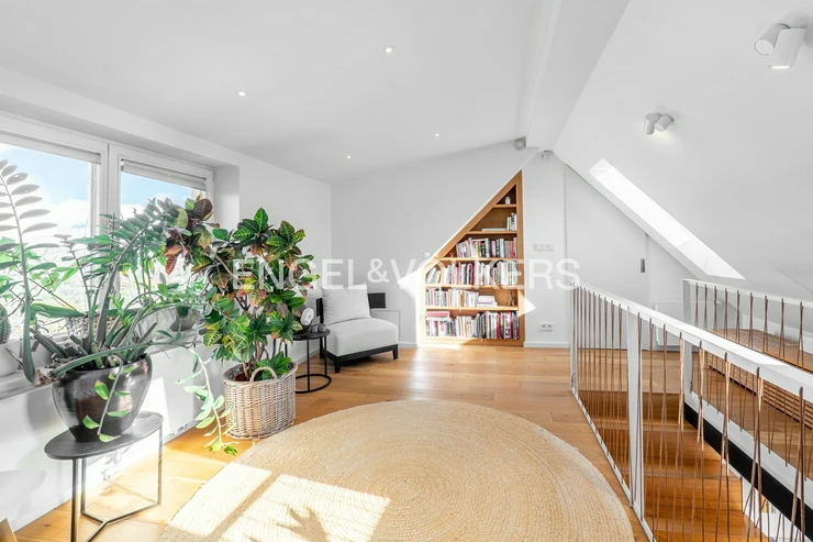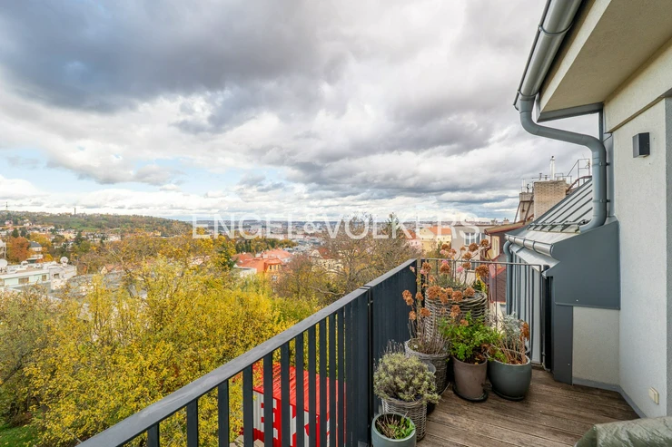 The lower part of the apartment features a living room with a fully equipped kitchen with Siemens appliances and direct access to two terraces, a master bedroom with a dressing room, built-in storage spaces, access to two terraces, and a magnificent view of the city, Petřín, and the National Theatre, as well as a second bedroom with built-in storage spaces, a bathroom with a bathtub and a shower corner and access to a terrace, a second bathroom with a toilet, washing machine, and dryer, and also an entrance hall. The upper floor features a gallery and two further bedrooms / guest rooms and a third bathroom with a shower corner and a toilet.