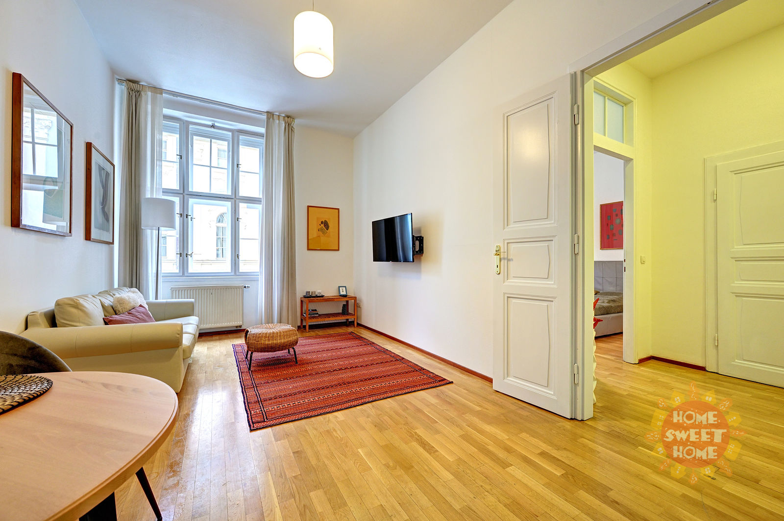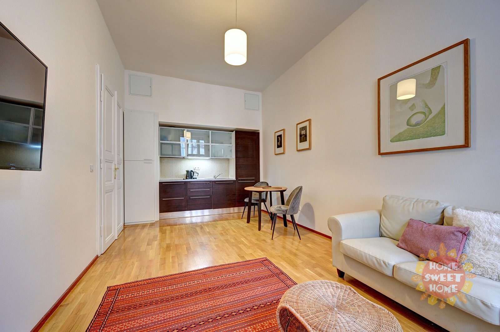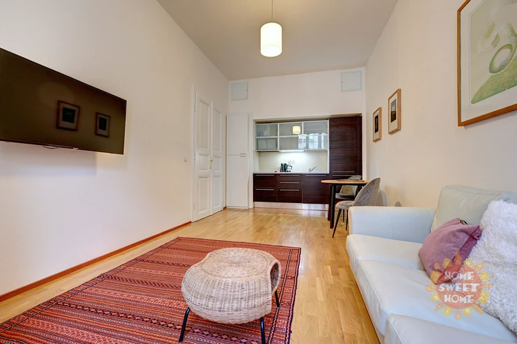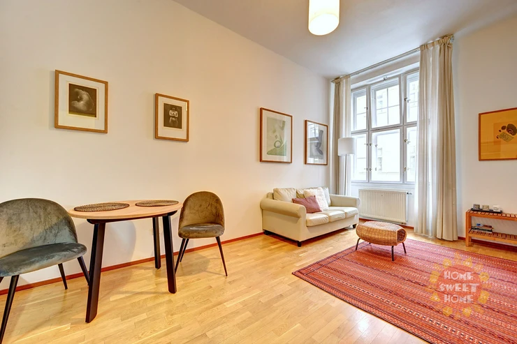 Beautiful apartment 2+kt for rent is located on the first floor of the brick house with no elevator in the street Maiselova, Prague 1. The total usable area is 50 sqm. The apartment is fully equipped with stylish furniture. The apartment consists of bedroom with double bed and built-in wardrobe, living room with kitchenette with built-in fridge and electric stove (there is no oven, either dish washer) and bathroom with shower, washing machine, toilet and bidet.