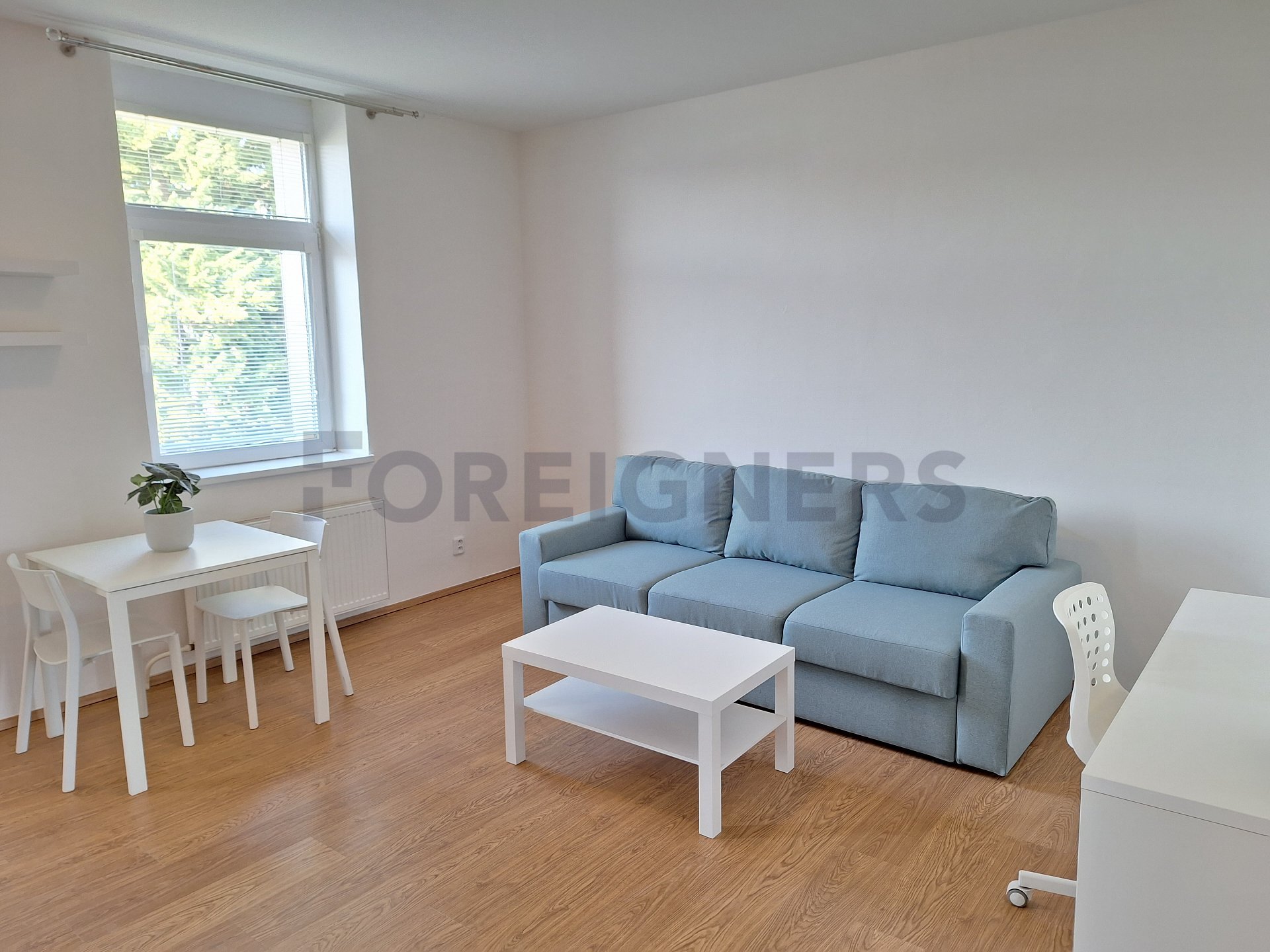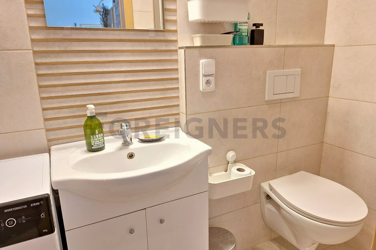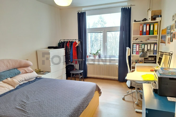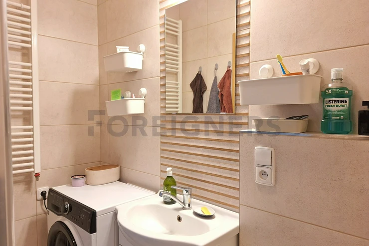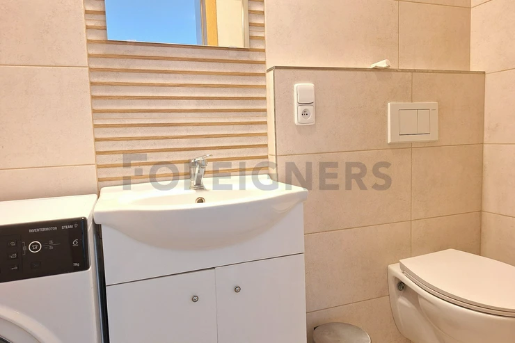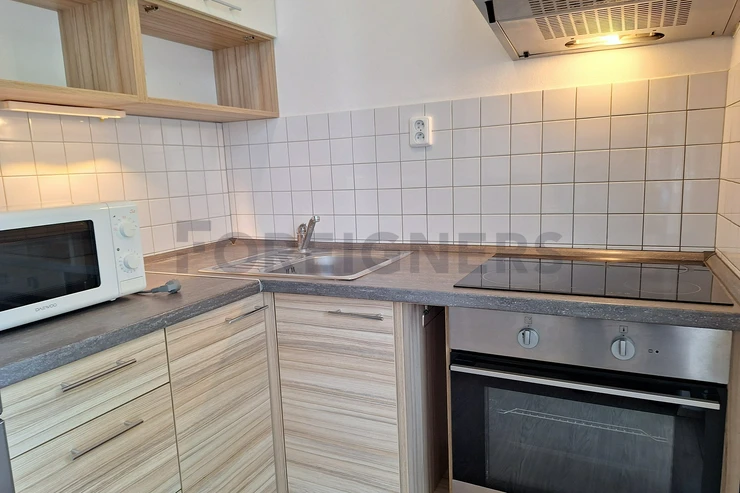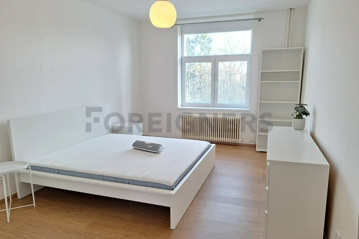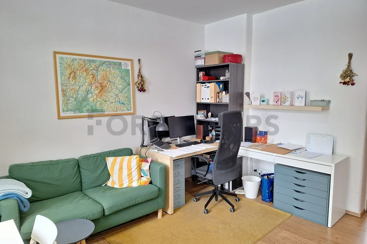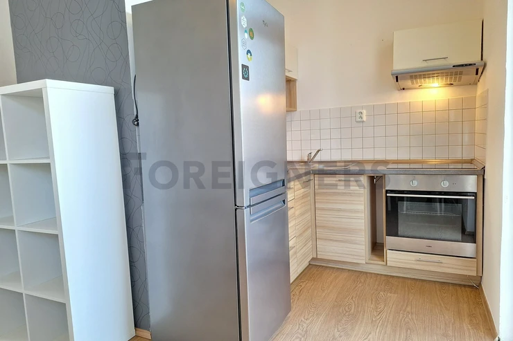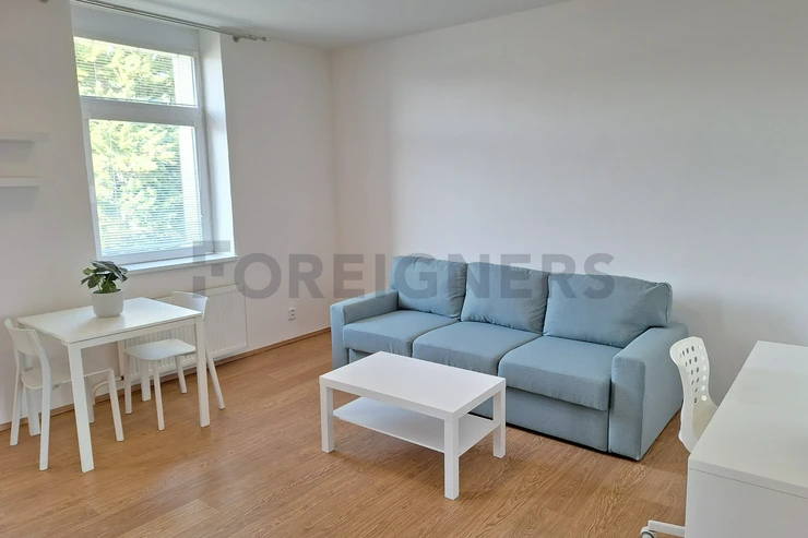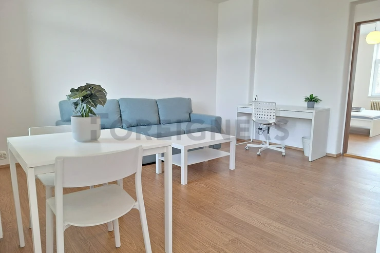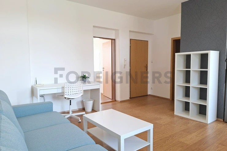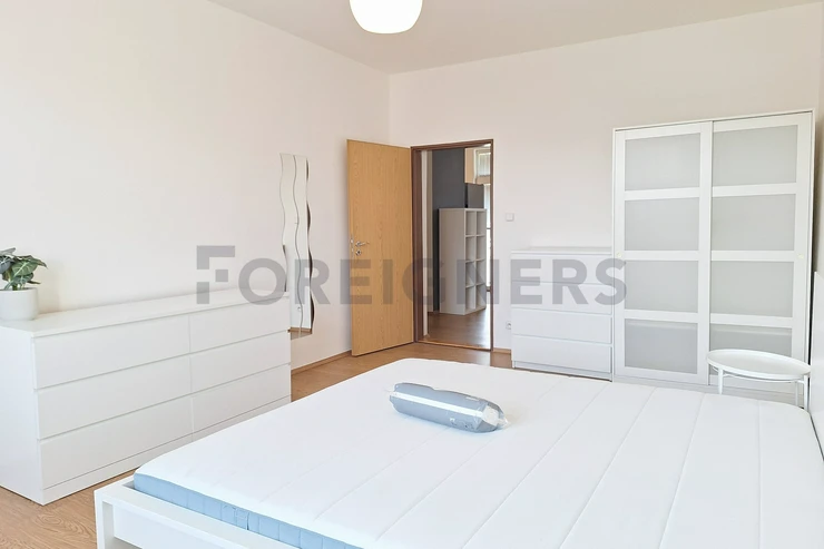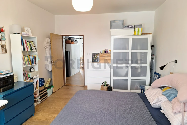 The apartment is available 2+kk with a total area of 55 m2. The apartment consists of bedroom, living room with kitchen and a bathroom. There is a small balcony.