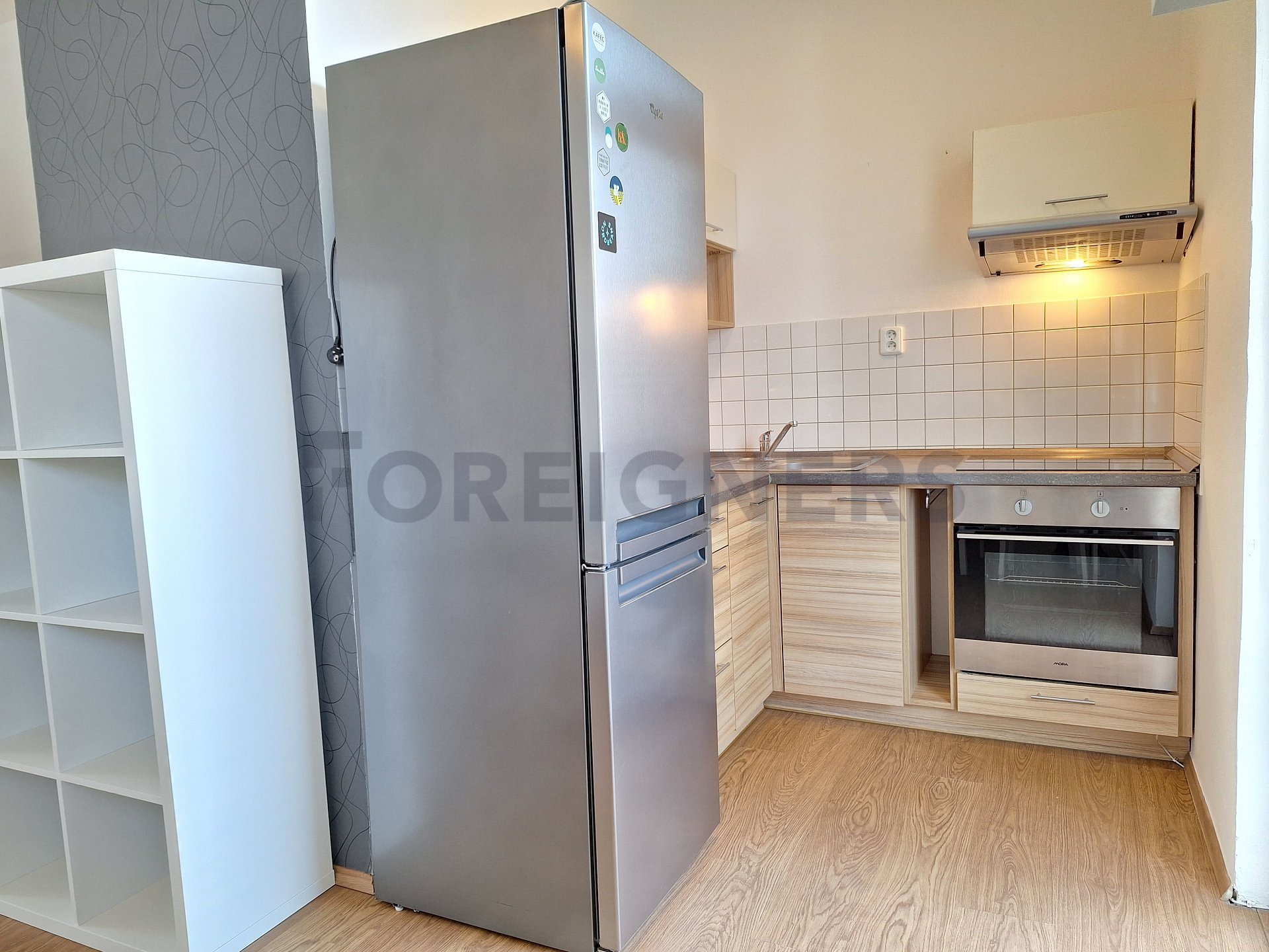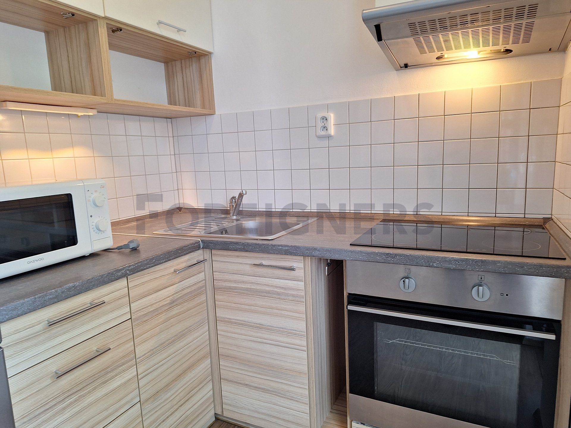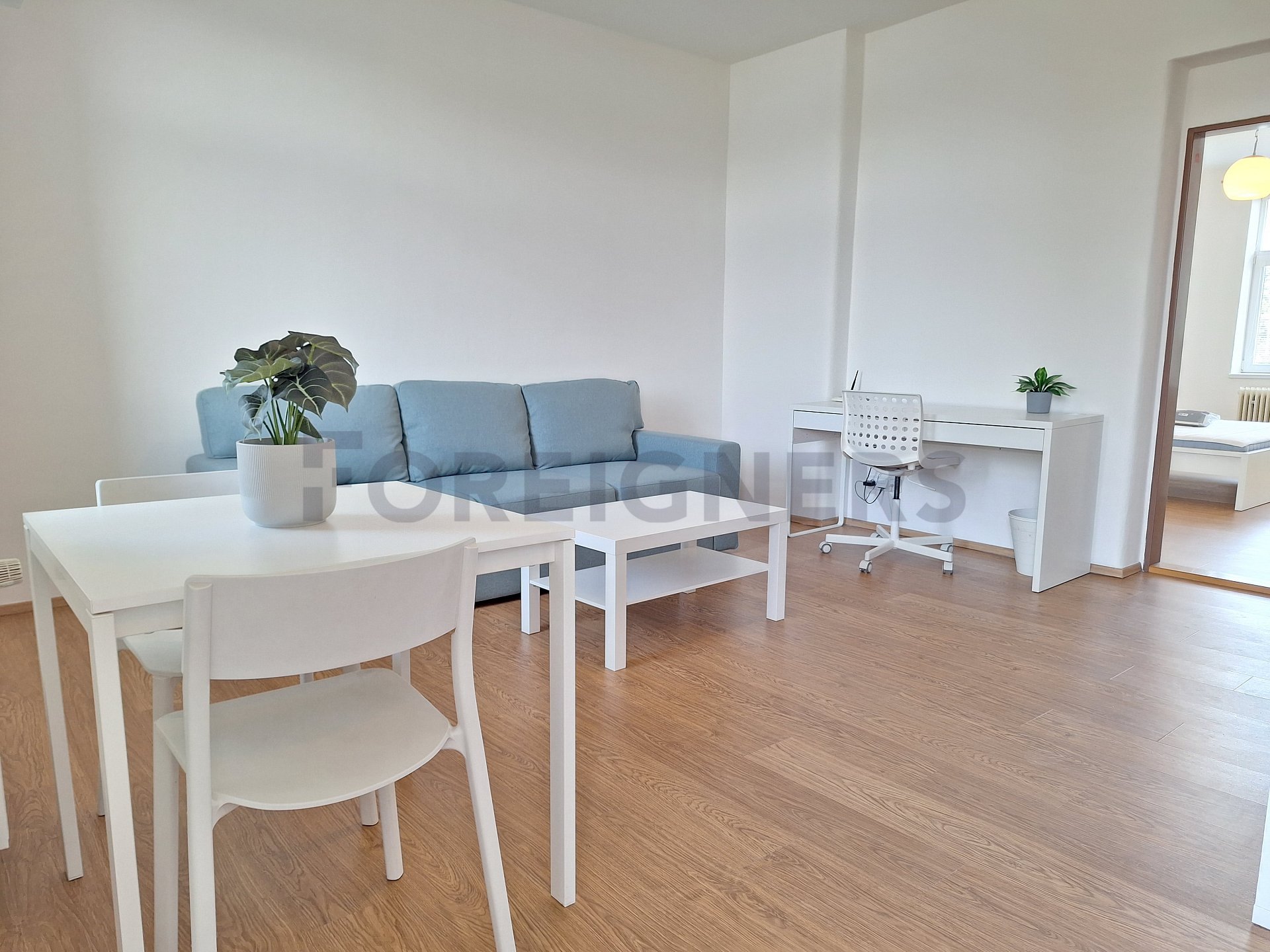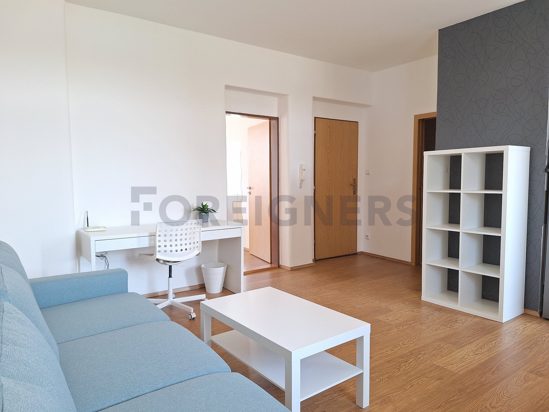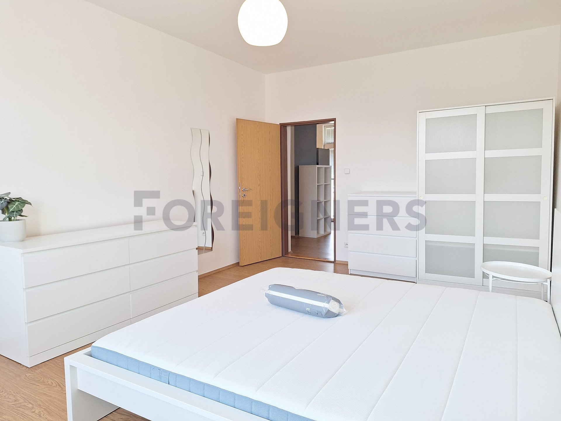 The apartment is available 2+kk with a total area of 55 m2. The apartment consists of bedroom, living room with kitchen and a bathroom. There is a small balcony.