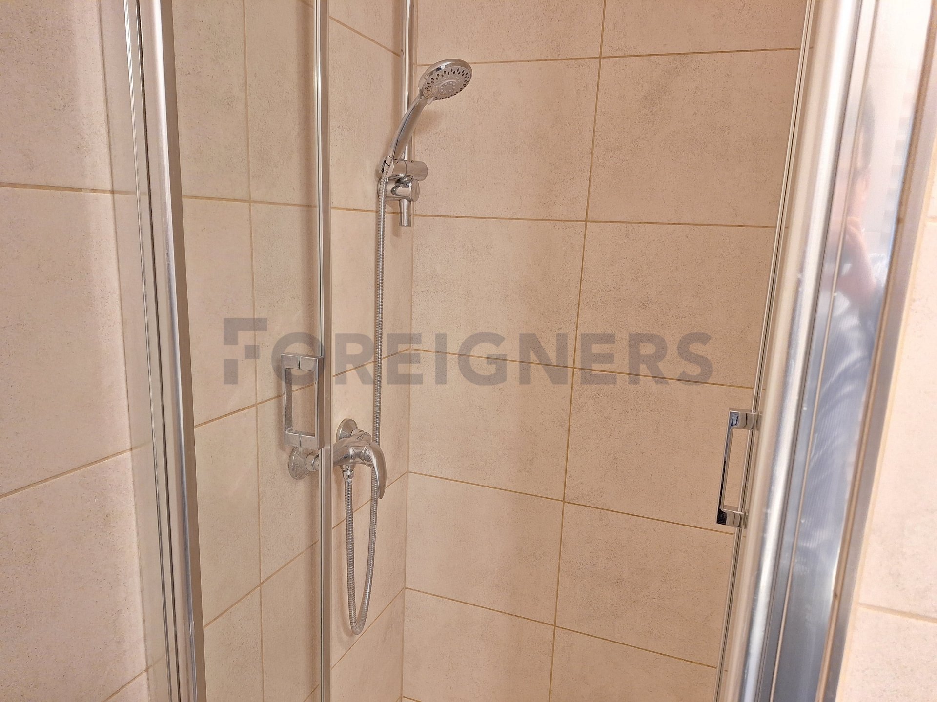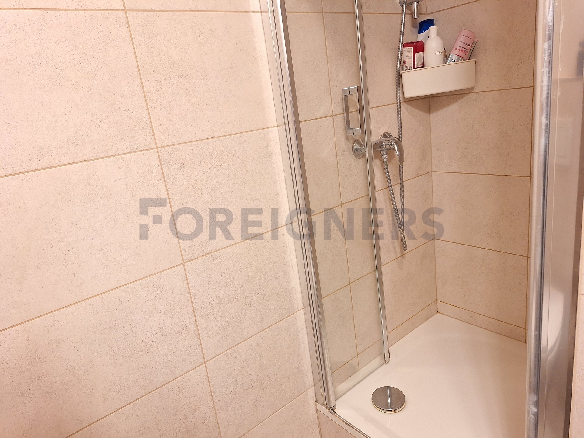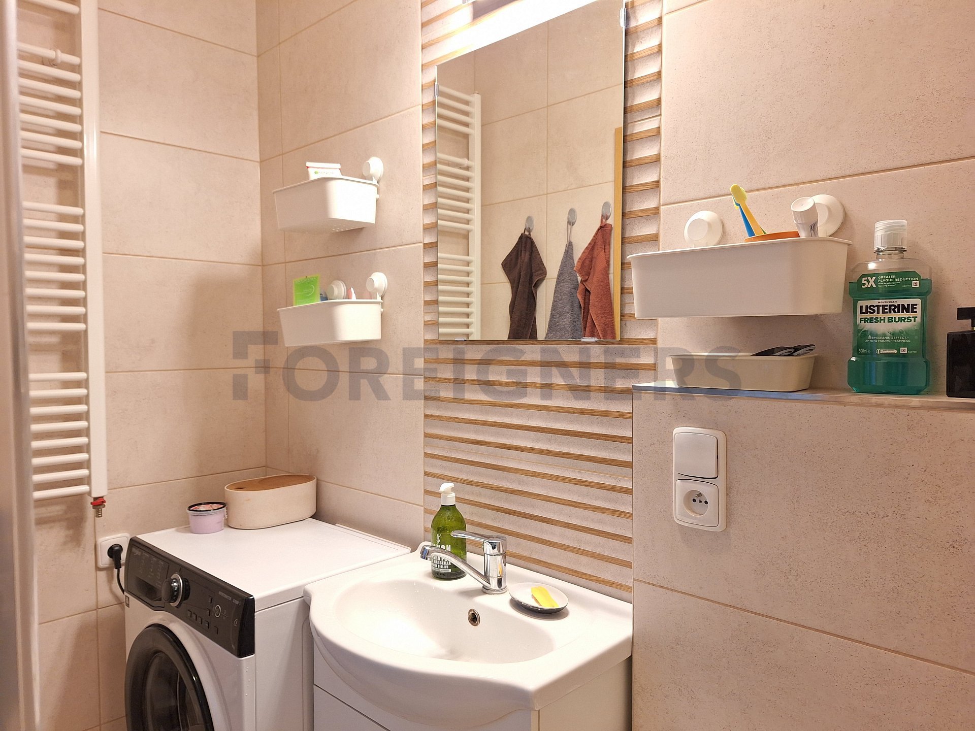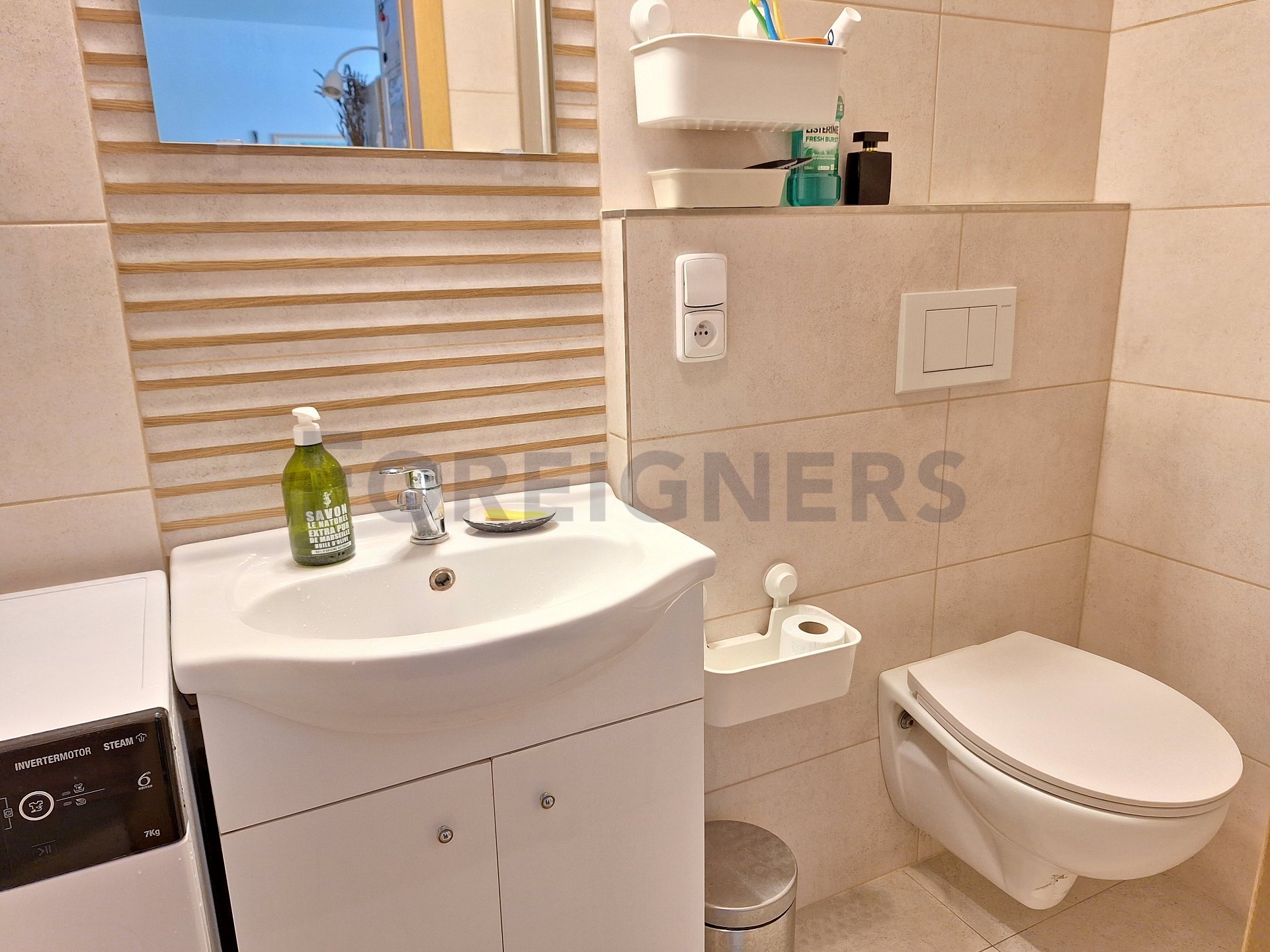 - in the bathroom you will find a shower, a washing machine, a sink with a storage cabinet including a mirror and a toilet