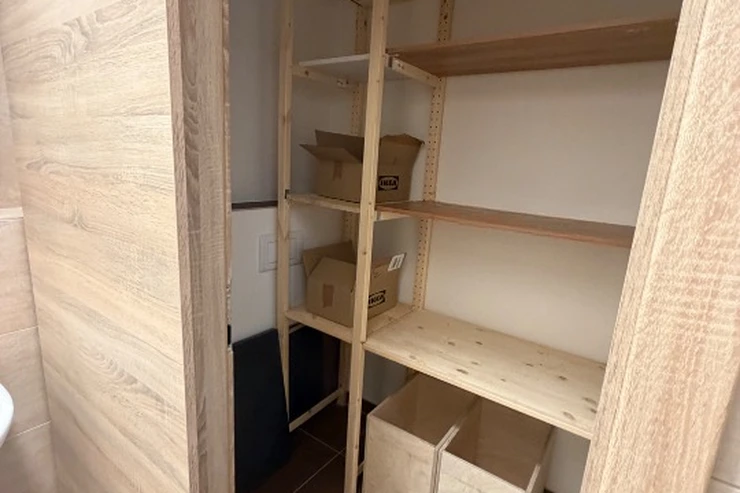 Ateliér je částečně zařízený : k dispozici je kuchyňská linka a základní domácí spotřebiče , včetně myčky nádobí a pračky, vestavěná skříň v předsíni , menší komora.