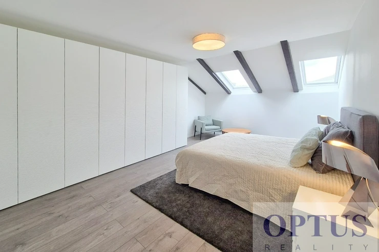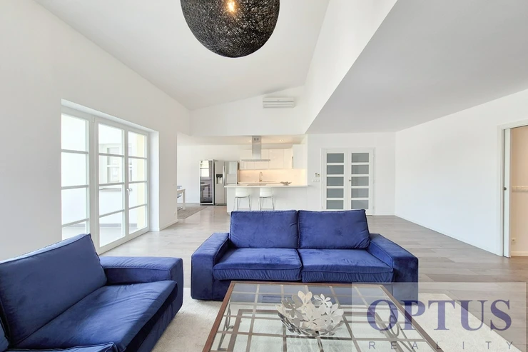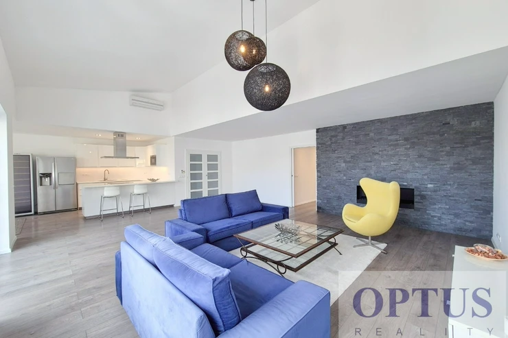 The apartment consists of an open space living room of 67 m2 connected with a kitchen and dining area, with an ethanol fireplace and access to the terrace overlooking a spacious courtyard, four bedrooms (2x 24 m2, 20 m2 and 15 m2) – the master bedroom has en suite bathroom), work room of 11 m2, two bathrooms, a separate guest toilet, a laundry room, a storage room, and an entrance hall with a wardrobe.