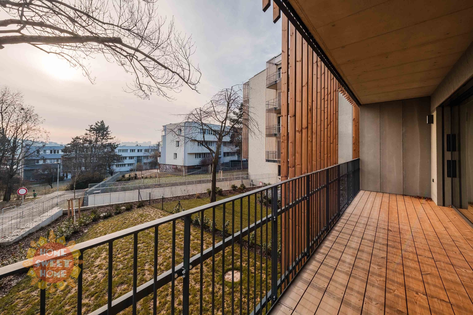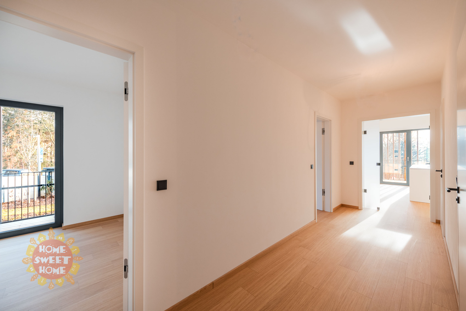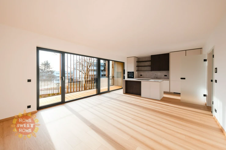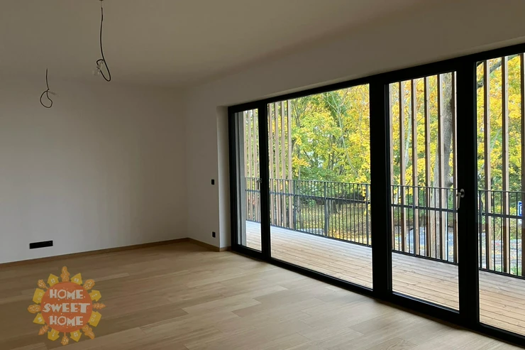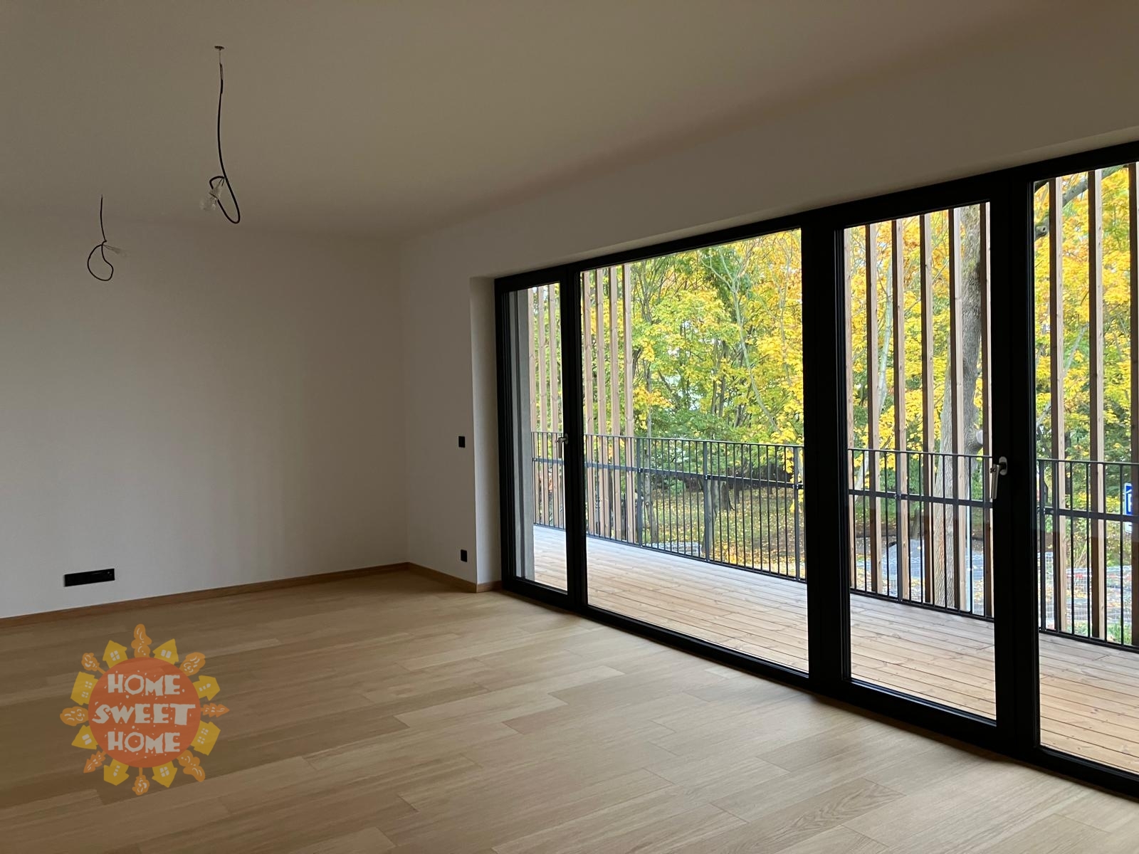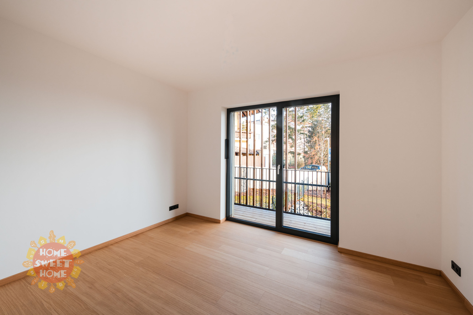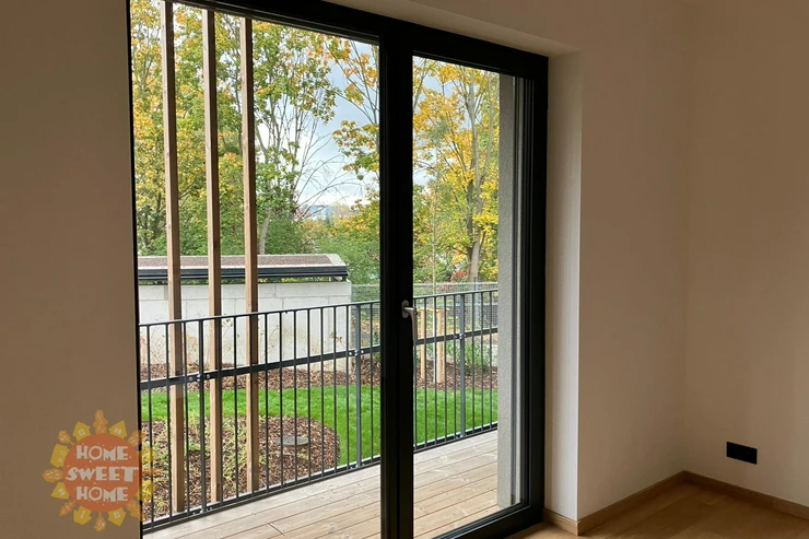 The newly completed new 3+kk apartment with an area of 82 sqm with two terraces of 17 and 11 sqm is located on the 1st floor with a view of the greenery.