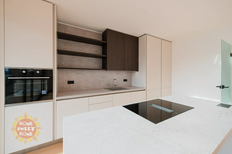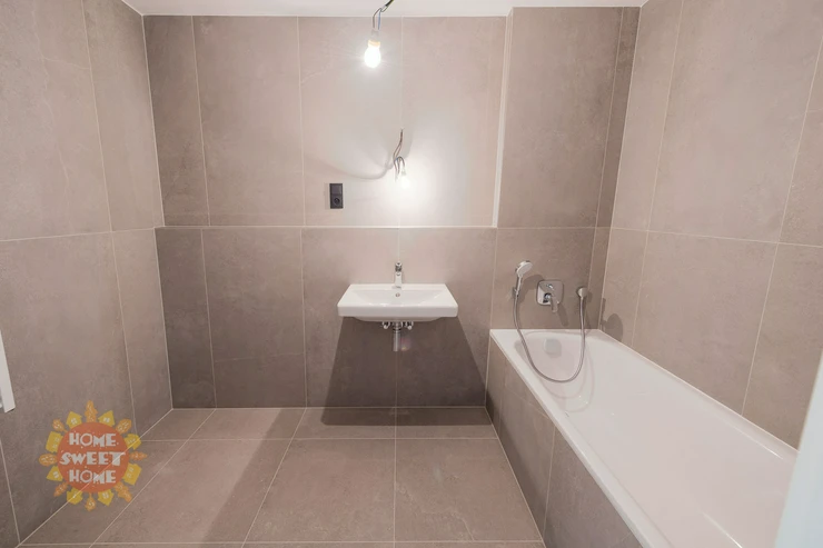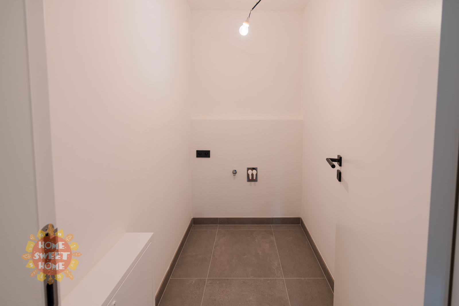 entrance hall with an area of 11 sqm, spacious living room of 37 sqm with a kitchen equipped with all appliances (induction hob, oven, dishwasher and refrigerator) with access to a terrace of 11 sqm, facing south, two separate bedrooms with an area of 12 sqm, facing east with a shared terrace of 17 sqm, one bedroom with a built-in wardrobe, a utility room of 2.5 sqm, a bathroom with a bathtub and a separate toilet.