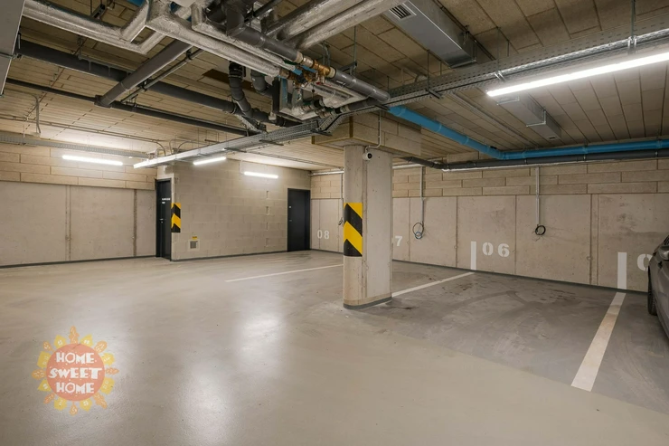 large-format windows, wooden floors, underfloor heating, front window blinds with central control, decorative curtain rails, lighting fixtures. There is a brick cellar of 3.7 sqm and an underground garage with access only for residents. The entrance to the building is monitored.