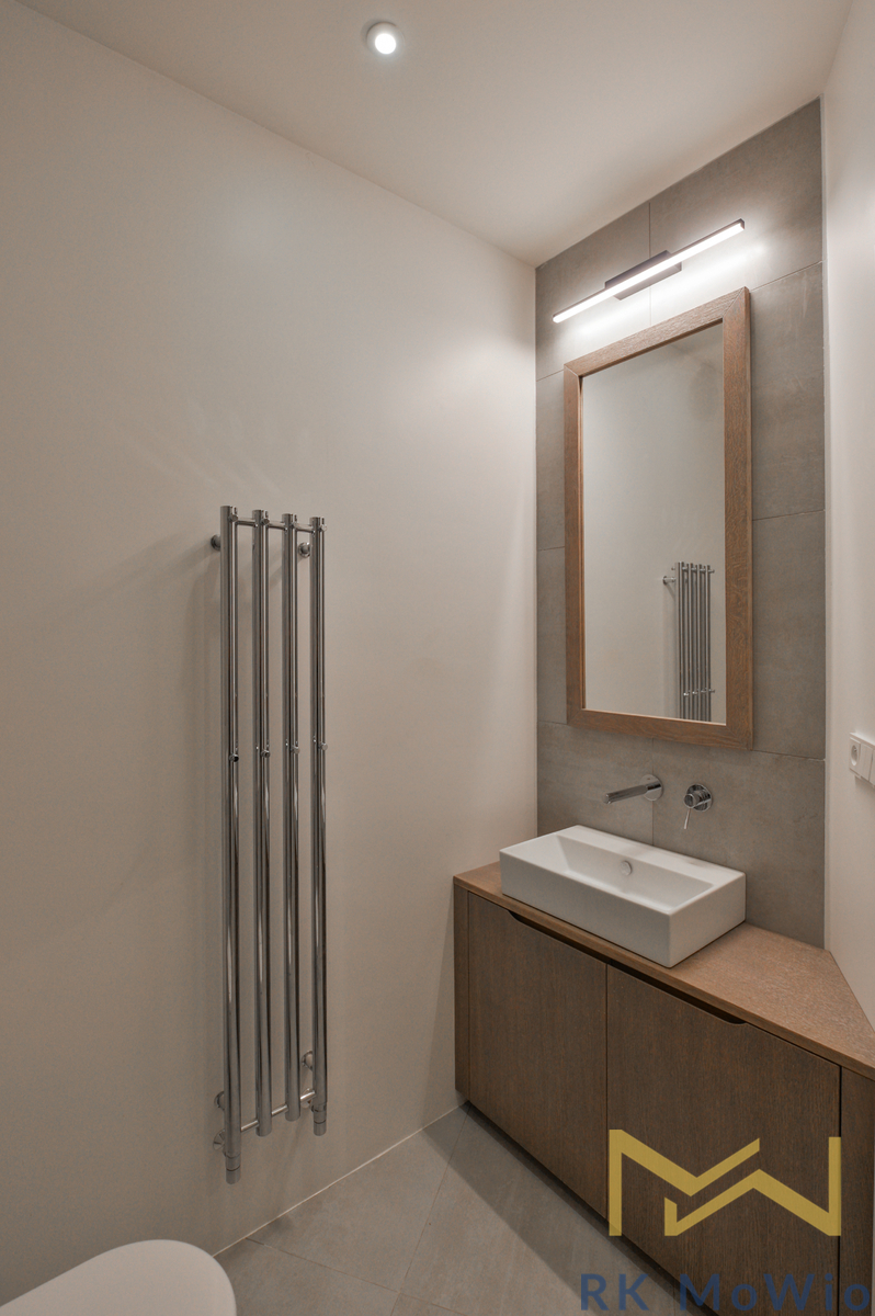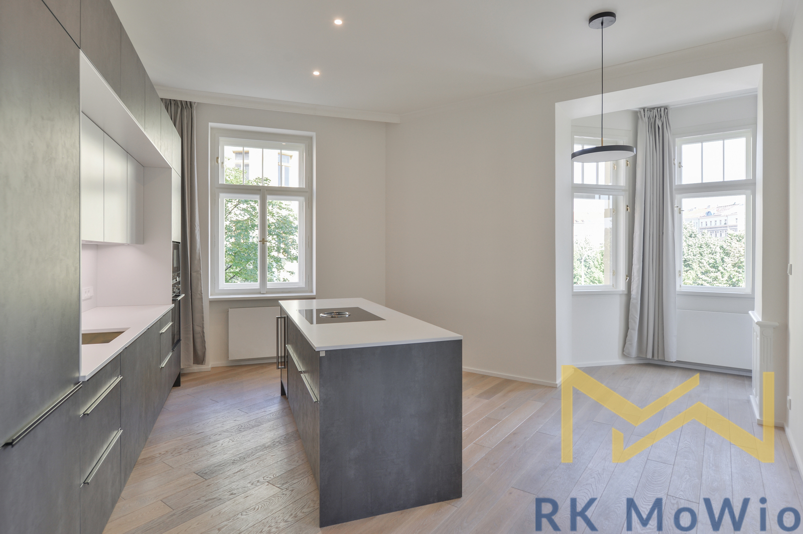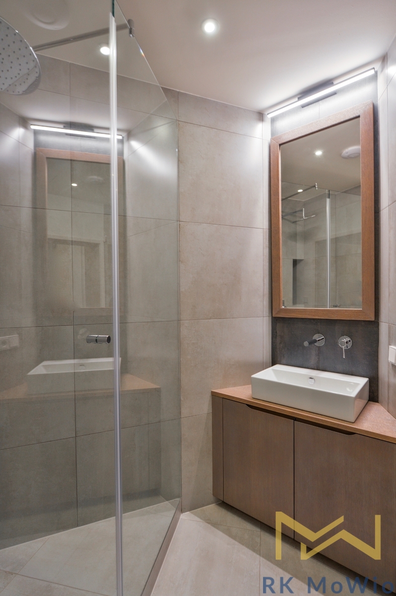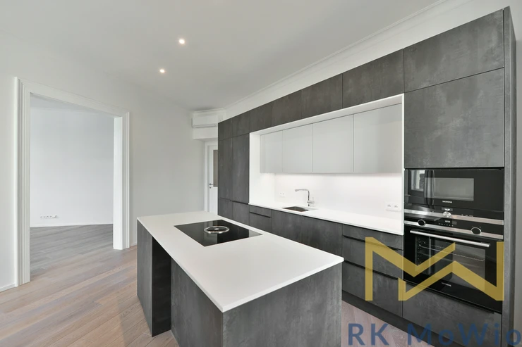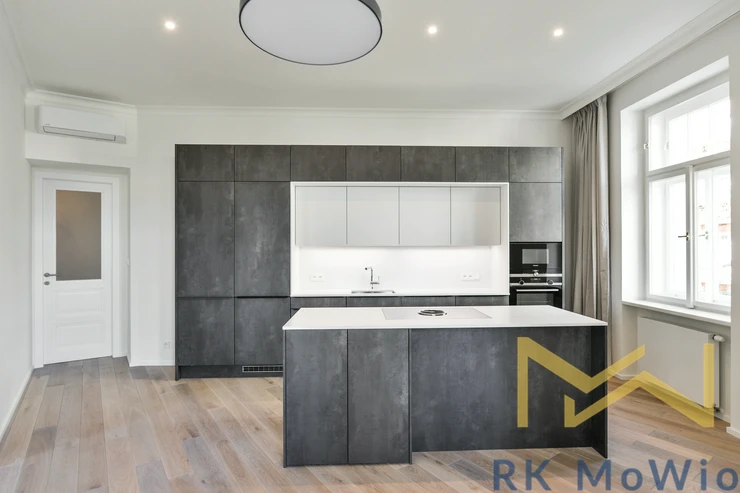 The apartment comprises an entrance hall, a spacious living room with a kitchen area featuring a kitchen island and a dining area, a master bedroom, a second bedroom, two bathrooms (with shower, washbasin and toilet), and a separate guest toilet. The apartment is further equipped with a fitted kitchen including a fridge with freezer, ceramic hob, built-in electric and microwave ovens; built-in wardrobes, a washer-dryer combo, air conditioning, wine fridge, solid oak wooden floors, tiles, and new windows with insulating double glazing. One parking space must be rented with the apartment for an additional fee of CZK 6,500/month + 21% VAT = CZK 7,865/month.