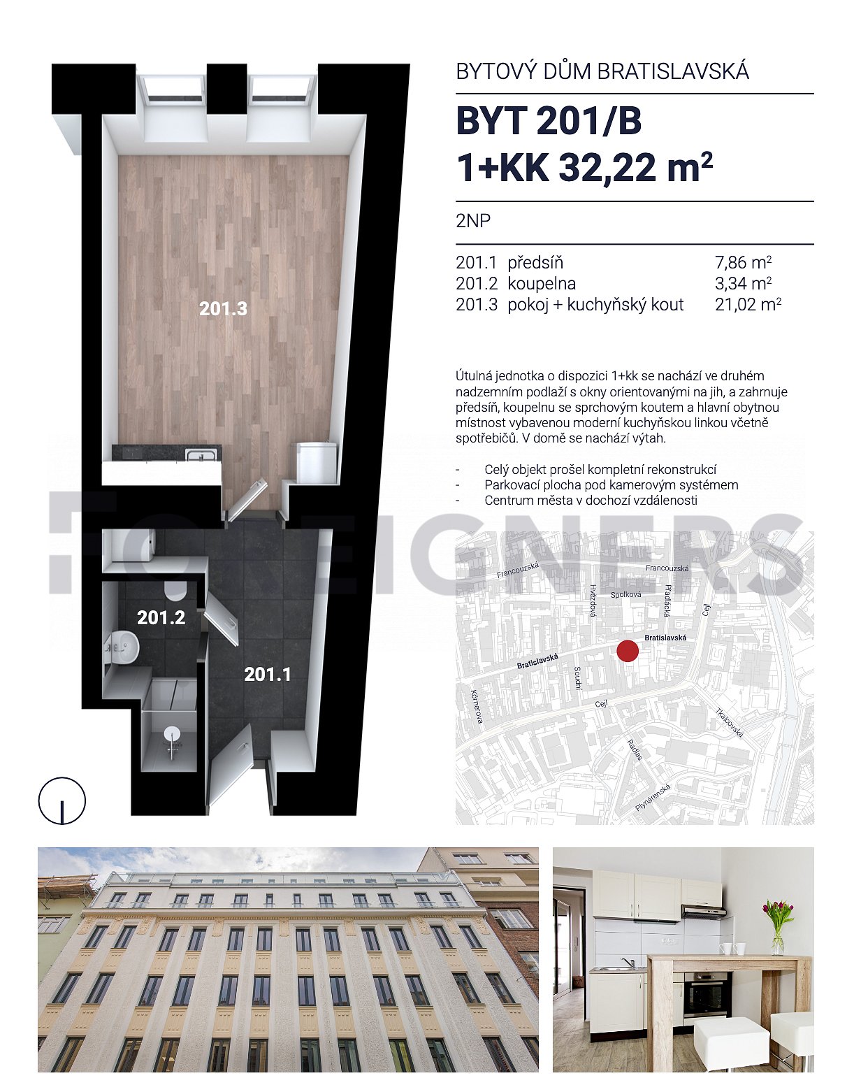 We are offering a nice and cosy 1+kk (studio) no. 201B, which is situated in the Zábrdovice area. The house is situated close to the city centre. The flat is suitable for 1-2 people.