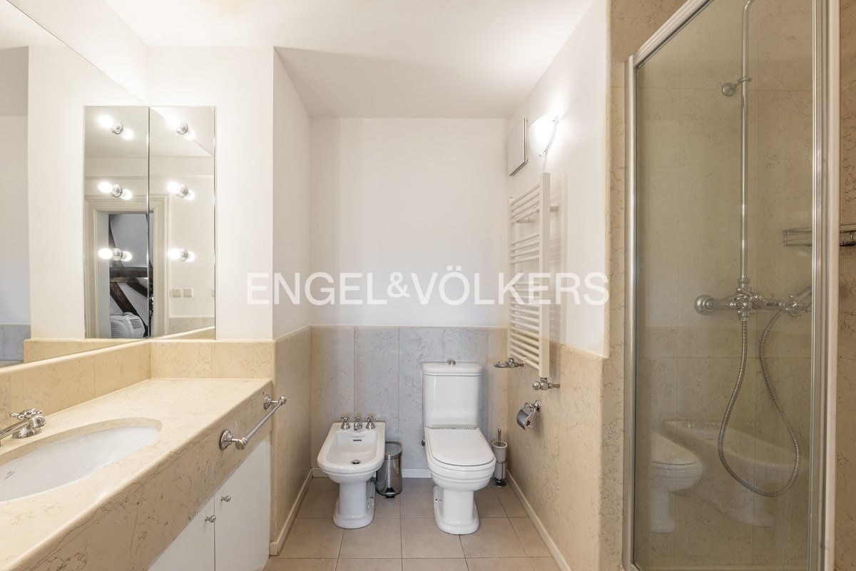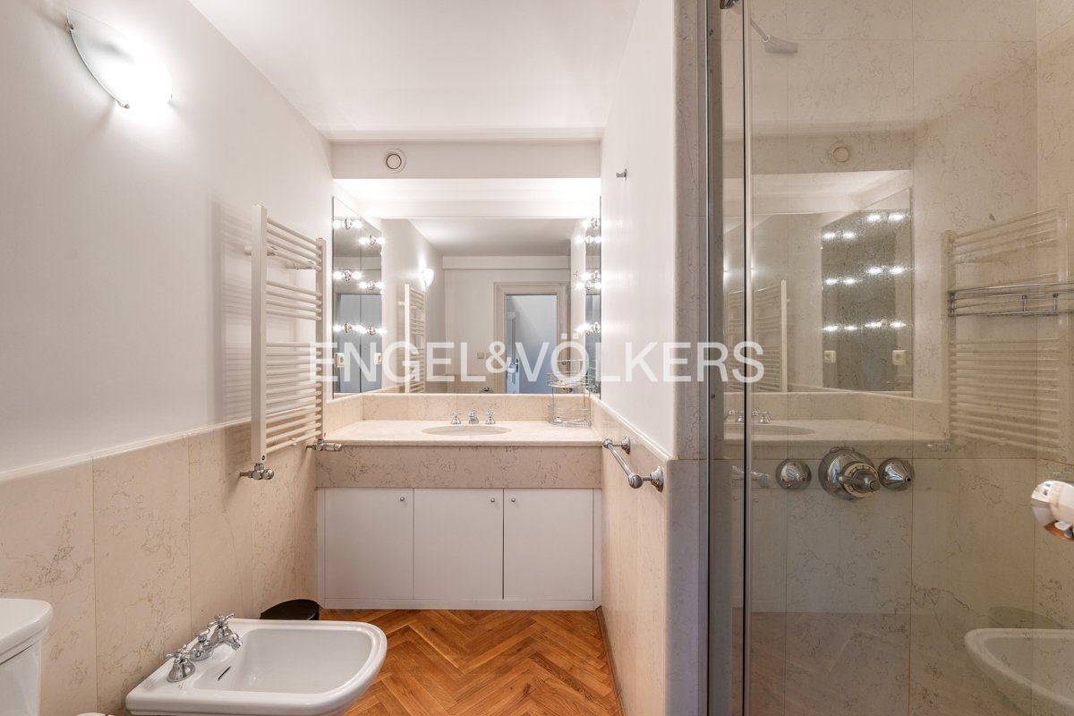 The apartment stands out with high ceilings, large windows, parquet floors, stone floors and marble bathrooms. The kitchen is equipped with stone worktops. Other amenities include high-speed internet, an alarm and the possibility of connecting to a security system. The house has an elevator with direct access from the garage.