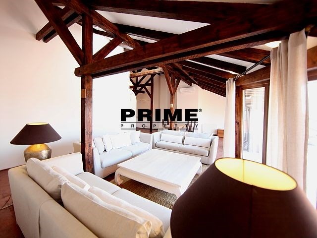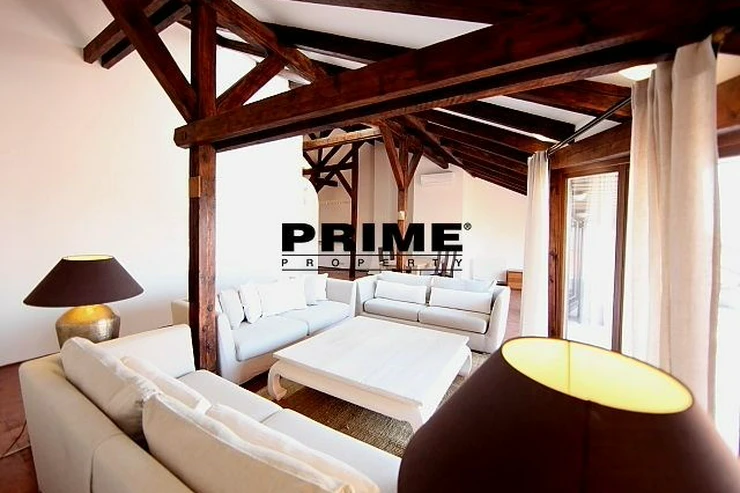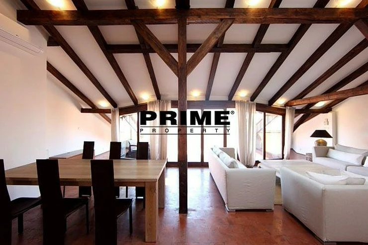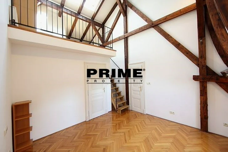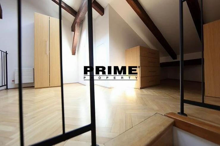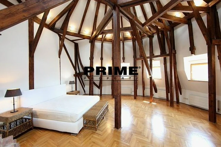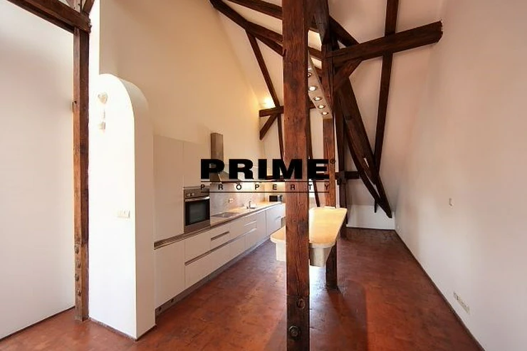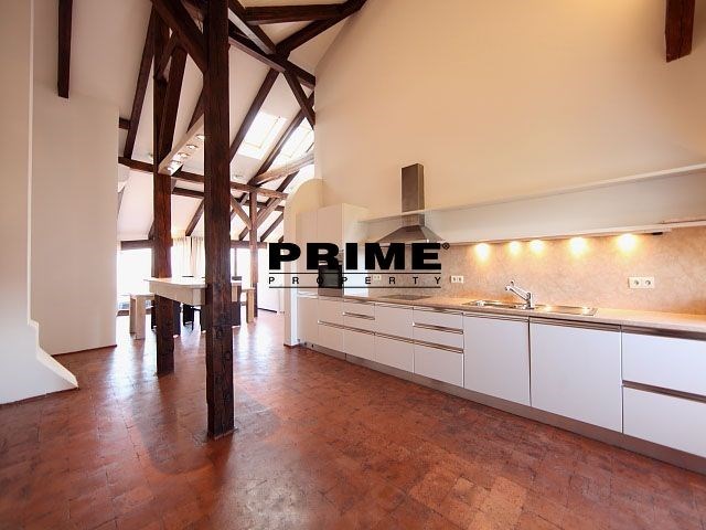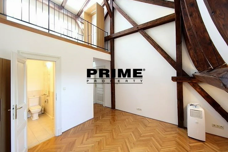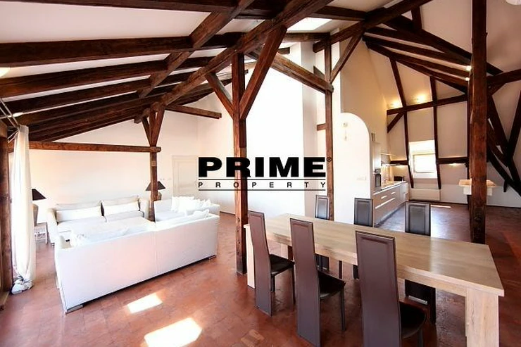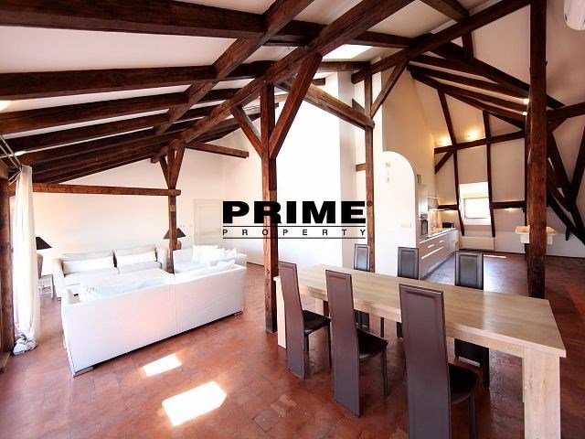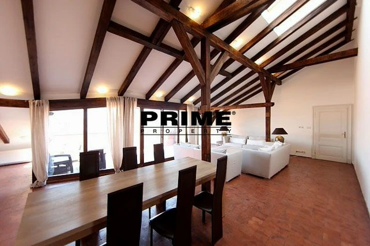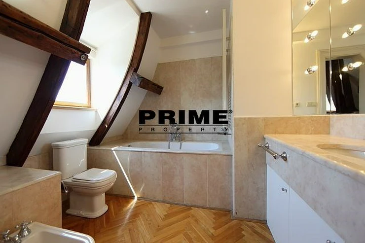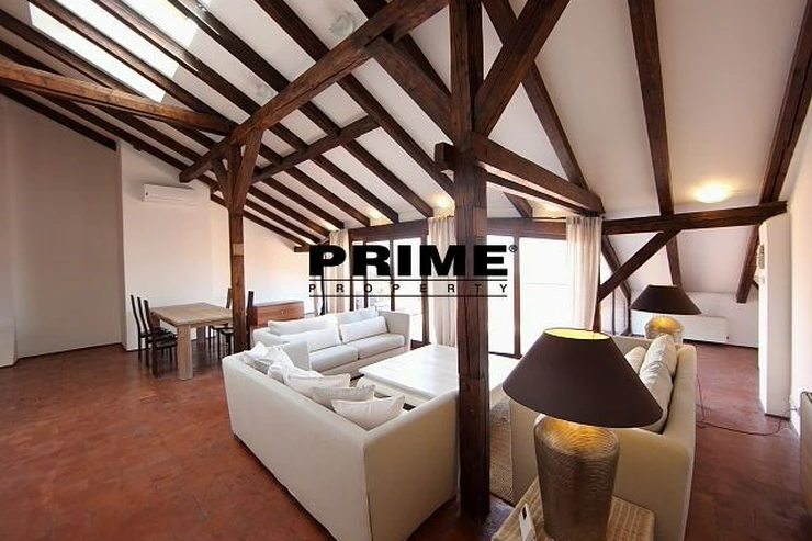 The property comprises: an entrance hallway, a large living room with oak ceiling beams, with a dining area and access to a 23m2 terrace with views of Prague and Prague Castle, an open, fully fitted modern kitchen with appliances (electric cooking hobs, electric oven, dishwasher and a refrigerator), an oak beamed master bedroom with an en suite bathroom (with a bathtub, sink, toilet and a bidet) and a gallery, two more bedrooms with en suite bathrooms (both with a shower cubicle, sink, toilet and a bidet) and galleries (wardrobe space and hanging space for clothes storage), a guest WC and a laundry room.
