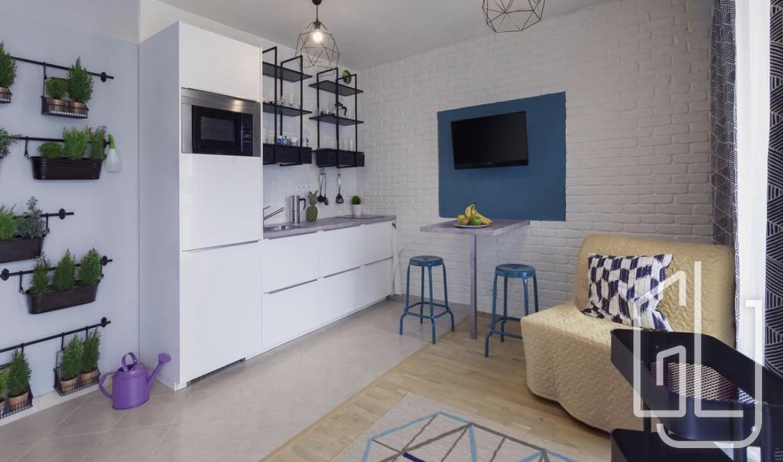 The apartment is a one-room studio with a bathroom and is fully equipped and furnished. The kitchen is fully equipped, and the apartment includes all furniture and appliances necessary for comfortable living.