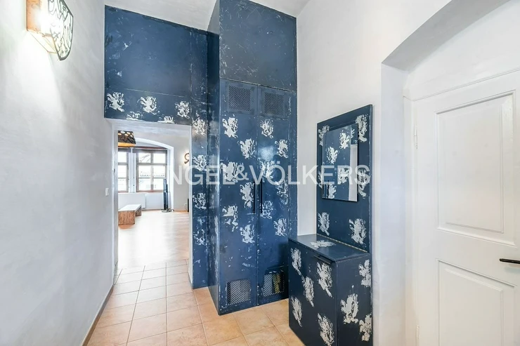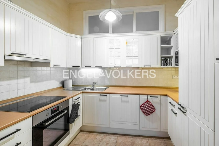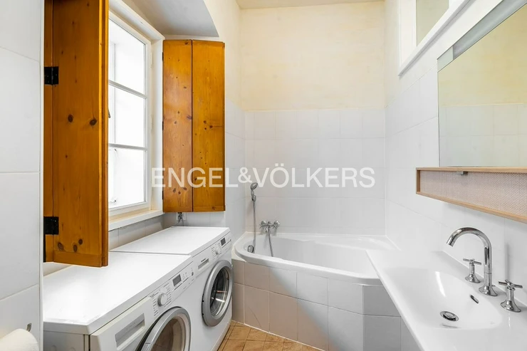 During the extensive renovation, care was taken to preserve original features such as Gothic stucco. The apartment consists of a spacious central hall decorated with motifs of the classic Czech lion by Martin Ceplecha, from which you can access the bathroom with a bathtub and the first smaller bedroom. The bathroom is equipped with a washing machine and dryer. The living room with the dining area is very airy and spacious and offers unique views of historic Prague. The kitchenette is fully equipped with all appliances such as a dishwasher, electric oven with hob and extractor hood, refrigerator, and freezer. The bedroom has effective storage space in the form of built-in wardrobes. The apartment has a cellar and a smaller loggia. There is an elevator in the building.