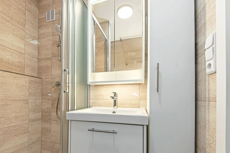 The apartment is surrounded by all civic amenities – shops, restaurants, cafes, schools, kindergartens, medical facilities, sports facilities, playgrounds, and not far from Chaplin Square with more shops and services. The Barrandov area offers numerous leisure activities – nearby is Prokopské Valley, ideal for walking, running, cycling, or excursions into nature. For relaxation, there are also Barrandov Rocks and Dalejské Valley parks with beautiful views of Prague. Just a few minutes from the house is the AquaDream Barrandov water park, offering a swimming pool, wellness, sauna, and fitness center.