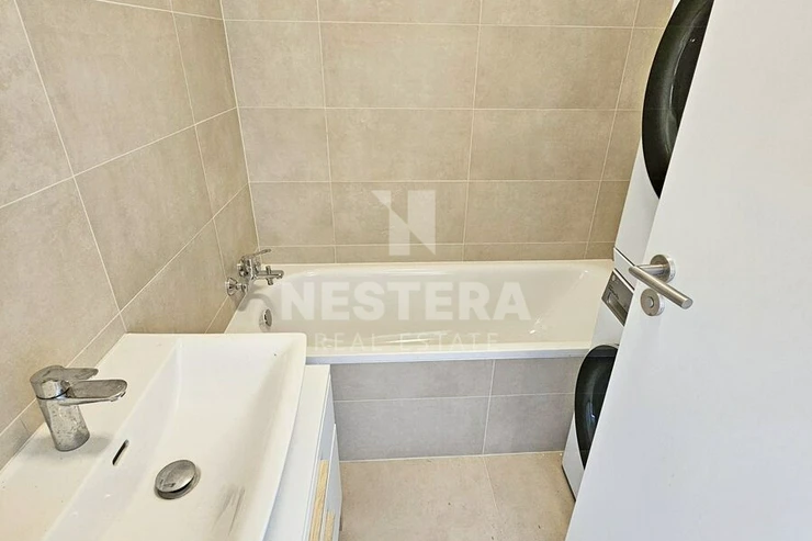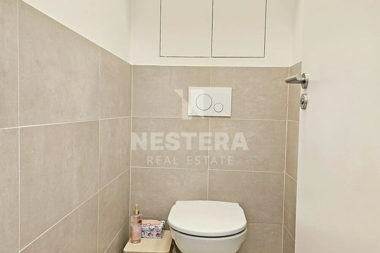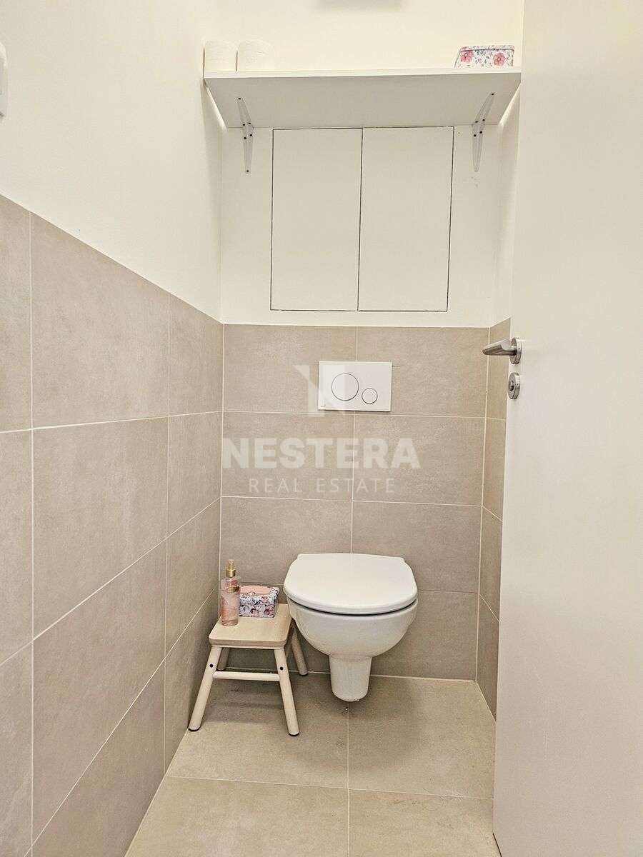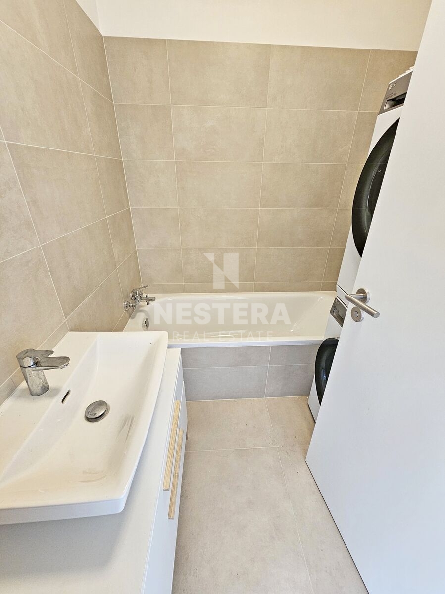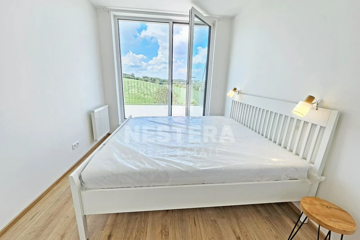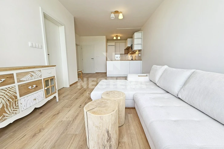 The apartment is divided into a spacious hall with a built-in wardrobe, a separate toilet, a bathroom with a bathtub (washing machine with dryer), a pantry, an airy living room with a fully equipped kitchenette and a bedroom. The living room and bedroom have access to a large terrace (18 m2) with lighting and a socket, which you can use for example for an electric grill. Water is also brought to the terrace so that it is possible to water the greenery. The apartment is rented completely equipped with quality furniture. Insect nets and remote-control blinds are installed in the windows.