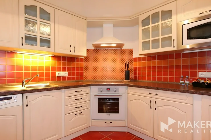 Interiér tvoří krásný světlý obývací pokoj s vybavenou kuchyní (lednice, myčka, varná deska, trouba, mikrovlnka). Dále jsou dvě samostatné romantické ložnice s manželskými postelemi a nočními stolky. V koupelně je vana a pračka. Toaleta je samostatná. Na podlahách jsou dřevěné plovoucí podlahy a dlažba.