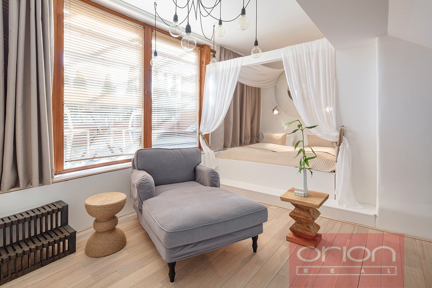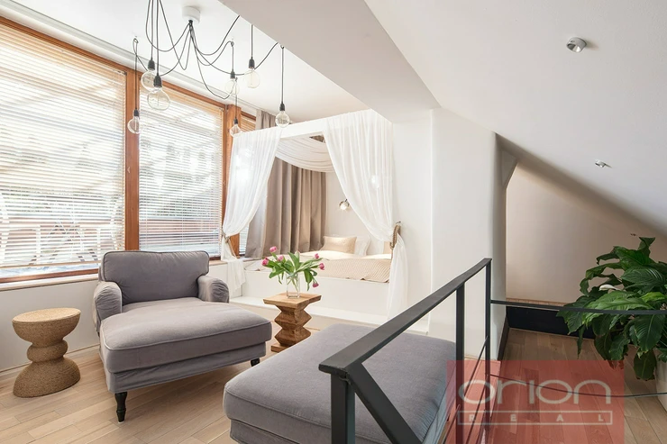 We offer for rent a duplex one bedroom partment with a terrace on the 5th floor of a renovated Art Nouveau house from the 19th century in Prague 5. The house has an elevator. The furnished apartment with an area of 38 sqm offers a bedroom with a king size bed with a canopy on the upper floor and a living area with a sofa and access to the terrace. On the lower floor there is a kitchen and dining area with an equipped kitchen, table and chairs, bathroom and toilet, in the hallway there is a wardrobe. The apartment is equipped with TV, SAT, WIFI and air conditioning.