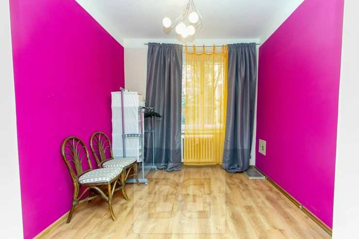 The apartment opens into a large entrance hall suitable for storing a bicycle or stroller, which leads to a central hallway providing access to the individual rooms. One room has a separate kitchenette, making the apartment ideal for shared living. Opposite is a smaller room with an area of approximately 12 sqm. This is followed by a larger bedroom with a large double bed and a wardrobe.