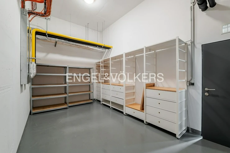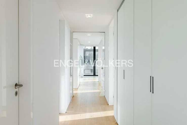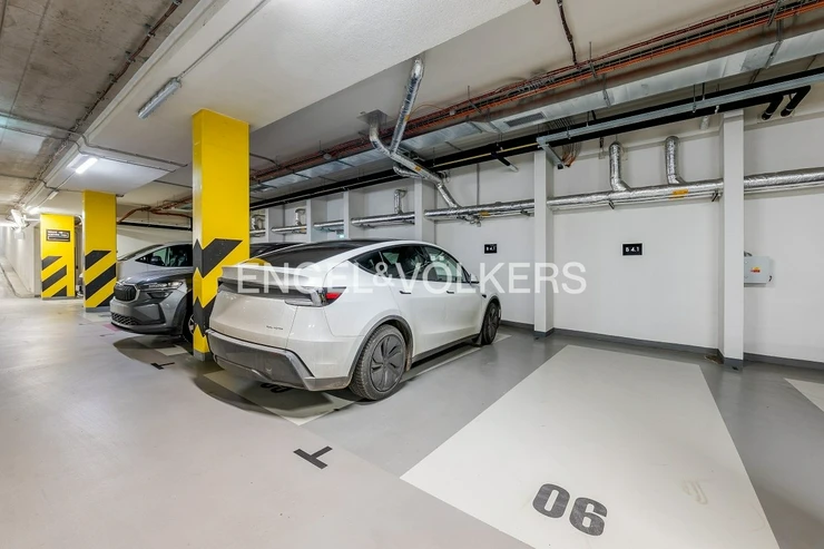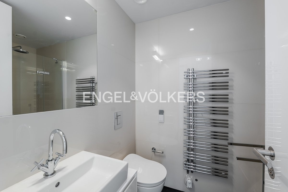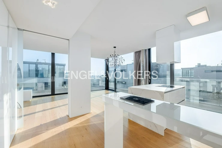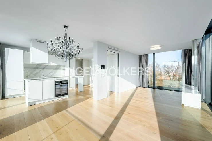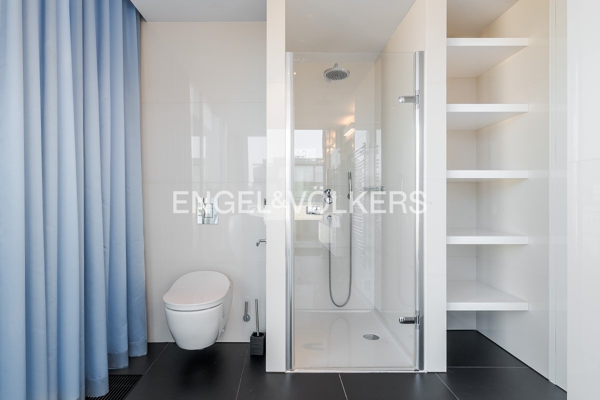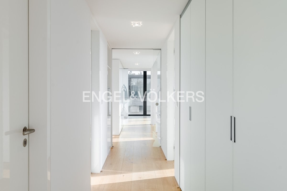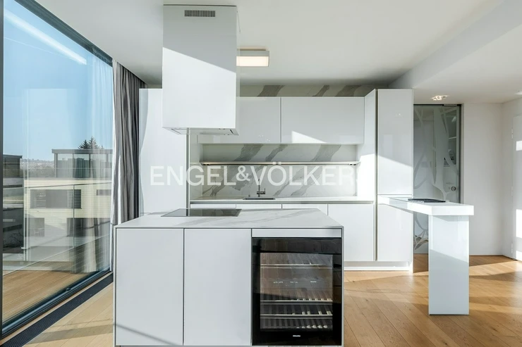 The apartment is equipped with high-standard materials and modern technologies ensuring maximum comfort – oak floors, large-format tiles, a tropical wood terrace, security entrance doors, electrically controlled outdoor blinds, underfloor heating, ceiling cooling with a capillary system, and controlled ventilation with heat recovery. The equipment also includes aluminum windows with insulating triple glazing, a washer and dryer, Miele kitchen appliances including a wine cooler, an alarm, a cellar unit, an elevator, and a camera system. Two parking spaces in the underground garages are included in the rental price.