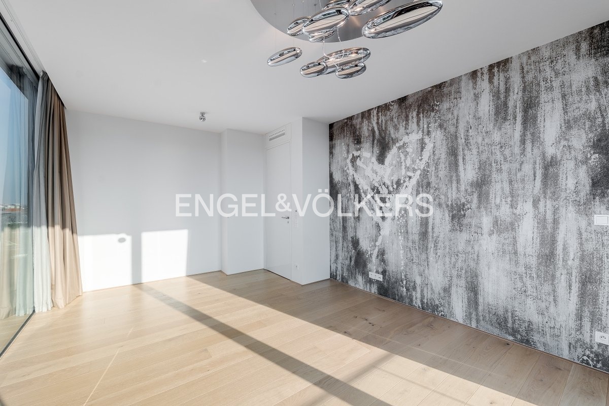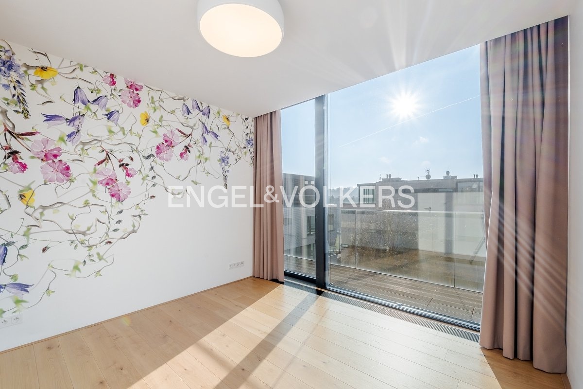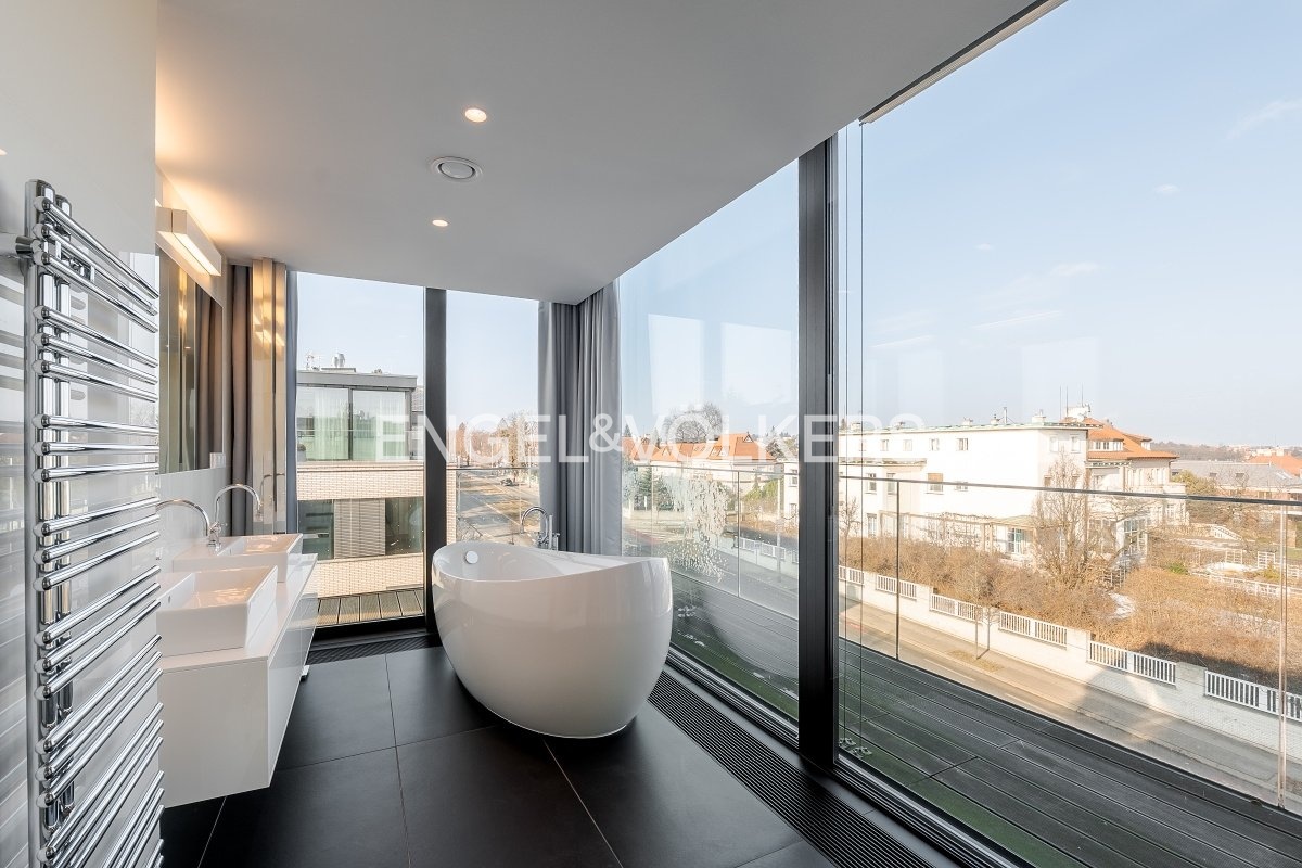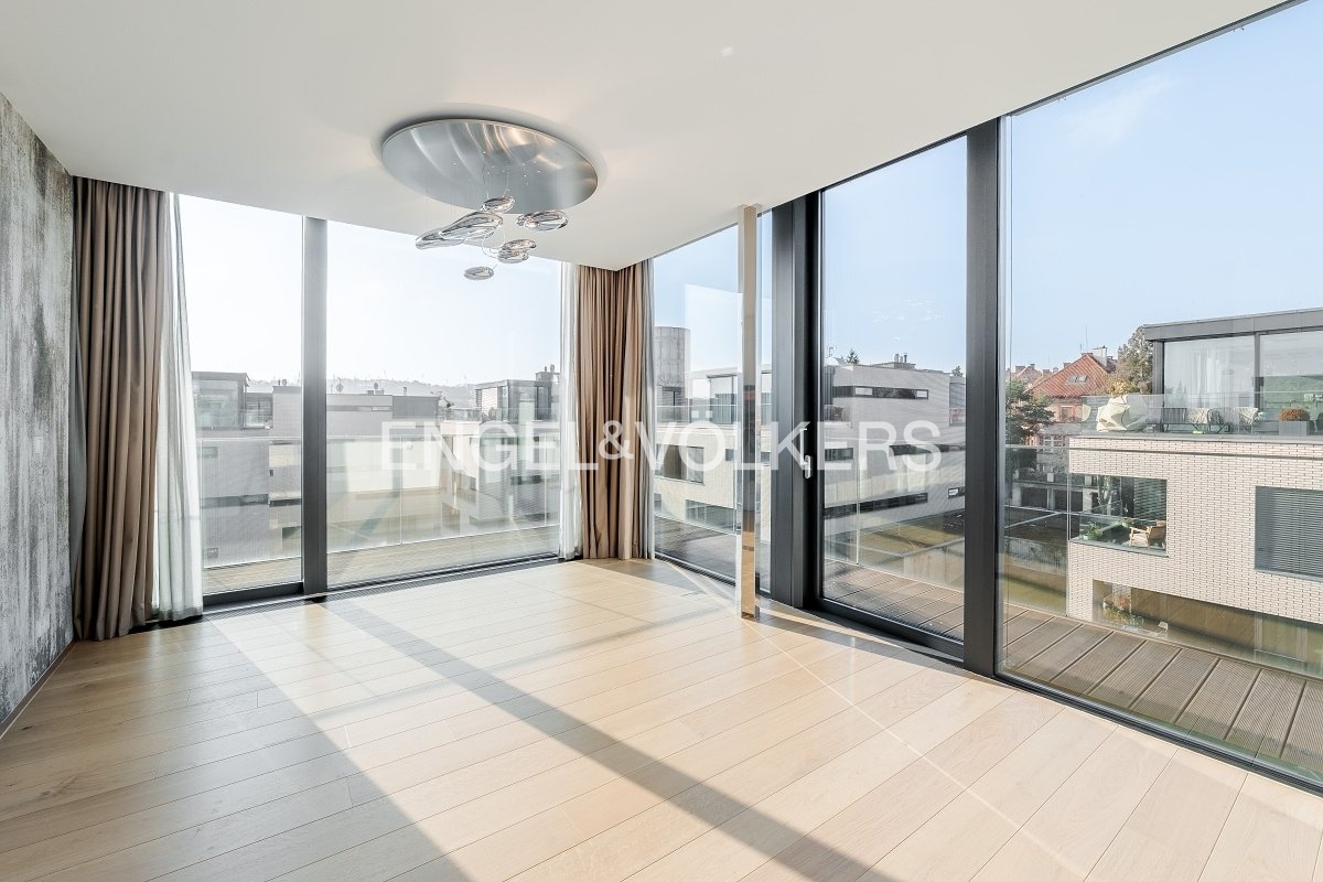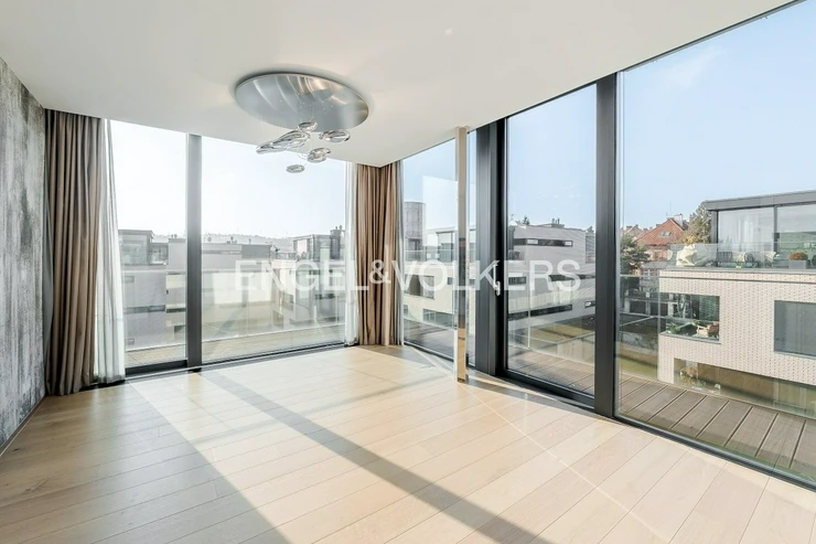 An exceptional unfurnished penthouse with a terrace running around the entire perimeter of the apartment and impressive panoramic views of Prague Castle is offered for rent. The residence is located in the prestigious Royal Triangle project, designed by the renowned architectural studio Schindler Seko, which emphasizes timeless architecture, privacy, and a high standard of living. The apartment is situated on the 4th floor of a modern building within a closed and guarded complex with a reception, a landscaped common garden, and underground parking. The attractive location on the border of the sought-after Střešovice and Ořechovka districts offers a quiet residential environment with excellent accessibility to the city center, the airport, and international schools. Hradčanská and Dejvická metro stations are within walking distance.