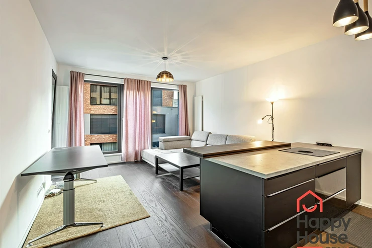 The layout of the apartment includes a spacious entrance hall with access to all rooms, a living room with a kitchenette, a bedroom, a bathroom, a separate toilet, and a balcony. The kitchenette is equipped with a kitchen unit with an island and built-in appliances – Electrolux refrigerator with freezer, Bora ceramic double hob, AEG electric oven, Electrolux dishwasher. The equipment also includes a sofa.