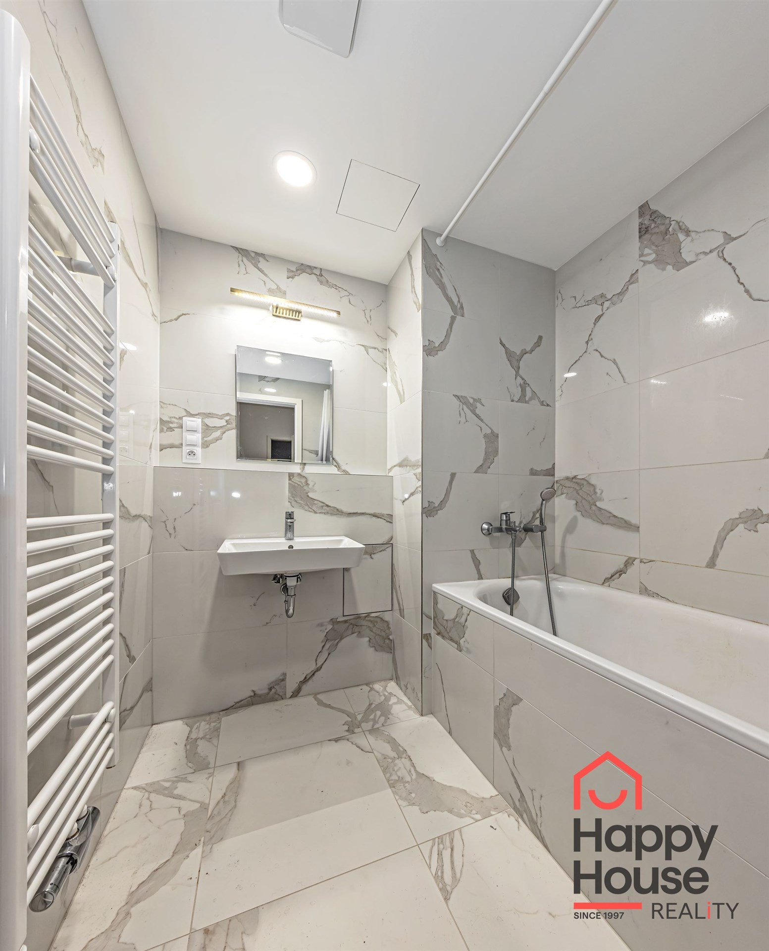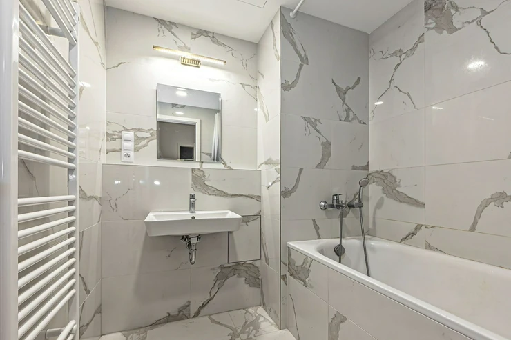 The bathroom has a bathtub, sink, and heating ladder; the toilet is separate and equipped with a sink and washing machine. The floors are wood and tiled and marble in the bathroom. The heating is central. T-Mobile internet connection is available. Street parking is possible – parking zones. The apartment comes with a cellar storage.