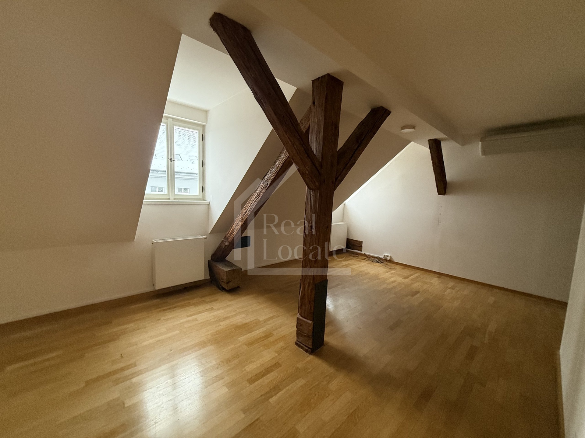 This is an attic apartment with a total area of 89 sqm, offering plenty of natural daylight. The apartment features a fully equipped modern kitchen with all appliances, including a cooker hood, cooktop, electric oven, dishwasher, and fridge with freezer. The interior has an elegant yet rustic touch, highlighted by exposed wooden beams.