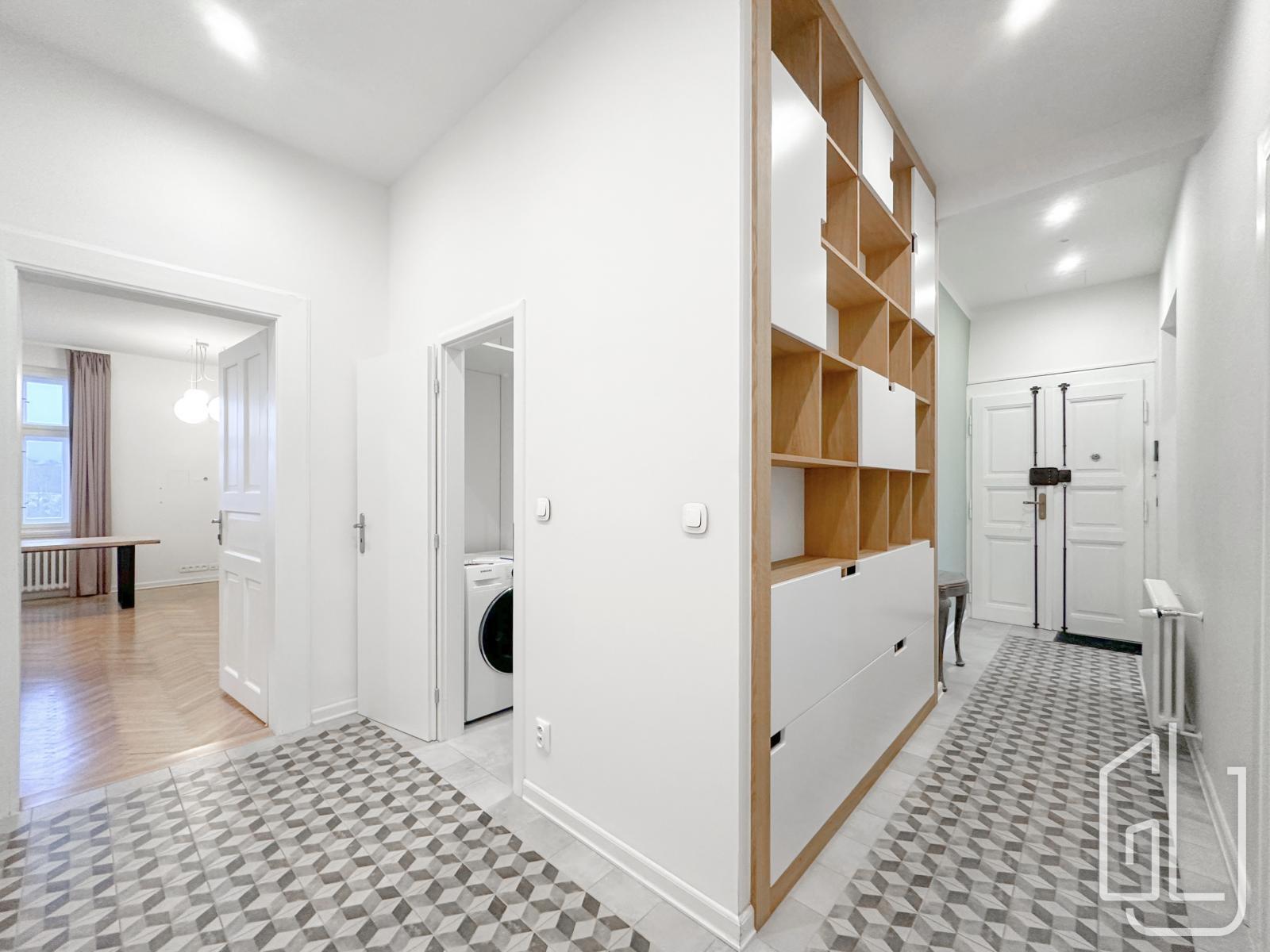 The apartment underwent a complete renovation in 2018, which preserved the character of the original building. During the renovation, the wooden parquet floors were restored, a new modern bathroom with a bathtub and shower was created, and air conditioning was installed. The apartment also features a new fully equipped modern kitchen: fridge, freezer, dishwasher, hob, extractor hood, oven, and microwave. It offers a spacious living room with a kitchen area and ample storage space - built-in wardrobes in the hallway and childrens room, a walk-through closet in the bedroom, and a separate laundry room with a washing machine. The living room with kitchen faces east with a view of the Vltava River, while the bedrooms face west towards the courtyard.