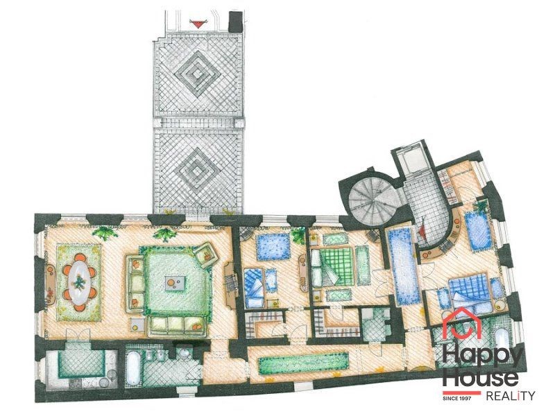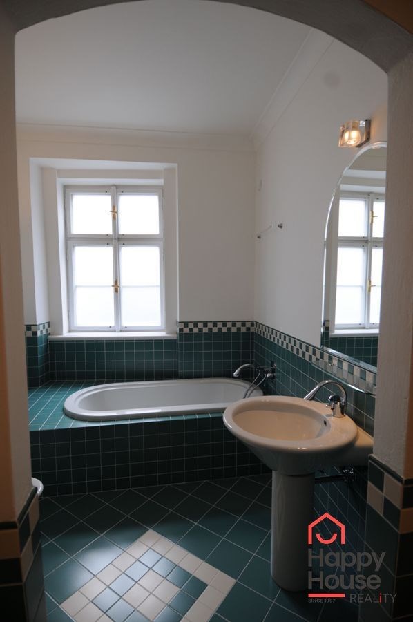 We are offering a spacious, elegant three-bedroom apartment with a terrace on the second floor of a brick Baroque building with an elevator in Prague's Malá Strana. The apartment is partially furnished and features two entrances, one directly from the elevator, an entryway and connecting hall, a spacious living room with dining area, a fully equipped kitchen, two bathrooms, three bedrooms, three closets, and a storage room. One bathroom includes a bathtub, shower, toilet, and bidet, while the second one has a bathtub, toilet, and bidet. The storage room contains a washing machine. Each bedroom has an adjoining closet. The terrace faces south. Telephone, internet, and satellite TV are available. Wooden floors and tiles throughout. Garage parking is available 300 meters from the building for a fee.