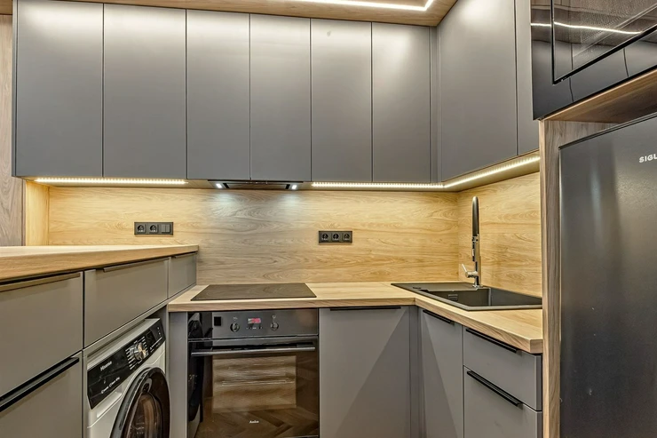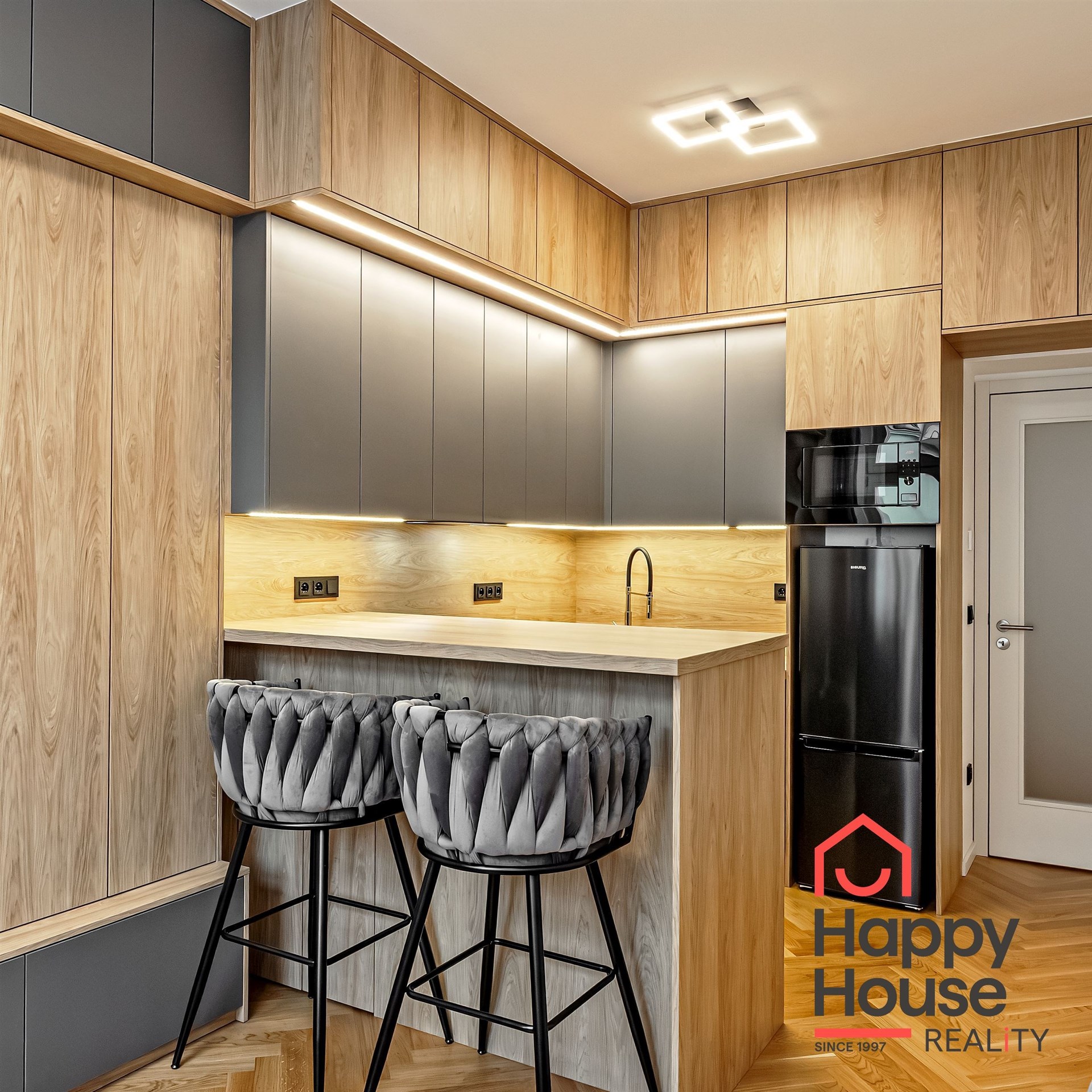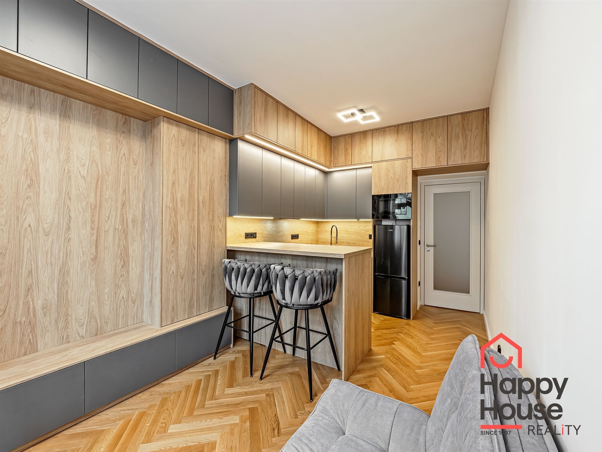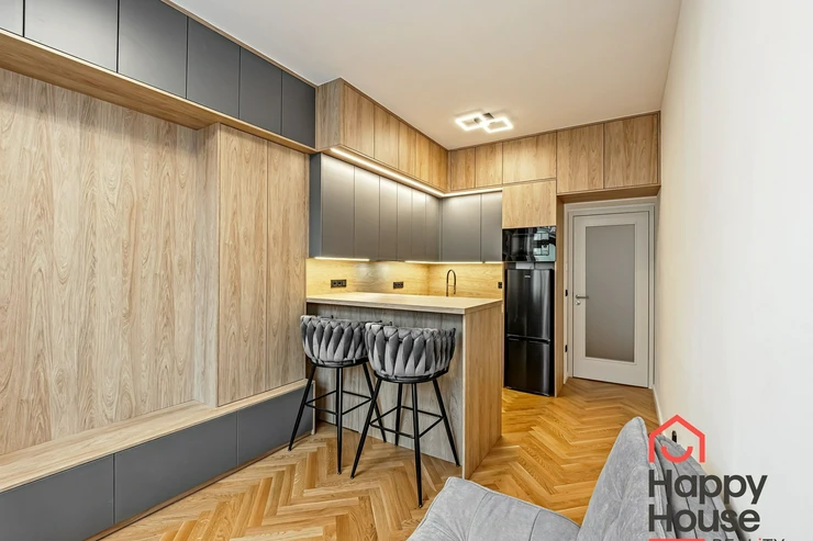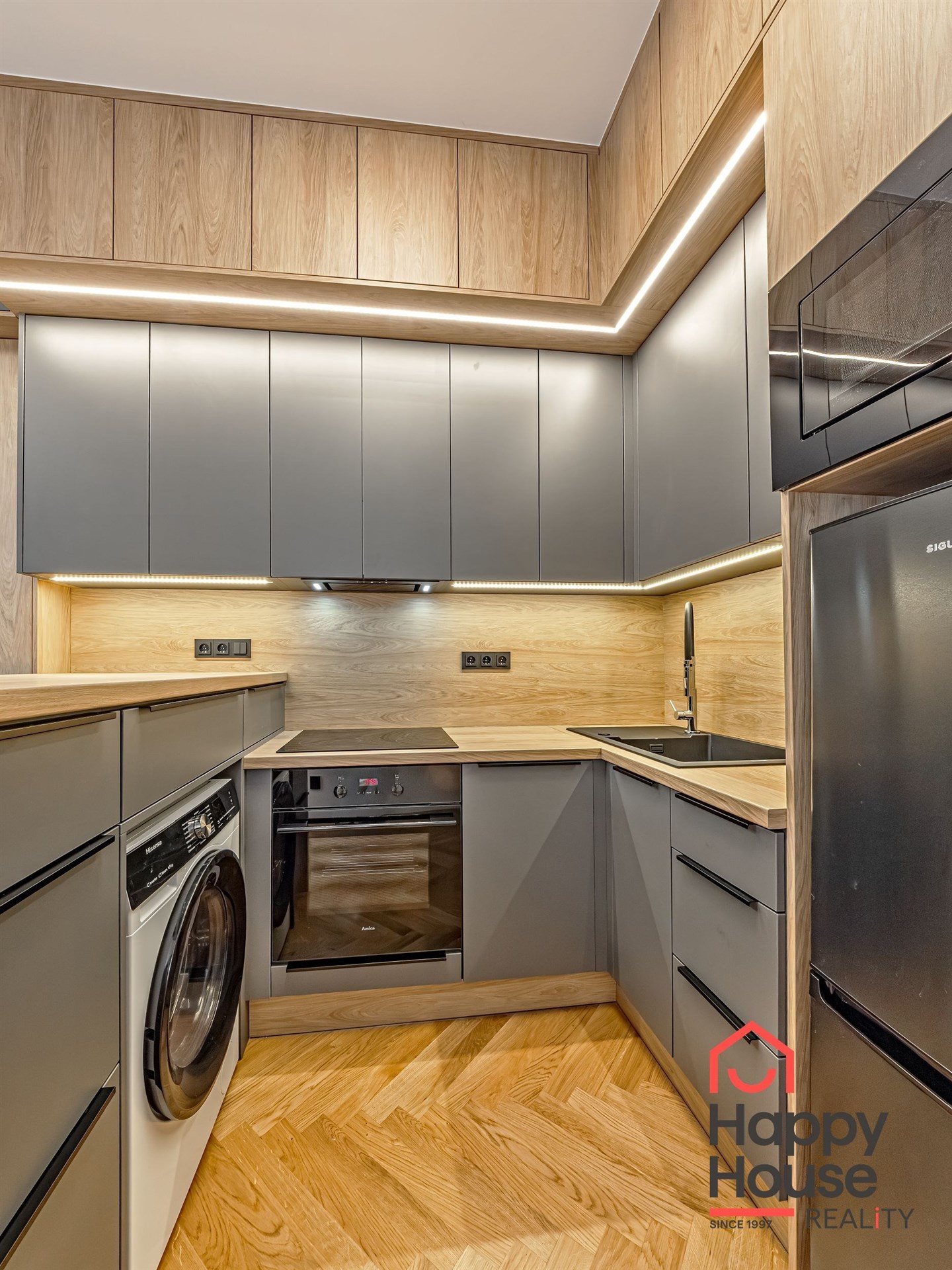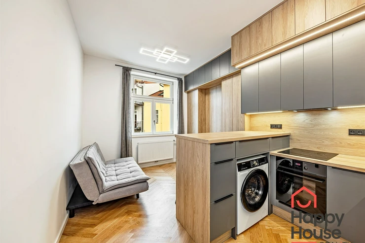The layout of the apartment is very practical, and both rooms are non-transitory. From the entrance hall, you enter the living room with a kitchenette and the bedroom, from which there is access to the balcony. The kitchenette offers all the necessary built-in appliances, namely a ceramic hob, electric and microwave oven, dishwasher, extractor hood, fridge with freezer, and a washer-dryer. The bathroom is equipped with a shower, toilet, and heated towel rail. The apartment has new parquet floors and tiles, and heating is provided by a gas boiler located directly in the building.