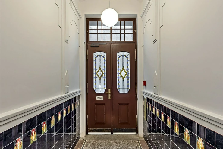 The building has a landscaped communal courtyard, providing a pleasant and quiet environment with seating and the possibility of grilling for the residents of the building. A stroller and bicycle storage room is also available. Parking is possible within residential parking zones. The view from the apartment faces northwest onto the green and quiet courtyard.
