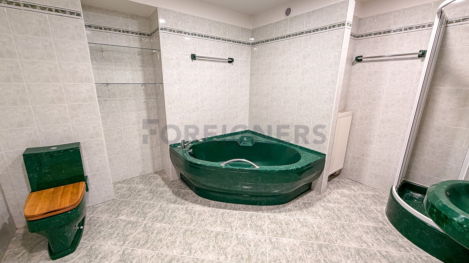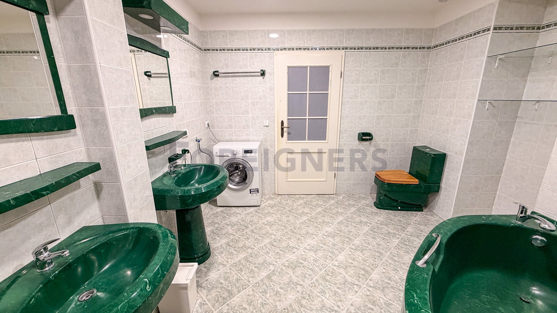 Spacious bathroom with bathtub, shower, two washbasins, toilet, and washing machine