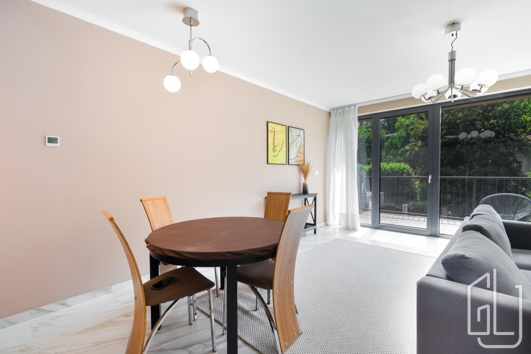The interior of the apartment consists of a spacious living room with a dining area, providing direct access to a large terrace. The apartment is equipped with large-format aluminum windows with triple glazing and external aluminum blinds, ensuring plenty of natural light. The bedroom is separated from the living area by a tinted glass partition and is furnished with a double bed and a built-in wardrobe. The kitchen is fully equipped with appliances, including a refrigerator with freezer, oven with microwave function, cooktop, and dishwasher. The bathroom features a bathtub, washing machine, and dryer.