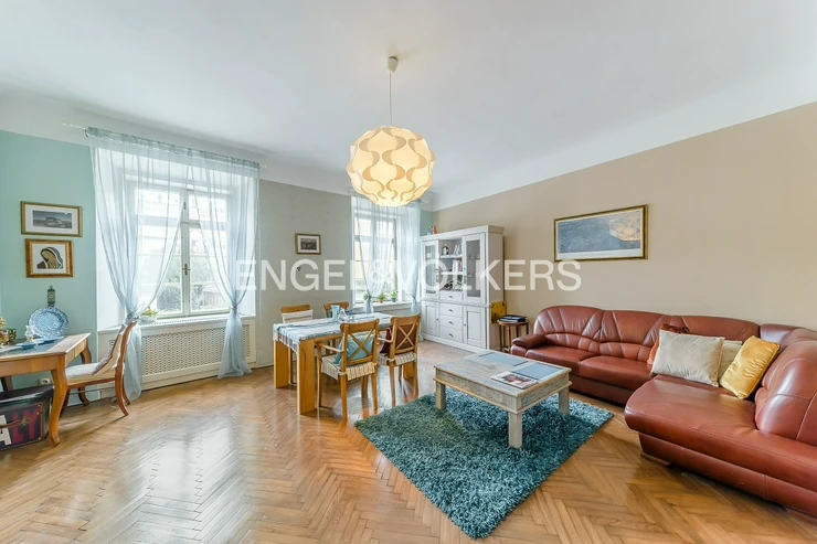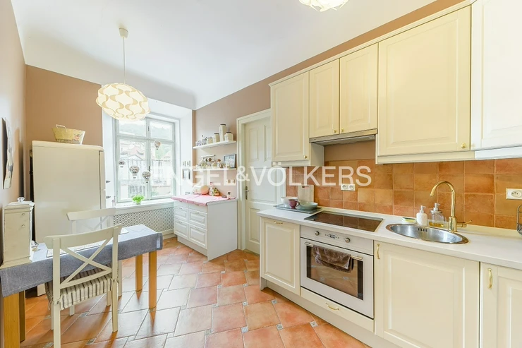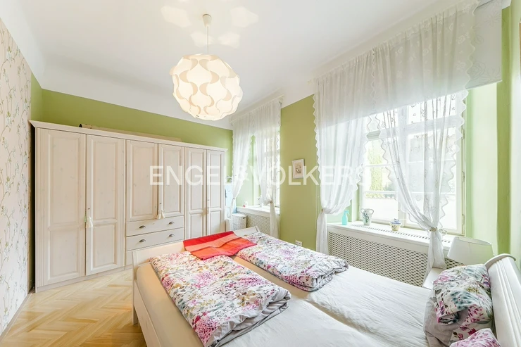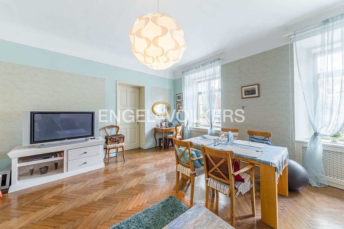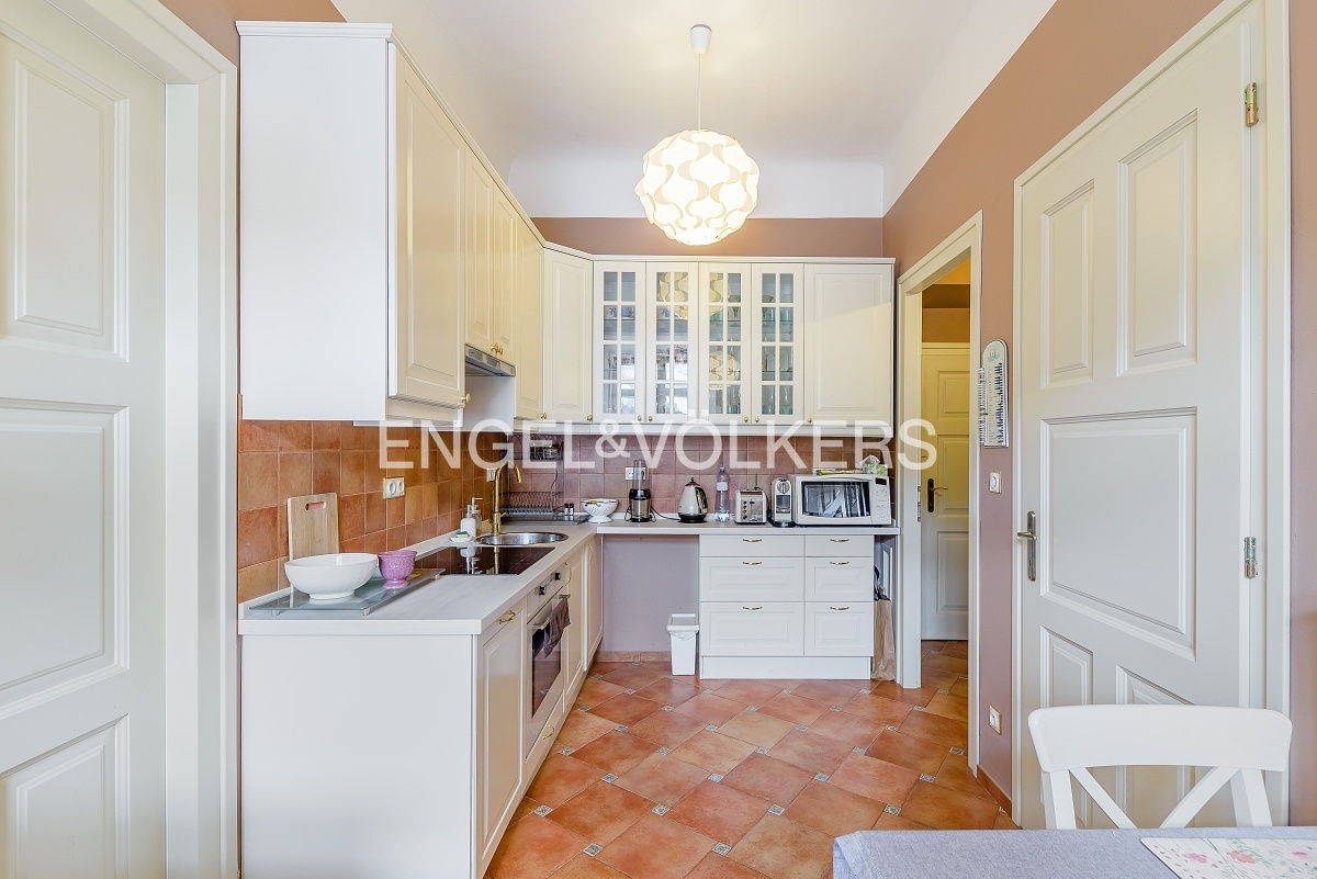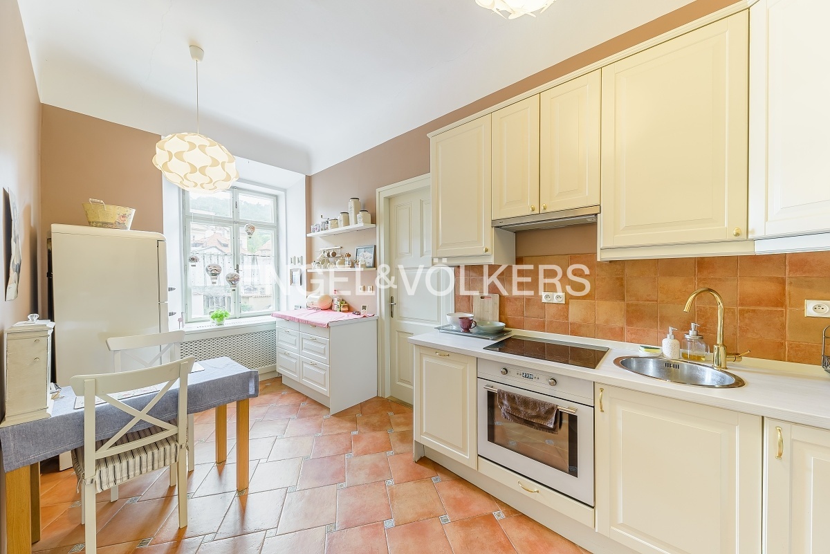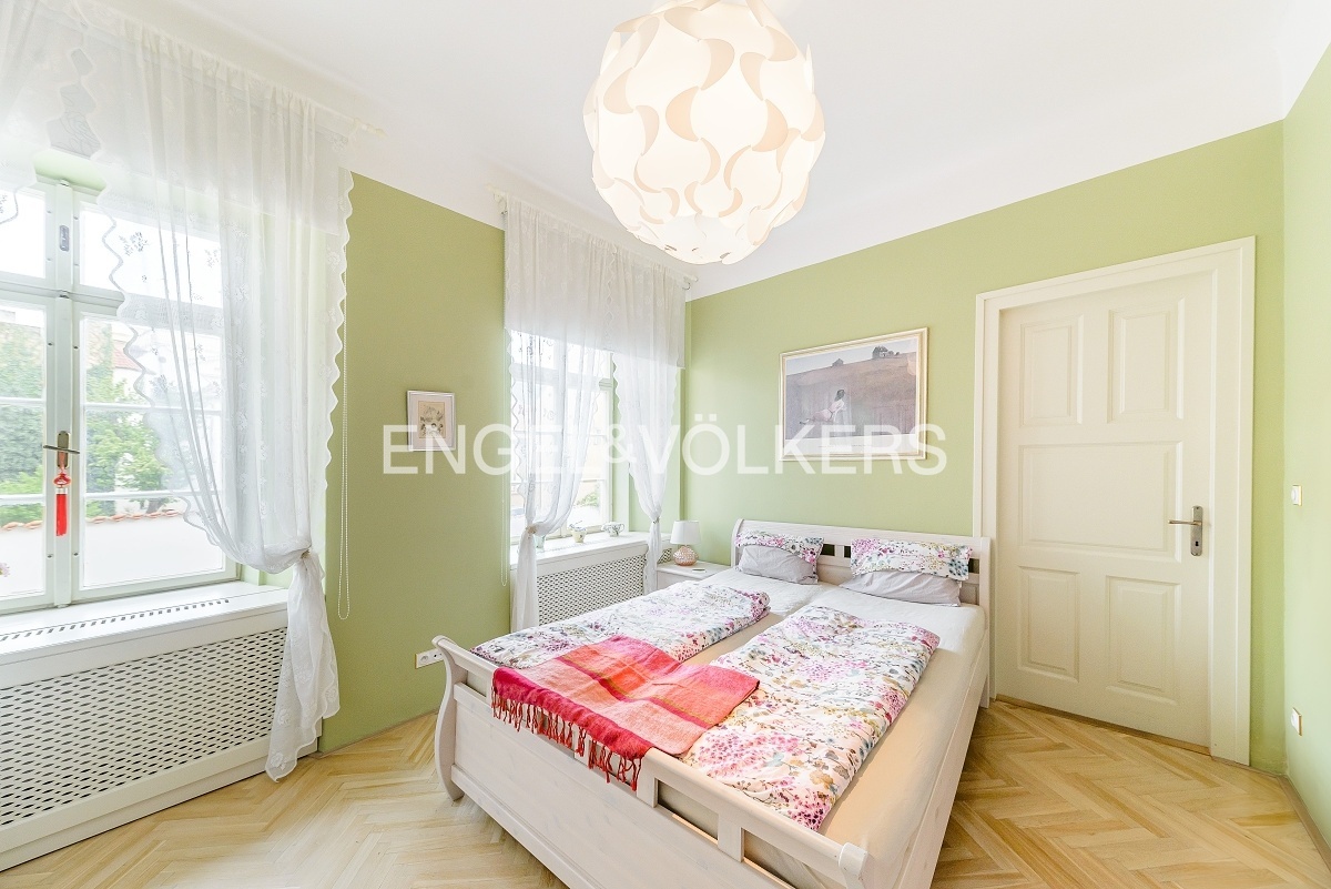 A fully furnished apartment in a unique location on the Malá strana directly below Petřín hill is ready for immediate rent. It is located in a historic apartment building in very good and well-maintained condition with original features such as wooden stairs. The apartment itself is also renovated, and care was taken to preserve the historical atmosphere.