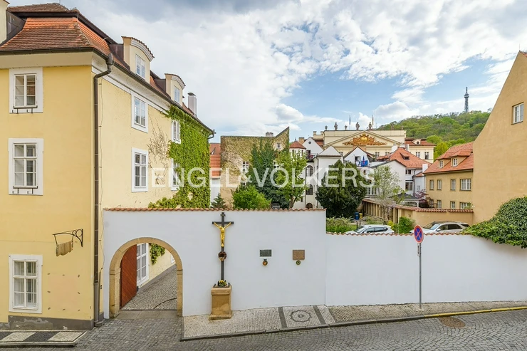 The fully equipped living room offers beautiful views of Petřín Hill. The bedroom has a double bed and a spacious wardrobe. The kitchen is fully equipped with all appliances. In the bathroom, there is a shower. Tenants will also have the possibility to use the seating in a quiet courtyard. The area around the house is full of cafes and restaurants. In the neighborhood, there are international embassies such as German and American, among others.