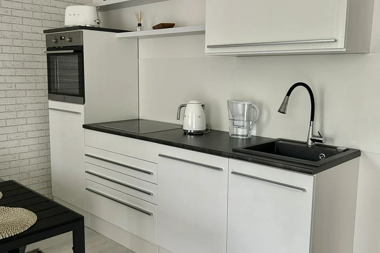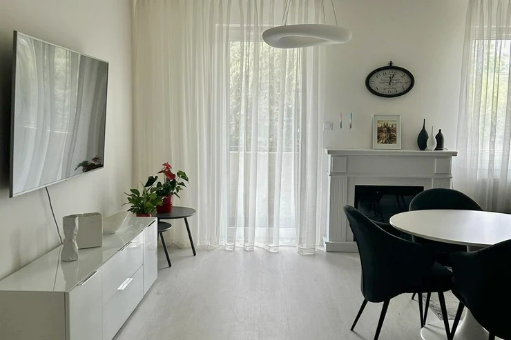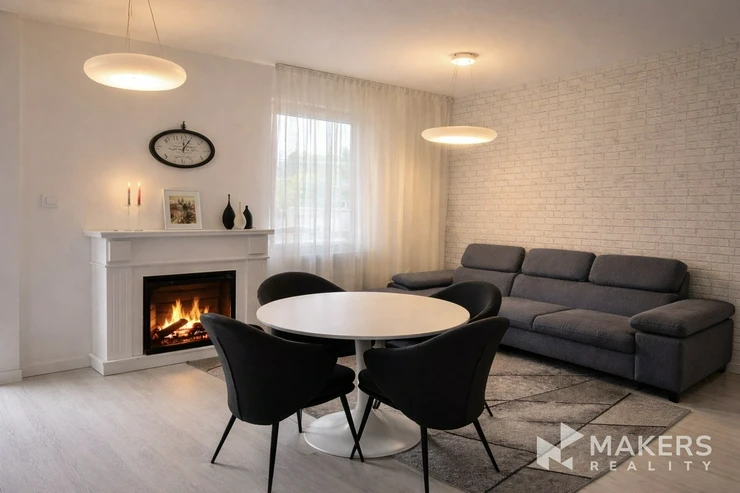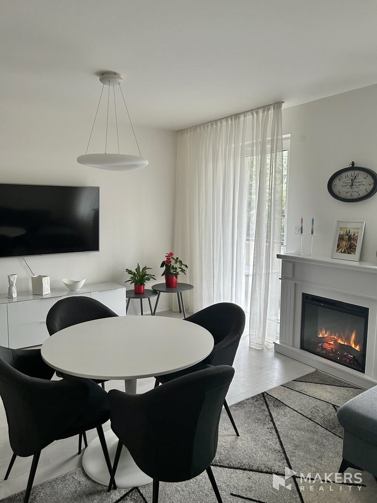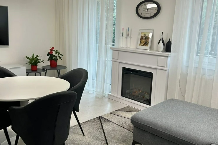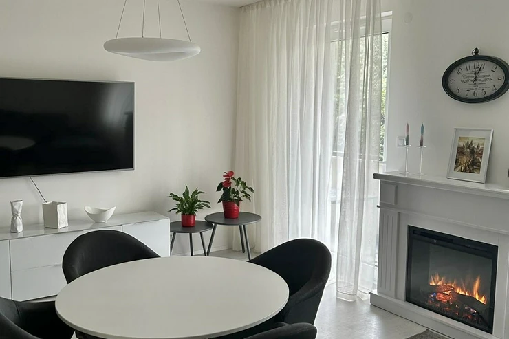The interior is thoughtfully designed and equipped with everything needed for comfortable living. The open-plan living area features a modern kitchenette with appliances including electric oven, dishwasher, stove, fridge, electric kettle. There is a dining area with a table and four chairs, a comfortable corner sofa bed, a television, and a stylish electric fireplace that adds a cozy touch to the space.