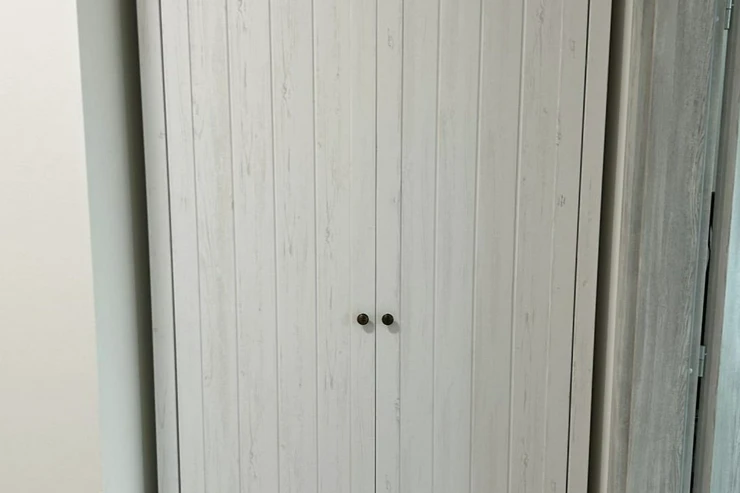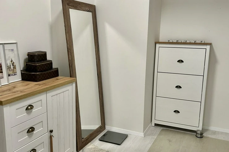 In the hallway, there is a wardrobe, a chest of drawers, a full-length mirror, and a shoe rack — providing ample storage space. The bathroom is fitted with a shower, a washing machine, and storage cabinets. One of the highlights of the apartment is the spacious balcony with outdoor seating and a view of greenery — perfect for morning coffee or relaxing in the evening.