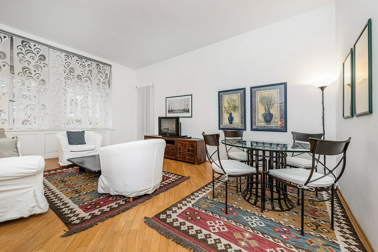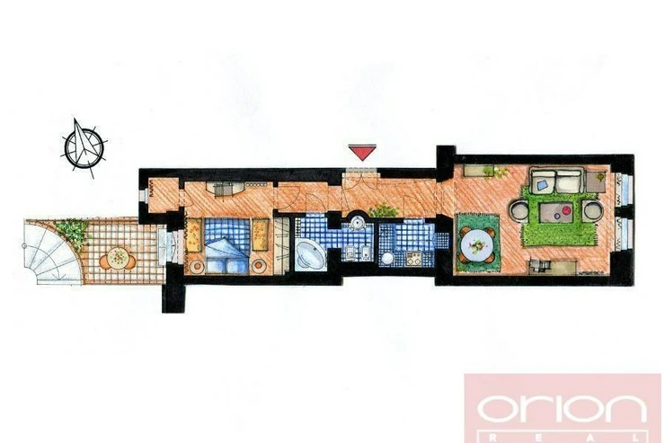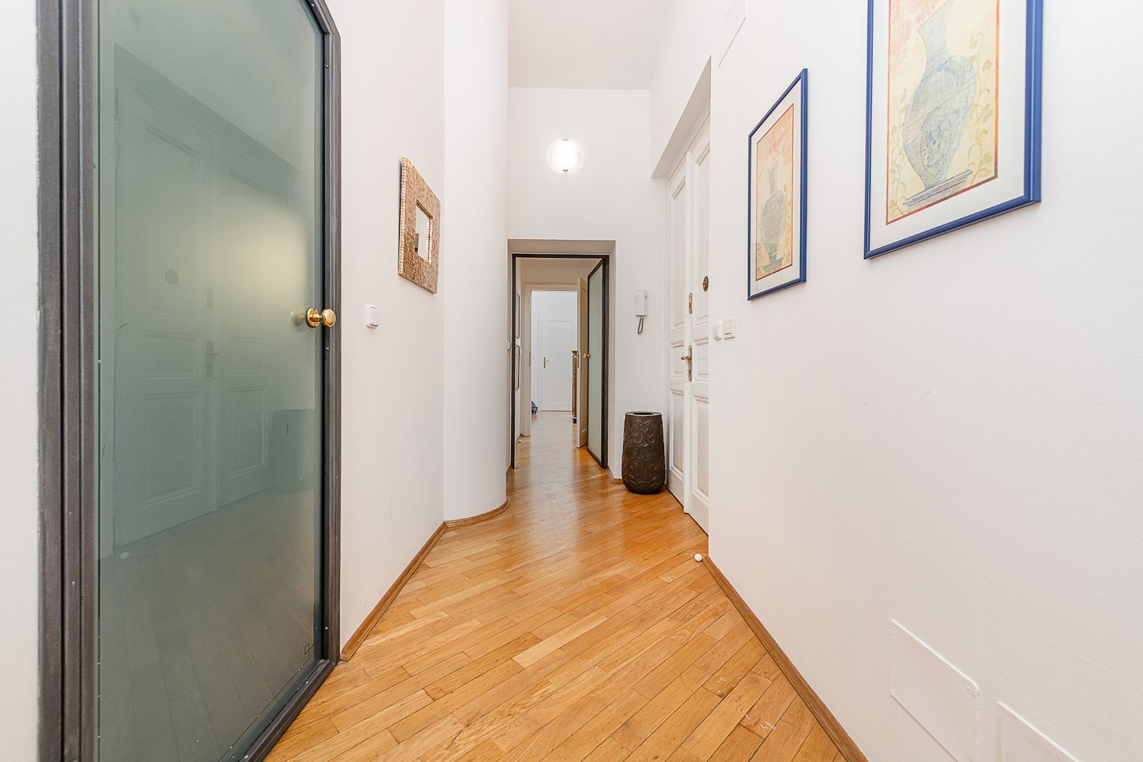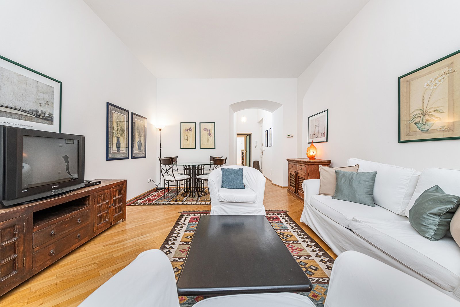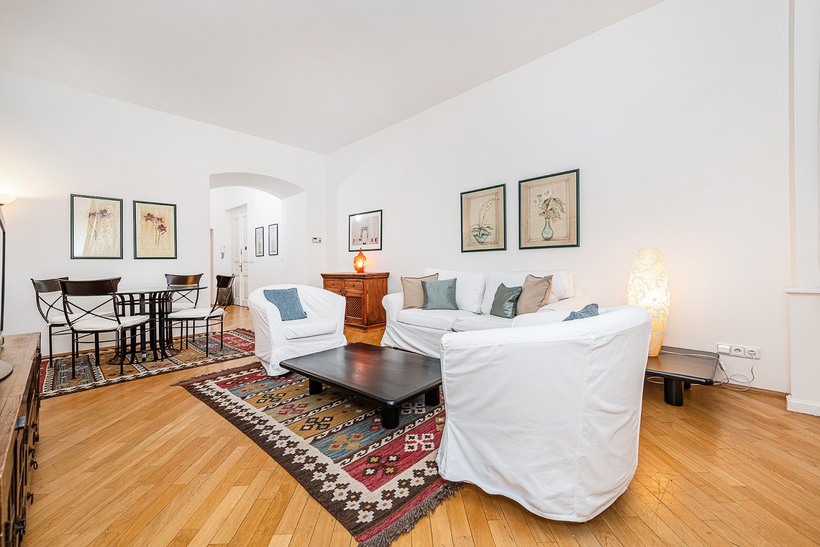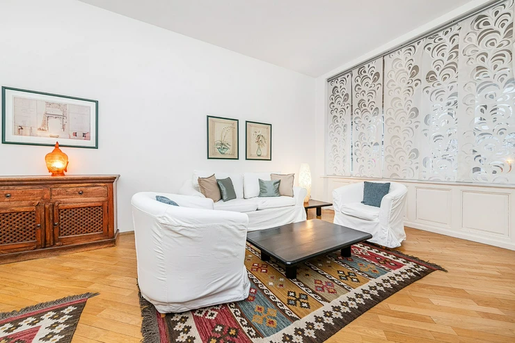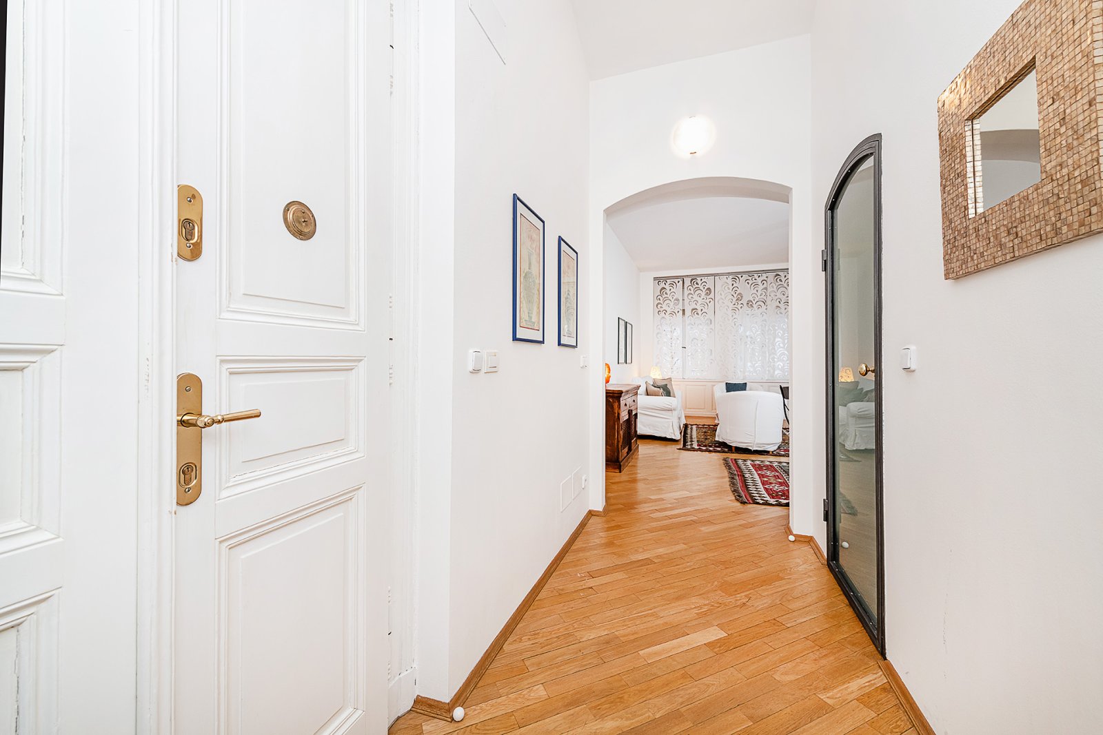 We offer for rent a fully furnished one bedroom apartment (54 sqm) with a small private garden (6 sqm) on the ground floor of a house in the neo-baroque style, which was sensitively renovated while preserving the original building elements. The house is located in a popular residential quarter of Prague 2 - Vinohrady, near the Riegrovy sady park, opposite the Vinohrady Theater, a 5-minute walk from Wenceslas Square and the National Museum. The apartment offers an entrance hall, a living room connected to the dining room, a fully equipped kitchen, a bedroom, a dressing room, a bathroom with a bathtub, toilet and bidet, a pantry. The apartment is equipped with wooden parquet and tile floors, satellite, internet connection. Tenants can use the shared garden in the courtyard of the house spread over two levels with carefully maintained greenery and a fountain. The greenery together with the illuminated fountain create an impressive atmosphere, especially at night. Sought-after location of Vinohrady, all civic amenities in the area. Excellent transport connections by public transport and car, metro and tram station on Náměstí Míru a few steps from the house. In the immediate vicinity there are many restaurants, cafes, bistros, local shops.