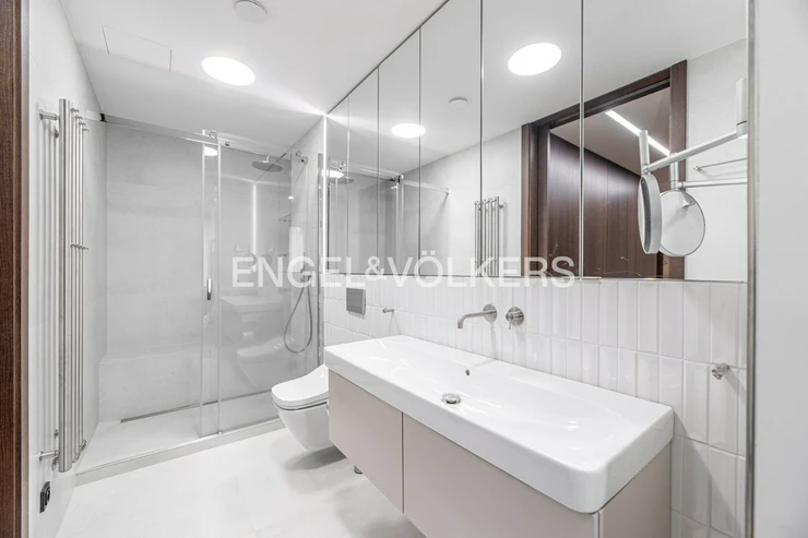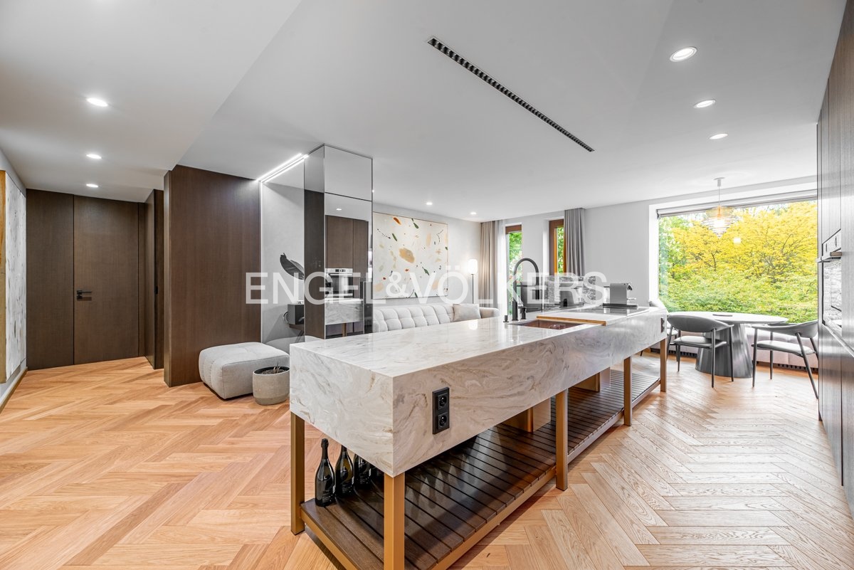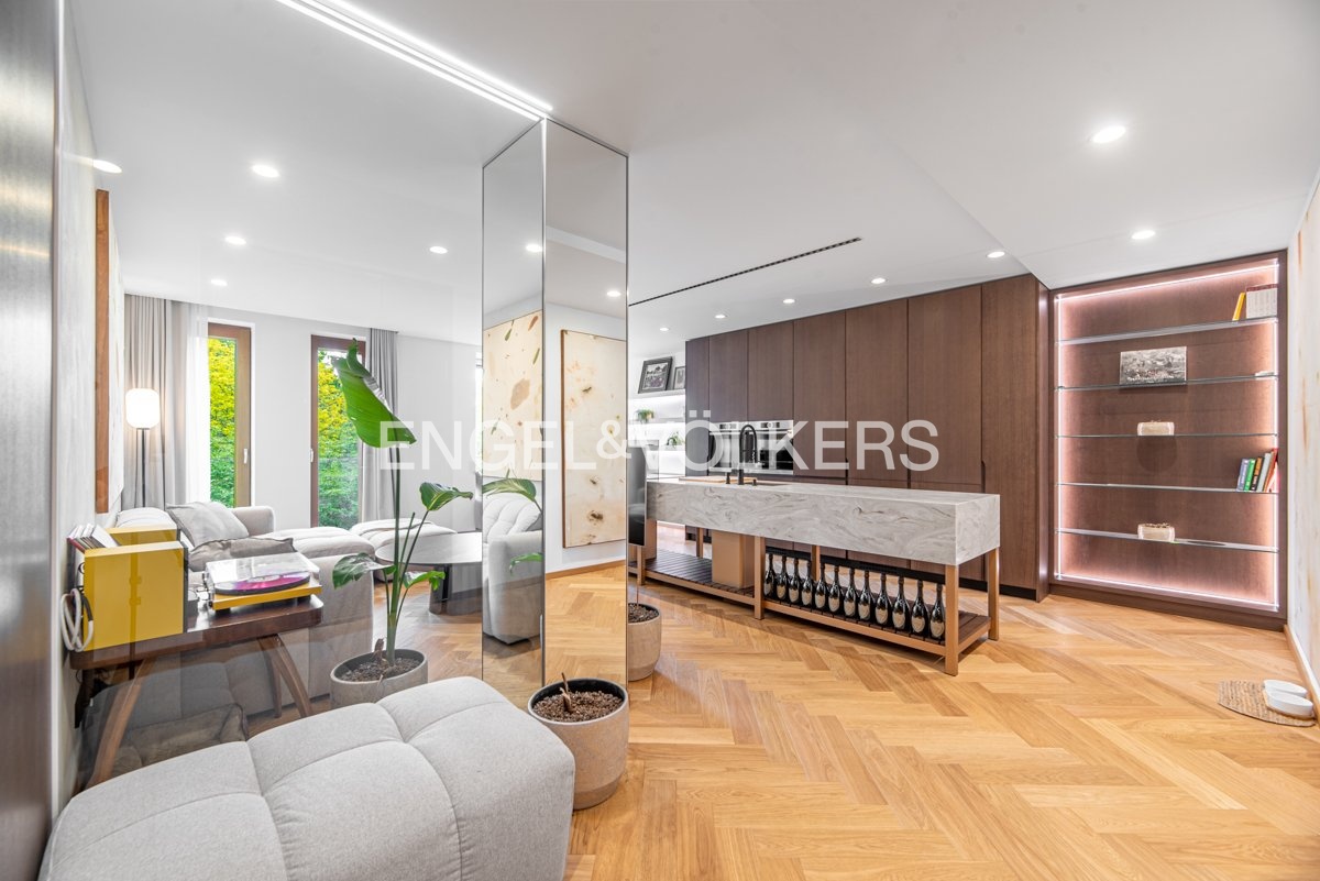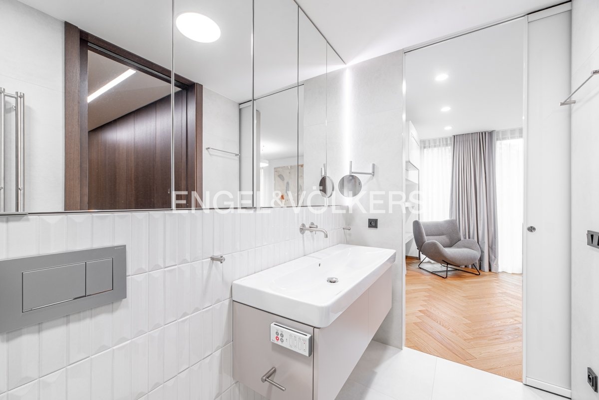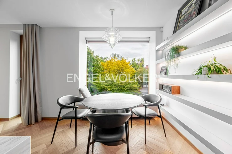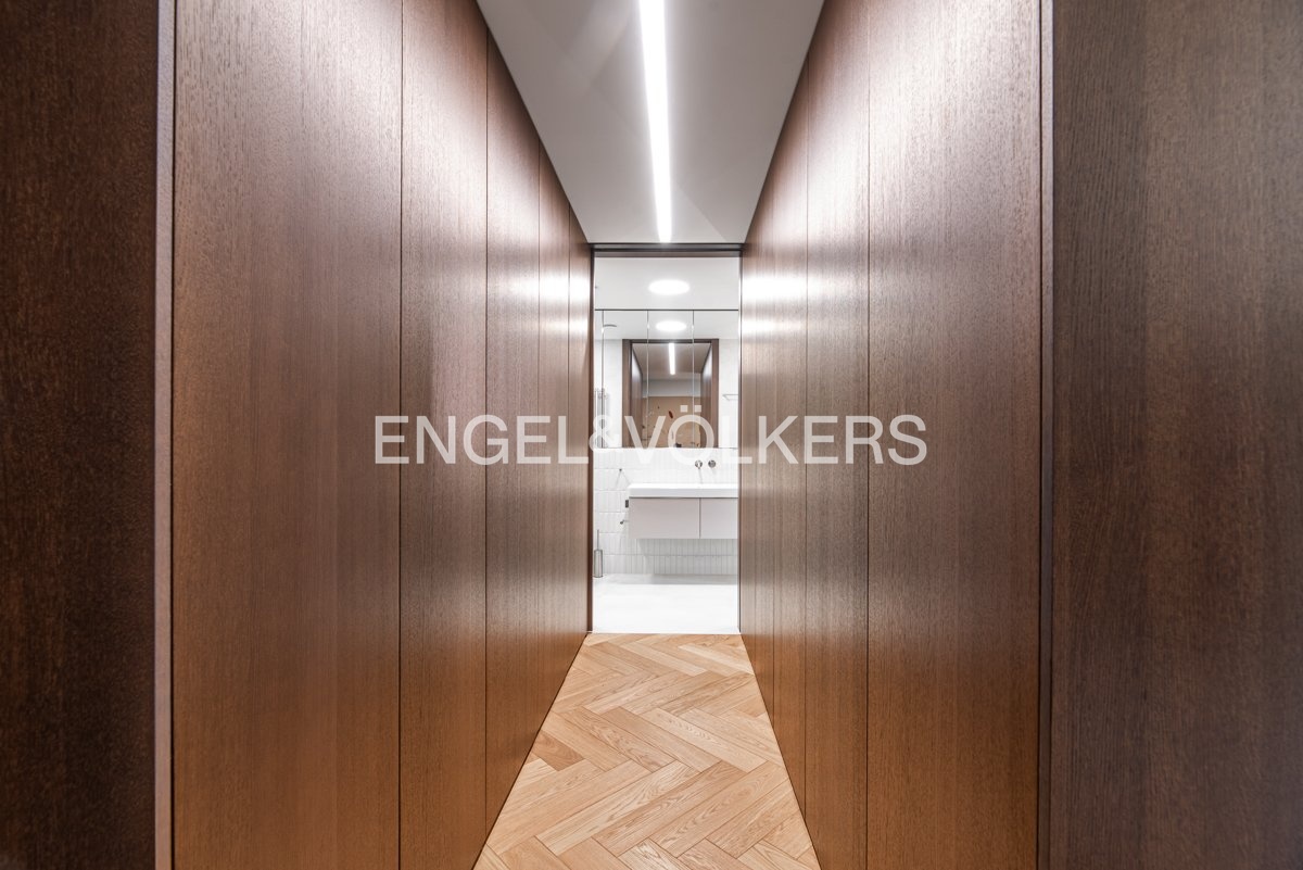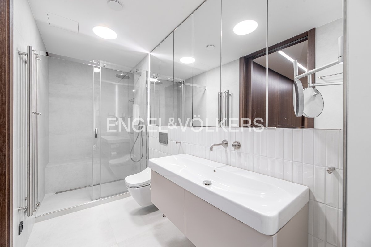 The apartment with a layout of 2+kt and an area of 87 m² is carefully designed to the last detail. You will find a spacious living room connected to a fully equipped kitchen, a separate guest toilet, a walk-in closet, a bathroom with a shower and toilet and a comfortable bedroom. The interior design was created by a renowned architectural studio, which emphasised the maximum use of space. Each room has built-in wardrobes and additional storage spaces that perfectly match the elegant and timeless style of the apartment. Every element in the interior has been carefully selected to meet the highest standards of contemporary living.