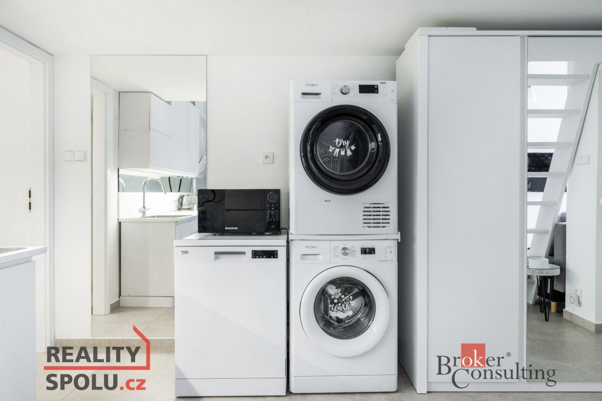 Dispozice bytu jsou: vstupní předsíň, vestavná šatní skříň, pračka, sušička, koupelna se sprchovým koutem a toaletou, obývací pokoj, kde je rozkládací sedací souprava, a kuchyňský kout( lednice, sporák, myčka) a vestavné zapuštěné patro na spaní.