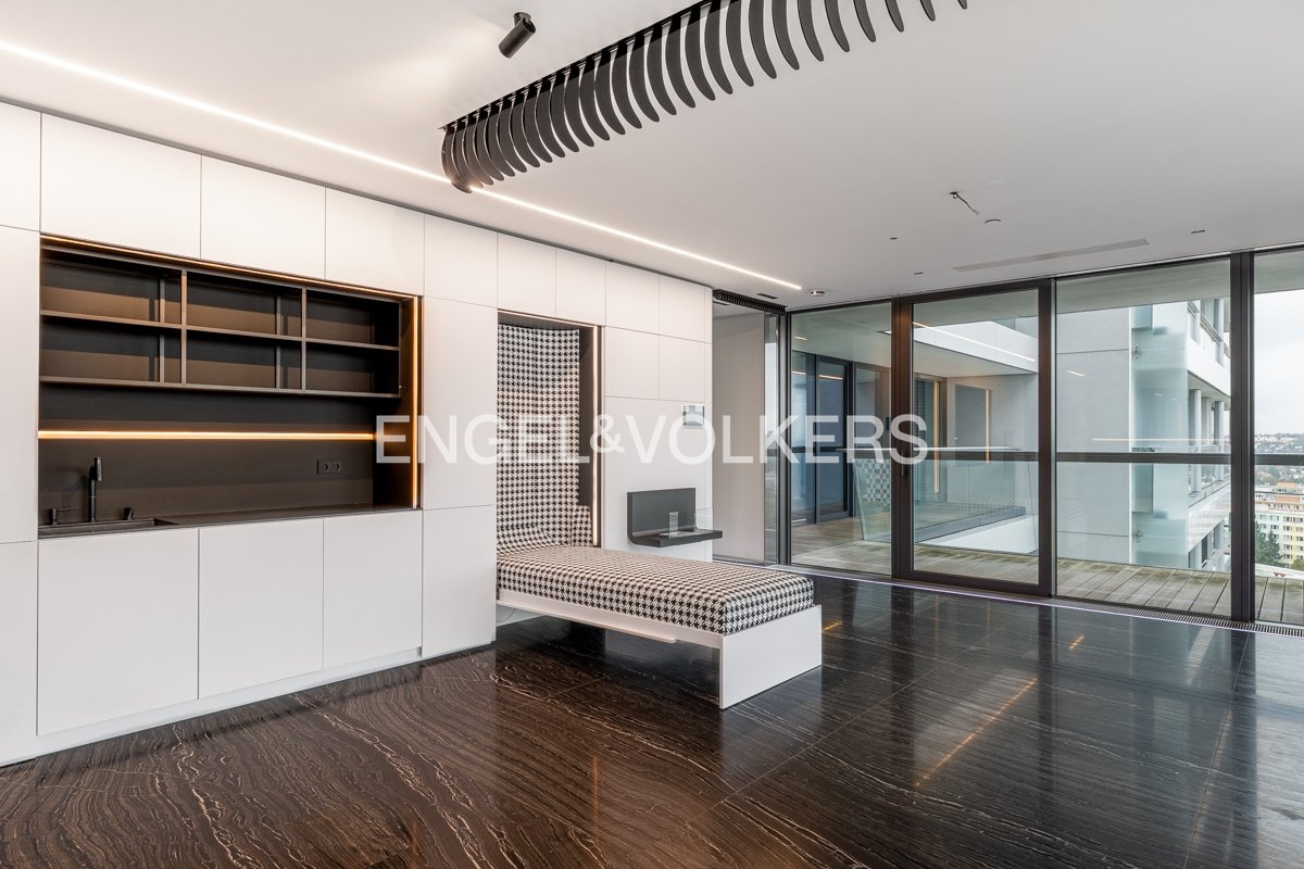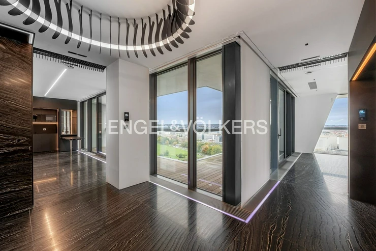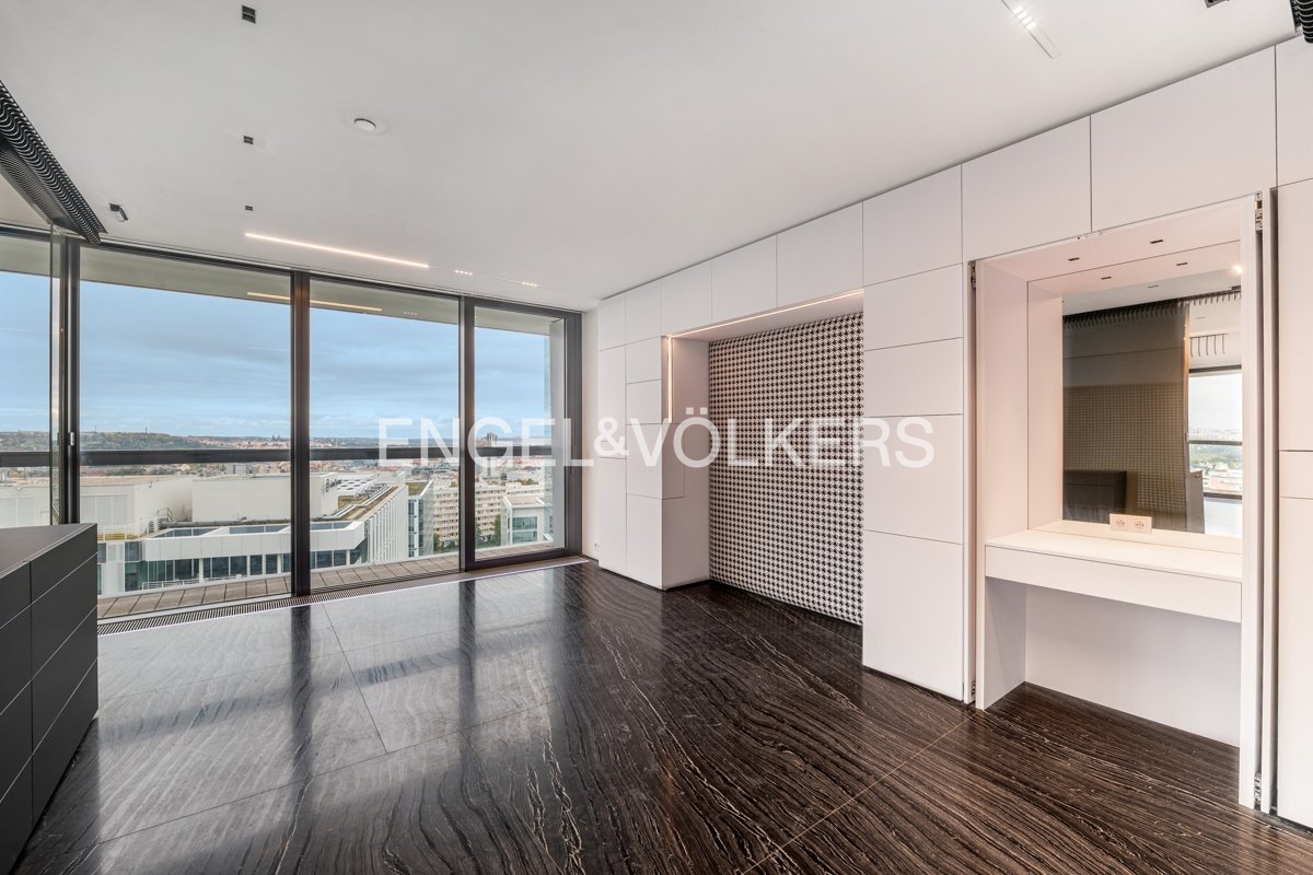 We offer for rent an exceptionally spacious and premium furnished 3+kt apartment with an area of 160 m², located on the 15th floor of the middle tower of the prestigious V Tower residence – the tallest and most exclusive residential building in Prague. The apartment boasts a terrace surrounding the entire apartment, offering breathtaking panoramic views of Prague and access from every living room.