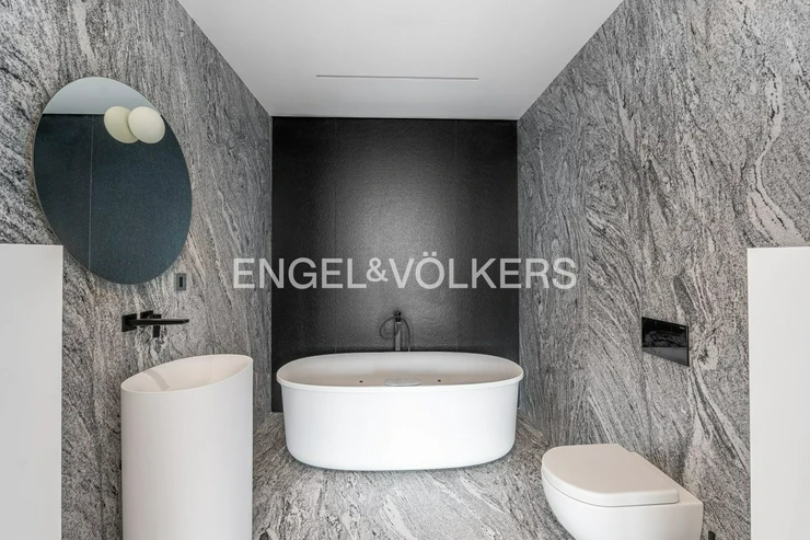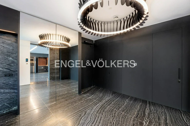 The dominant feature of the apartment is a spacious living area with a custom-designed kitchen. There are also two bedrooms, two large bathrooms with bathtubs, a separate toilet with a utility room, and a dressing room. The interior is designed with an emphasis on detail and practicality, as evidenced by the built-in multifunctional furniture and ample storage space. The entire apartment is finished with top-quality materials – natural marble floors and bathrooms, and premium fittings.