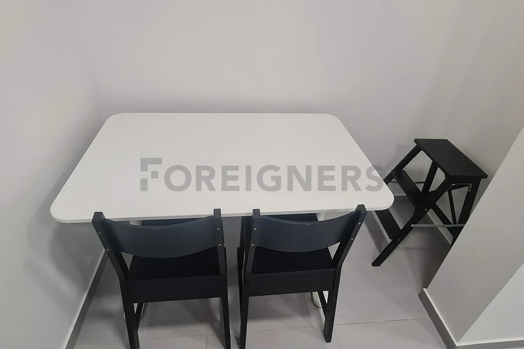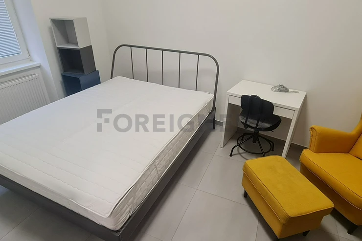 This flat is offered partly furnished where the kitchen unit is equipped with a stove, oven, hood, microwave, fridge with the freezer and built-in wardrobe. In the bathroom are a sink, toilet, shower corner and washing machine. The apartment has A/C and can be furnished after the agreement with the landlord.