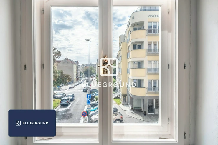 Blueground offers a fully furnished 2+kk apartment for rent in Prague 10, available for stays of one month or longer. Located in a charming historic building, this modern apartment spans 66 m². It features a cozy bedroom and a comfortable living room with ample natural light. Just an 8-minute walk from the vibrant Vinohrady district, the apartment is ideal for couples or individuals seeking comfort and convenience. It also includes a dedicated workspace and high-speed internet, making it perfect for remote work. This rental offers a perfect balance of style, functionality, and an excellent location.