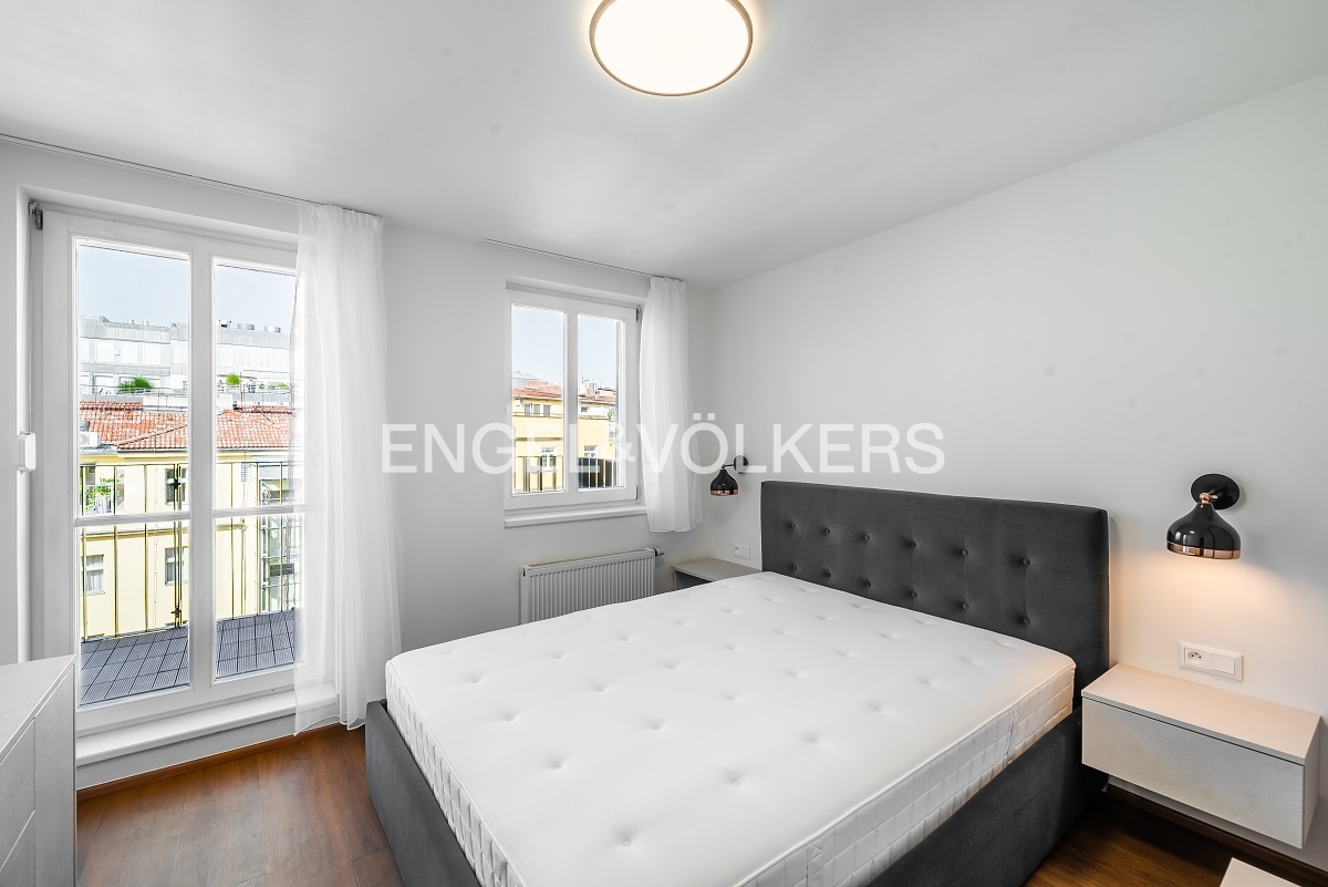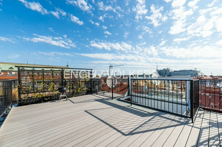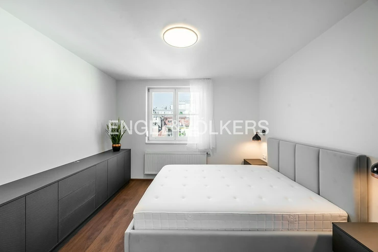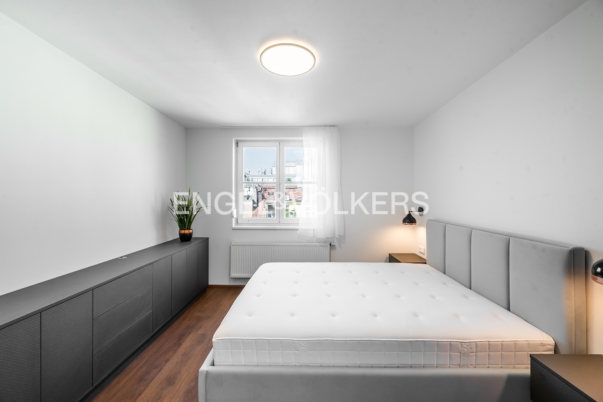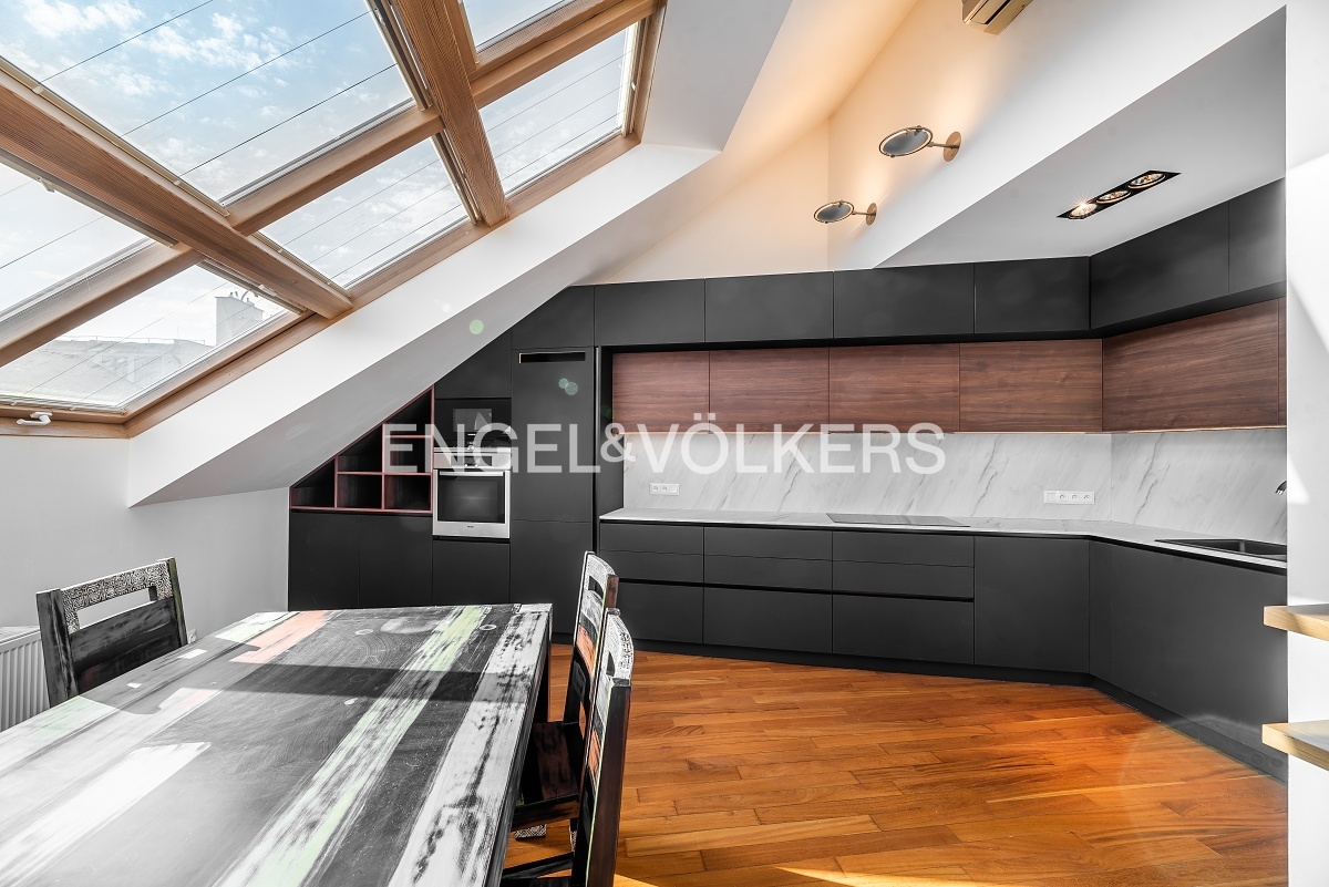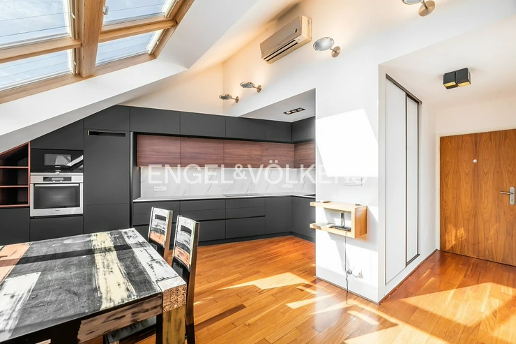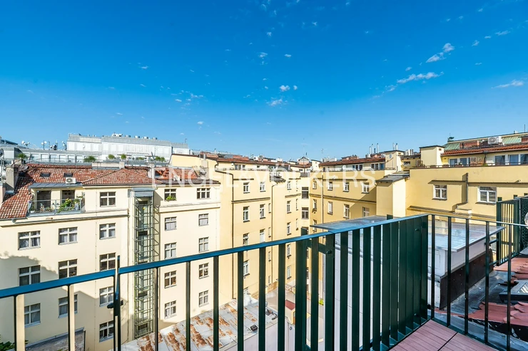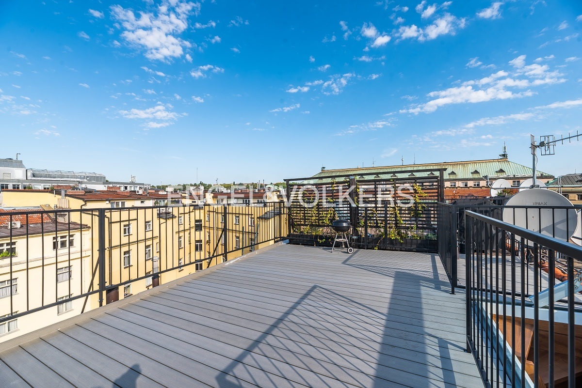 Neo-Baroque apartment building after complete renovation with a new lift. Completely furnished, renovated duplex with a layout 3+kt with a balcony facing the courtyard and a roof terrace.