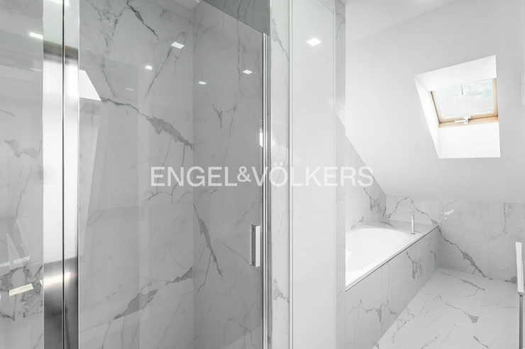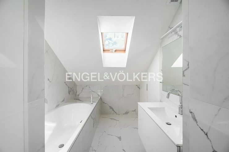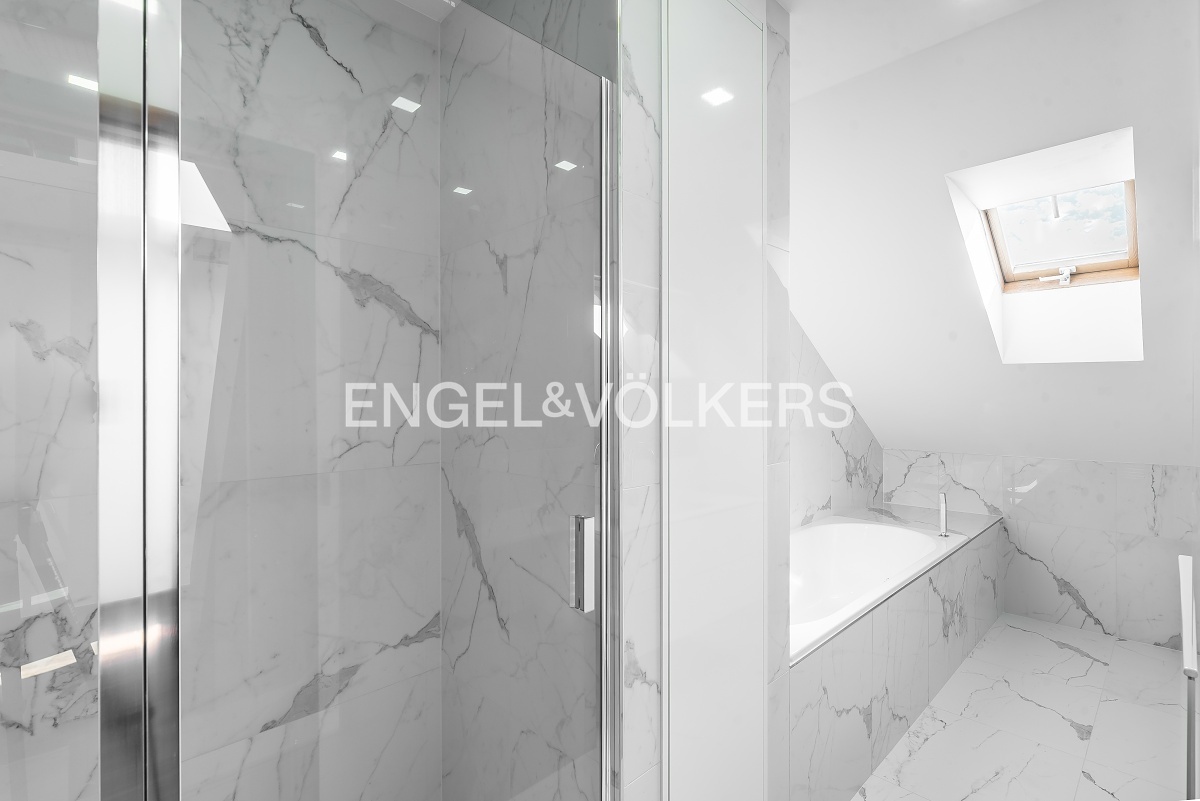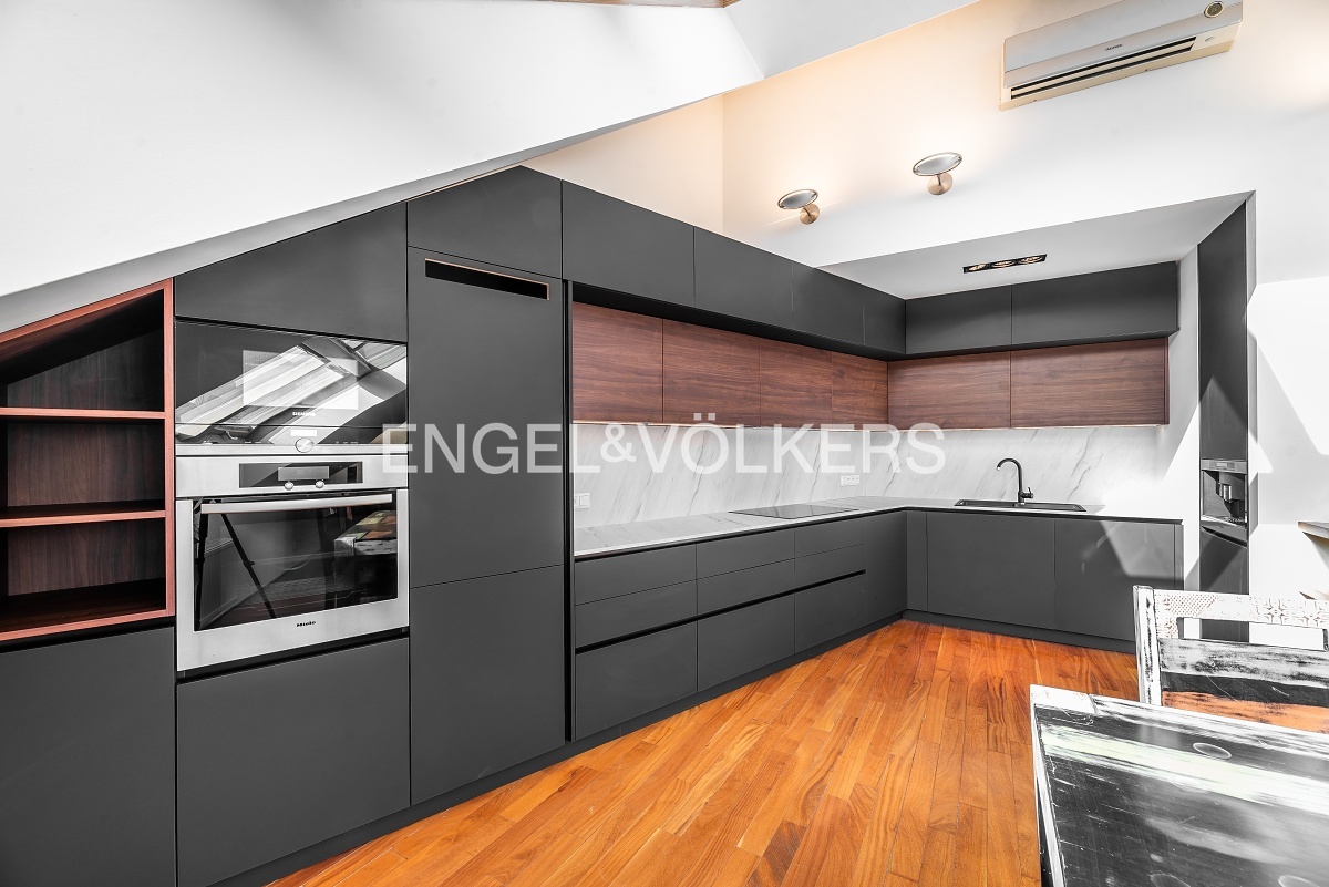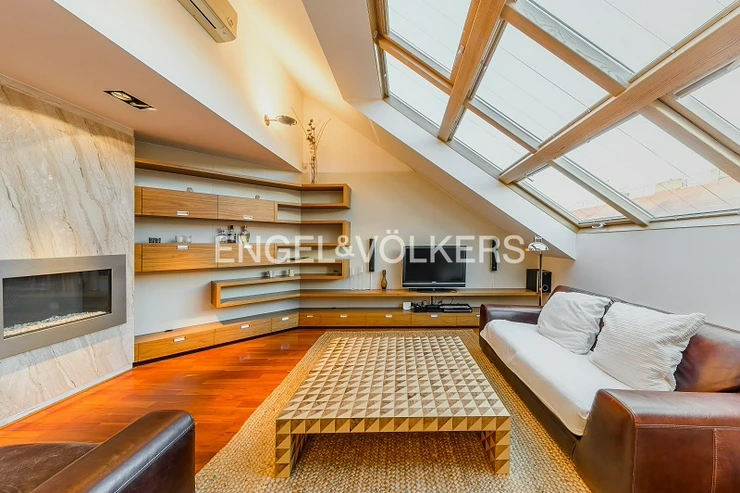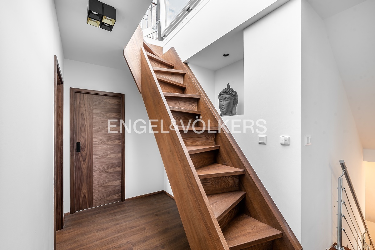 The heart of the apartment is a spacious room with a gas fireplace and a high-quality sofa in the dining area connected to a kitchen corner. The kitchen is equipped with all appliances, including the American fridge and wine cooler. On the upper floor, there is a sleeping area with two bedrooms and storage space. The master bedroom has access to the balcony. In the bathroom, there is a shower and tub; the toilet is separate. At the entrance of the apartment is another separate toilet; there is also a storage space and a utility room. From the top floor of the apartment, there is an automatic attic staircase, leading to the spacious roof terrace, which offers great views.