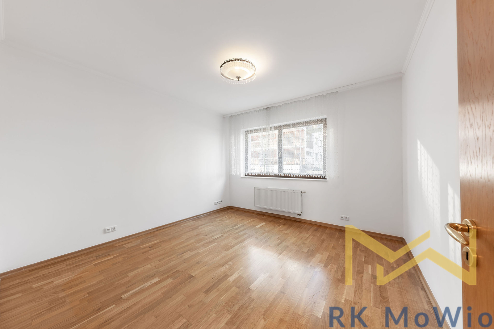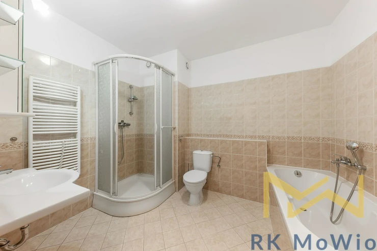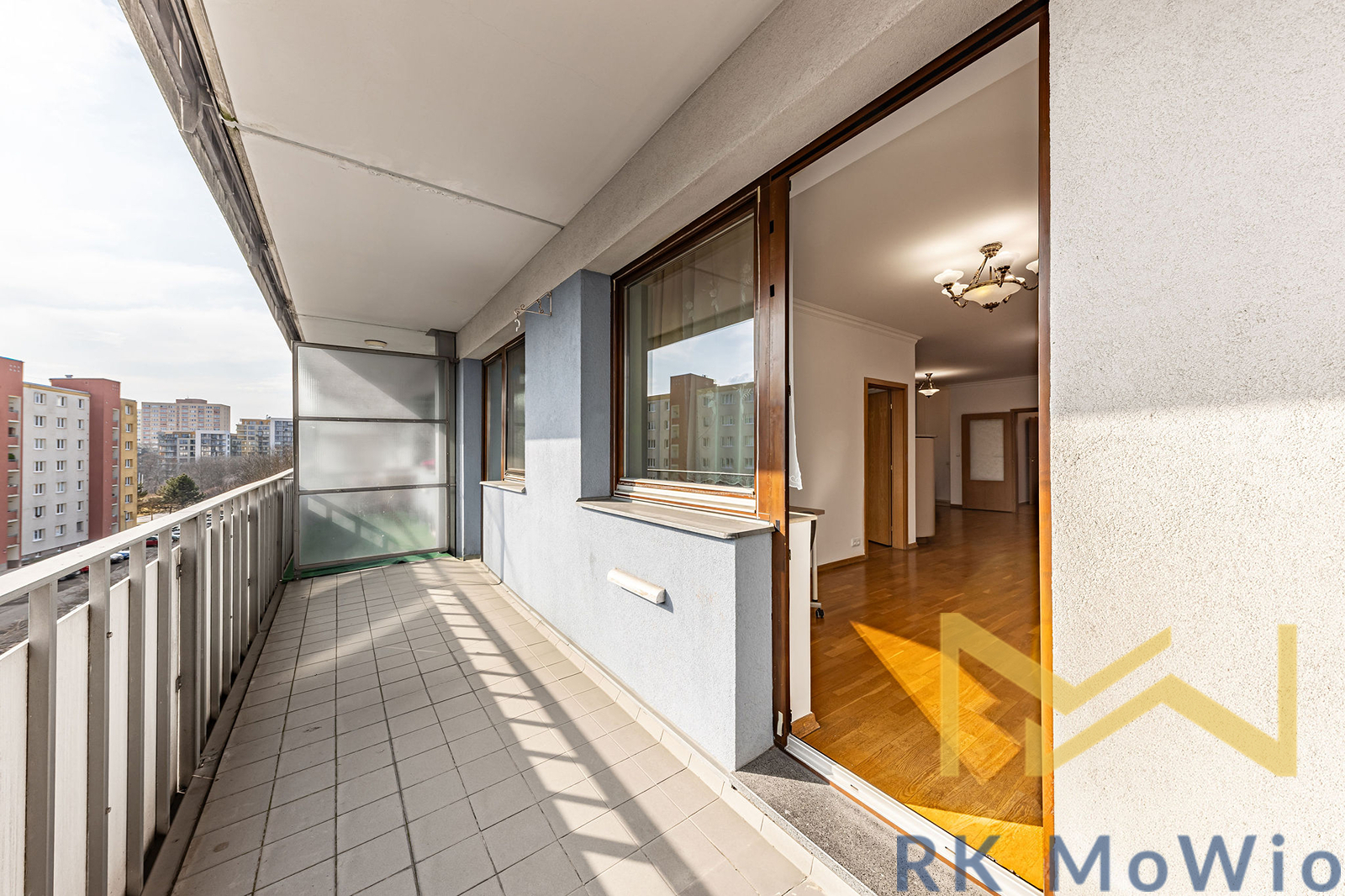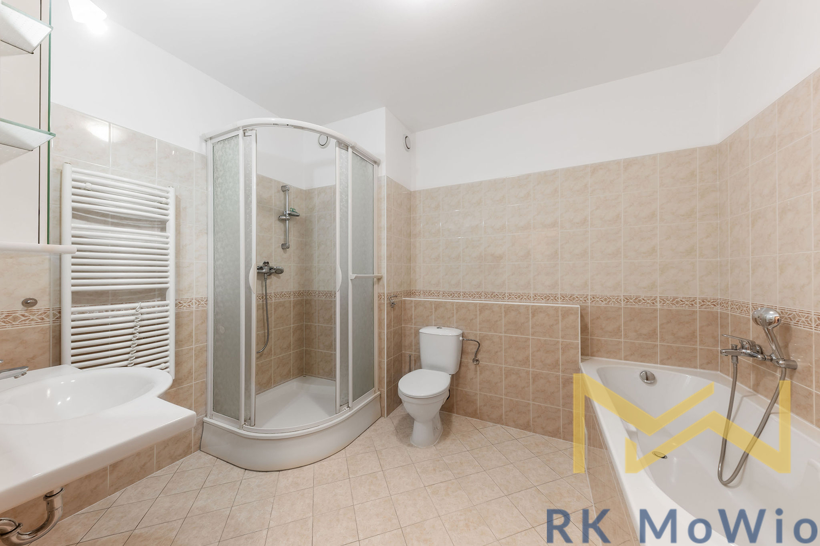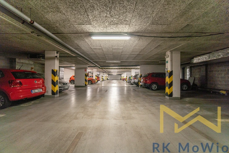 The apartment layout includes an entry hallway, a spacious living room with a kitchen and dining area, a master bedroom, two additional bedrooms, one bathroom and a balcony. The apartment is equipped with a modern kitchen, including a refrigerator with a freezer, ceramic cooktop, extractor hood, dishwasher, electric oven, microwave; built-in wardrobes, hookups for a washer and dryer, preparation for high-speed internet, wooden floors and tiles. The apartment can be rented parking garage parking space No. 45 for an extra fee of CZK 3.000,-/month. The apartment is rented unfurnished.