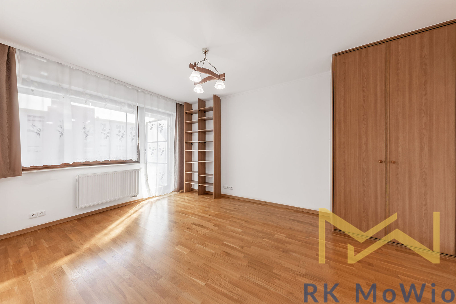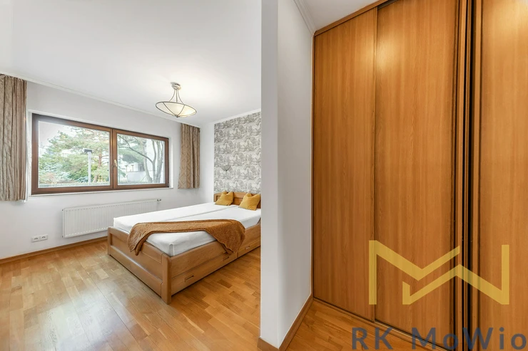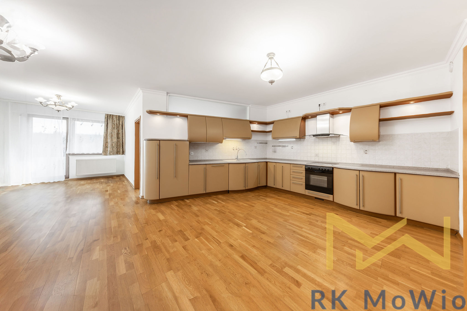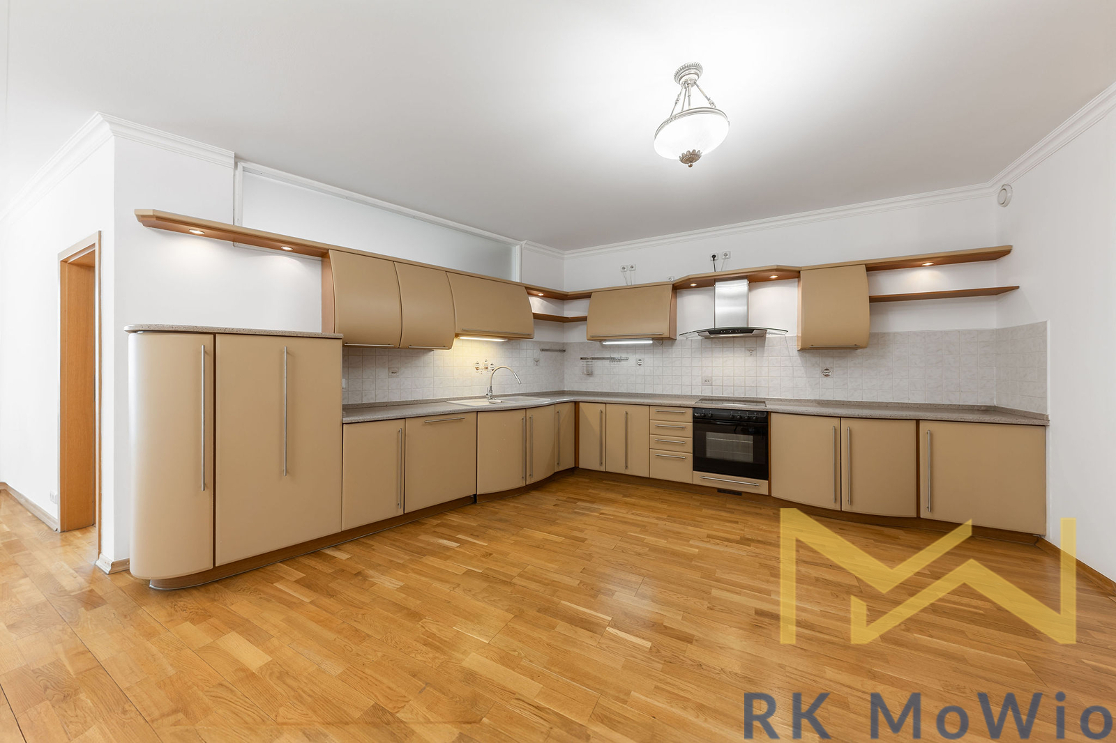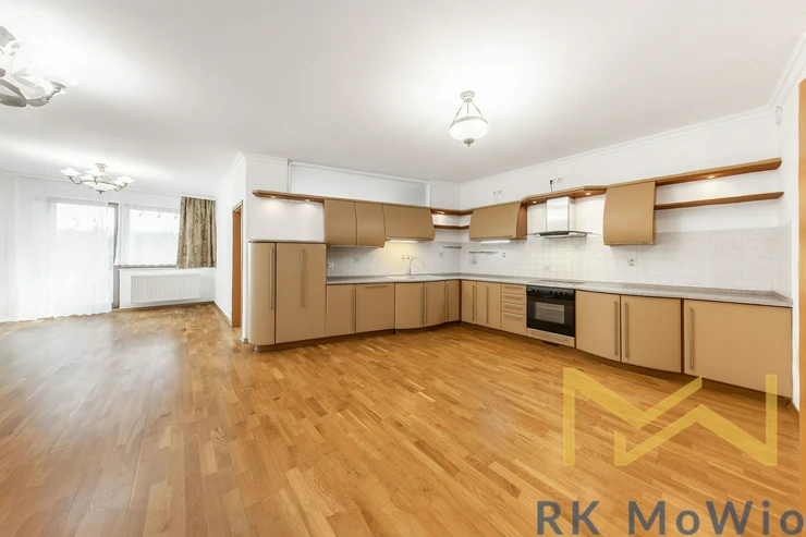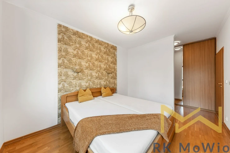 The apartment layout includes an entry hallway, a spacious living room with a kitchen and dining area, a master bedroom, two additional bedrooms, one bathroom and a balcony. The apartment is equipped with a modern kitchen, including a refrigerator with a freezer, ceramic cooktop, extractor hood, dishwasher, electric oven, microwave; built-in wardrobes, hookups for a washer and dryer, preparation for high-speed internet, wooden floors and tiles. The apartment can be rented parking garage parking space No. 45 for an extra fee of CZK 3.000,-/month. The apartment is rented unfurnished.